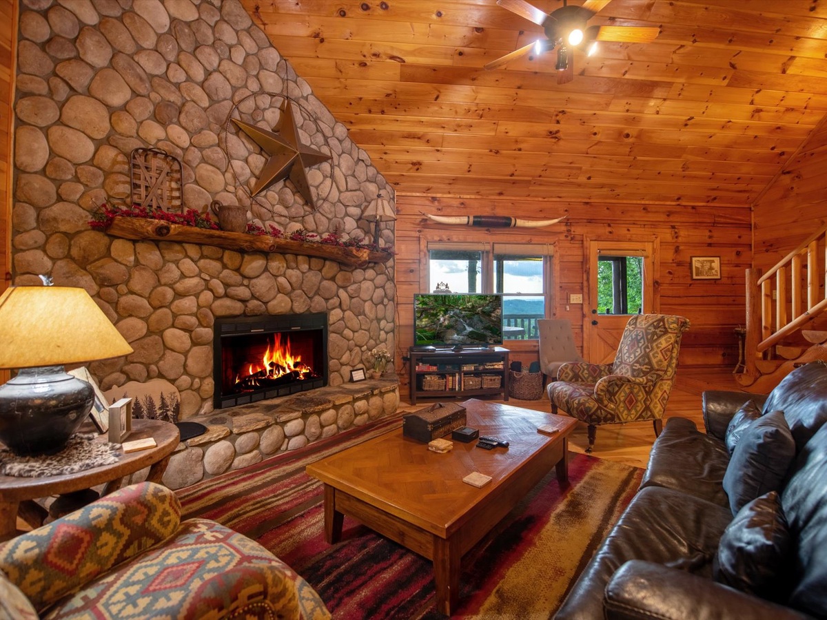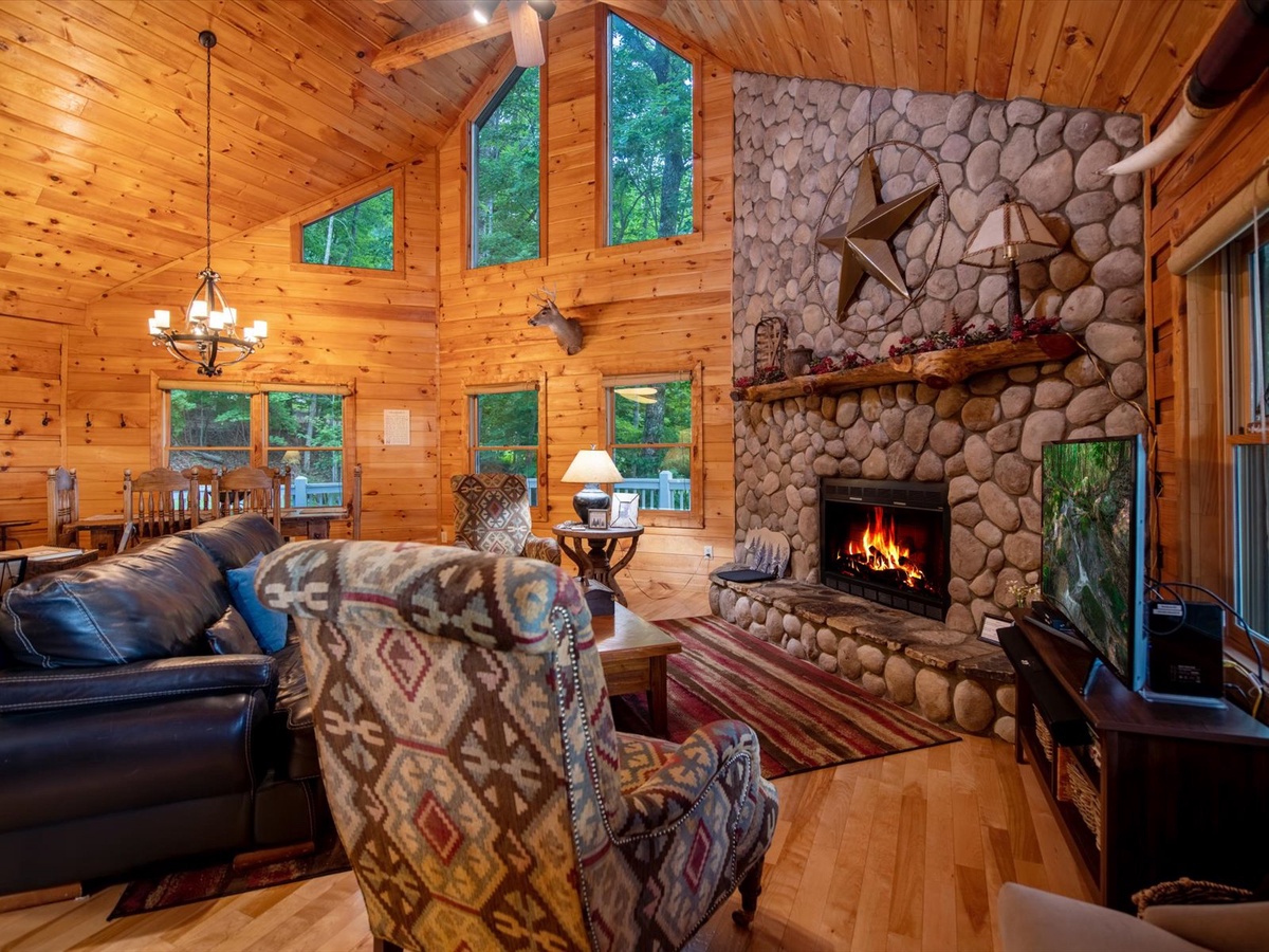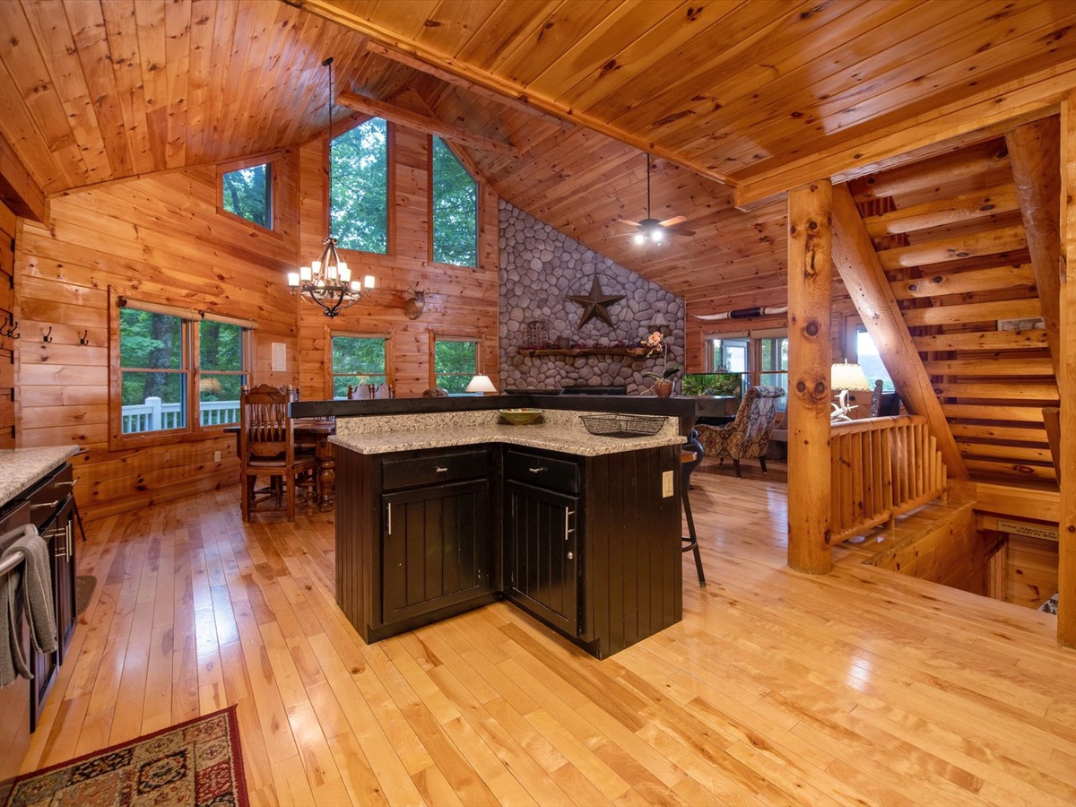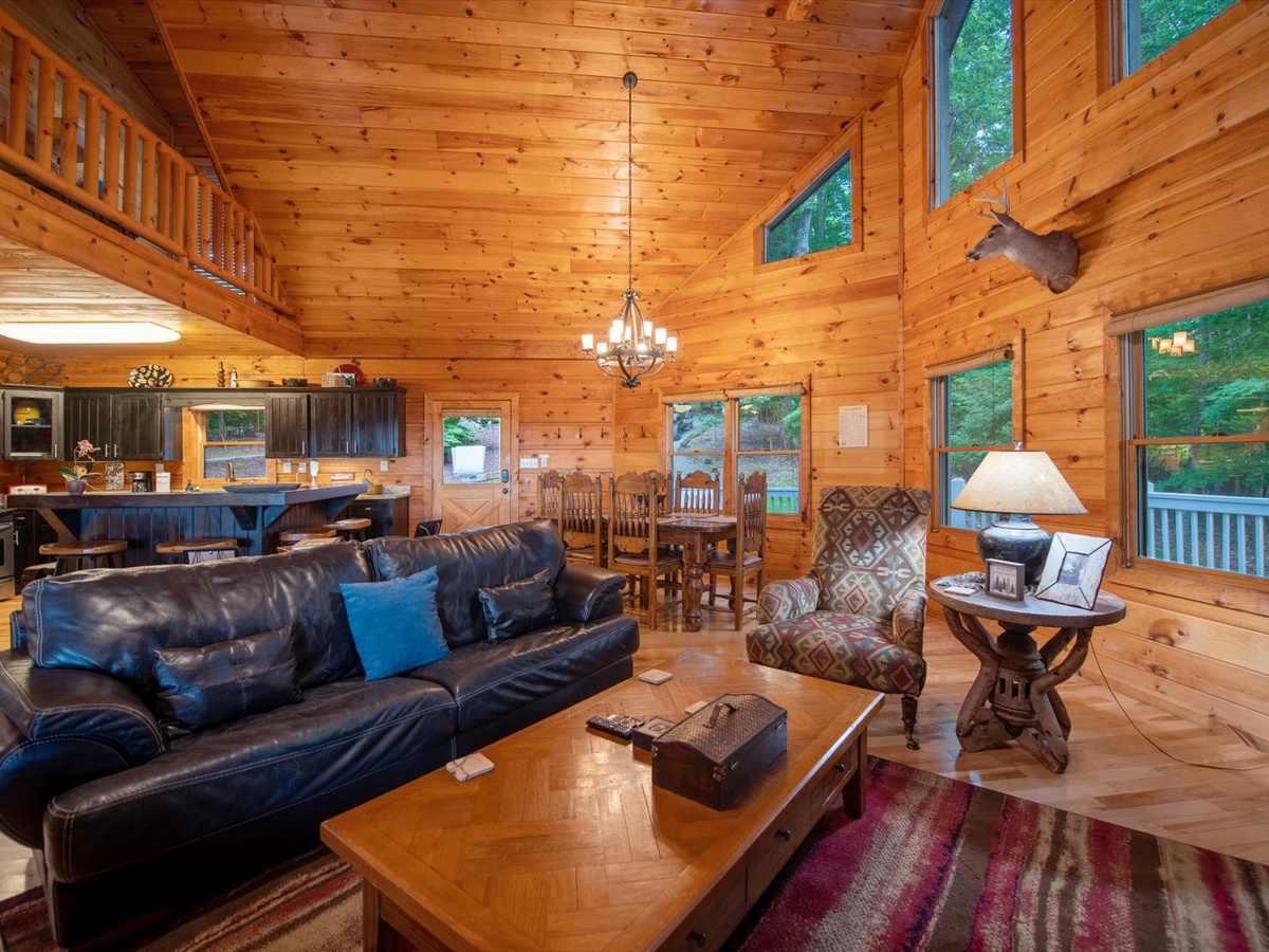 Located only 15 from downtown Blue Ridge in the Aska Adventure Area, you will feel right at home with all of the amenities. The natural lighting accents the classic wood cabin interior and river rock wall of the spacious living room. Moving into the kitchen, sharpen those knives skills and get ready to cook! Boasting a modern design, there is ample counter space and a gas range. The dining room table seats six with new benches and four at the kitchen island.