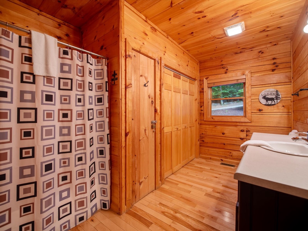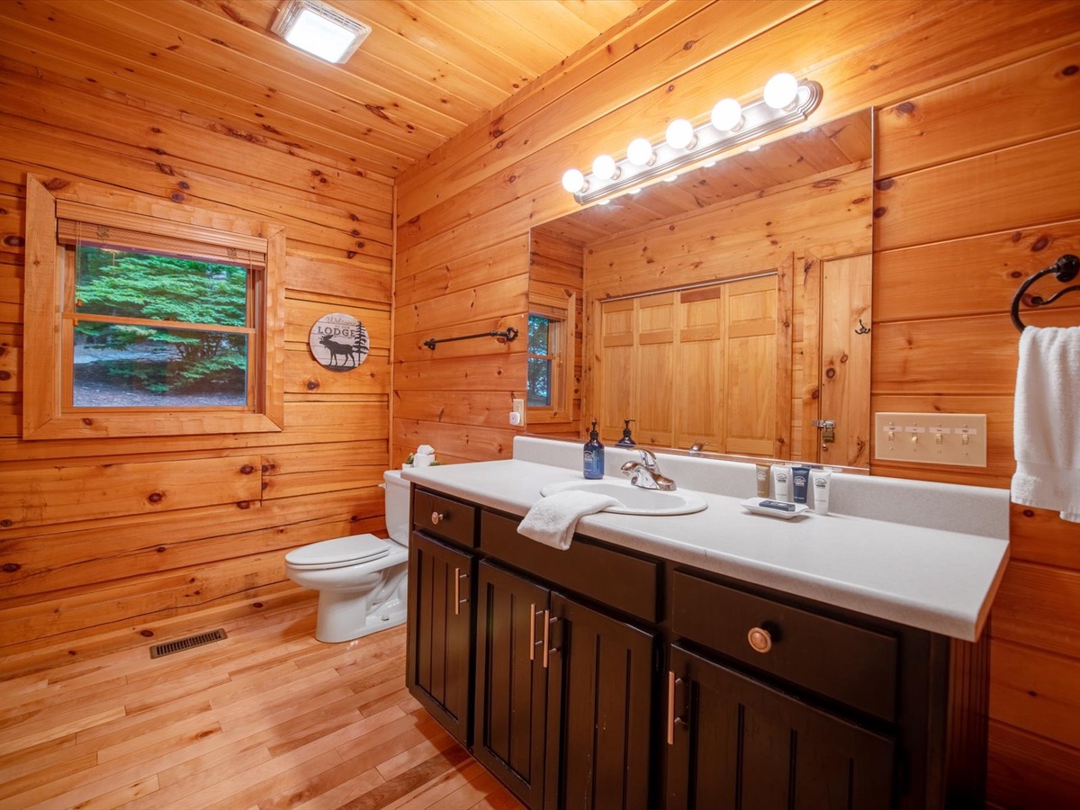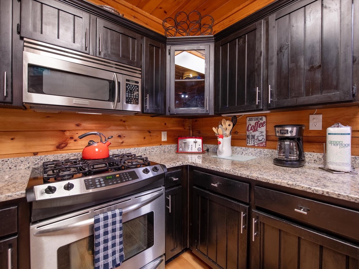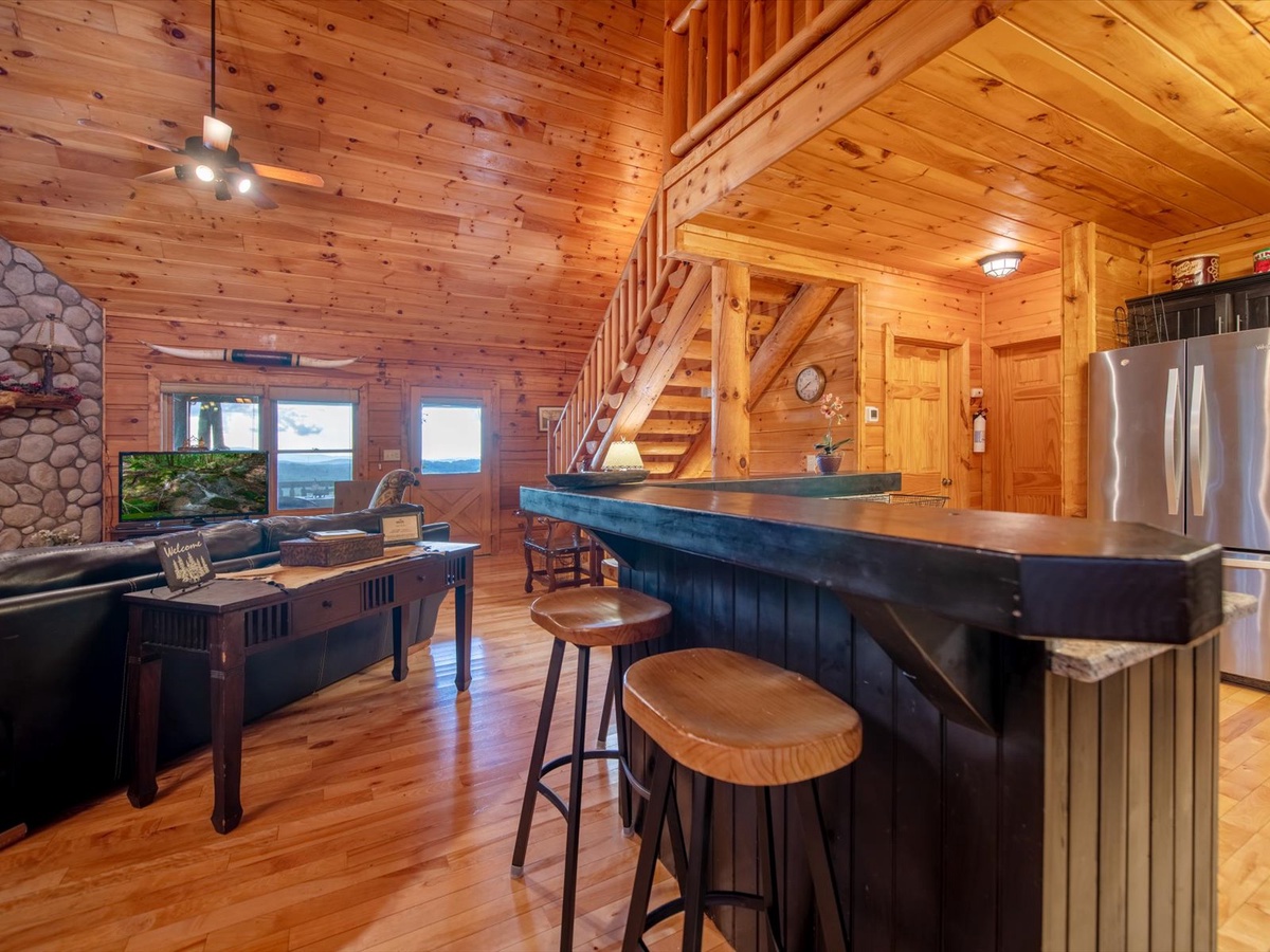 Located only 15 from downtown Blue Ridge in the Aska Adventure Area, you will feel right at home with all of the amenities. The natural lighting accents the classic wood cabin interior and river rock wall of the spacious living room. Moving into the kitchen, sharpen those knives skills and get ready to cook! Boasting a modern design, there is ample counter space and a gas range. The dining room table seats six with new benches and four at the kitchen island.