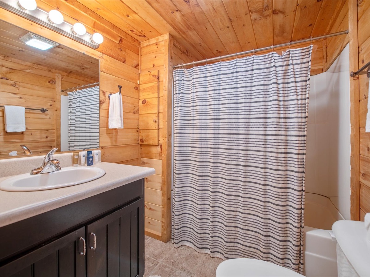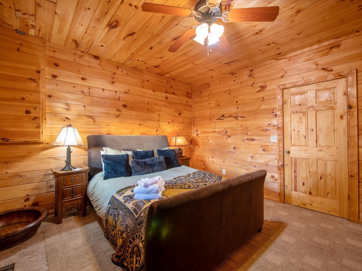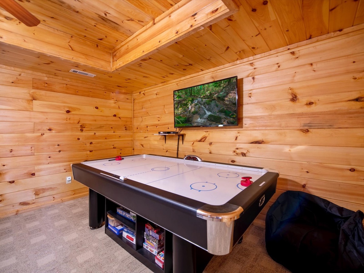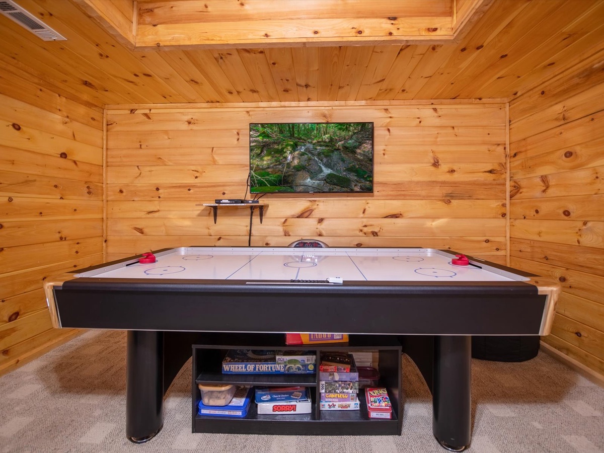 Another highlight of Aska Bliss is that three of the four bedrooms have queen-sized beds, one of which is located on the main entry level. Head upstairs to find the master suite with a king size bed and an amazing private balcony offering a bird’s eye view of the mountains! Down on the lower level, the remaining two bedrooms are next to the den. The den is a great spot to watch a movie, play games and air hockey!