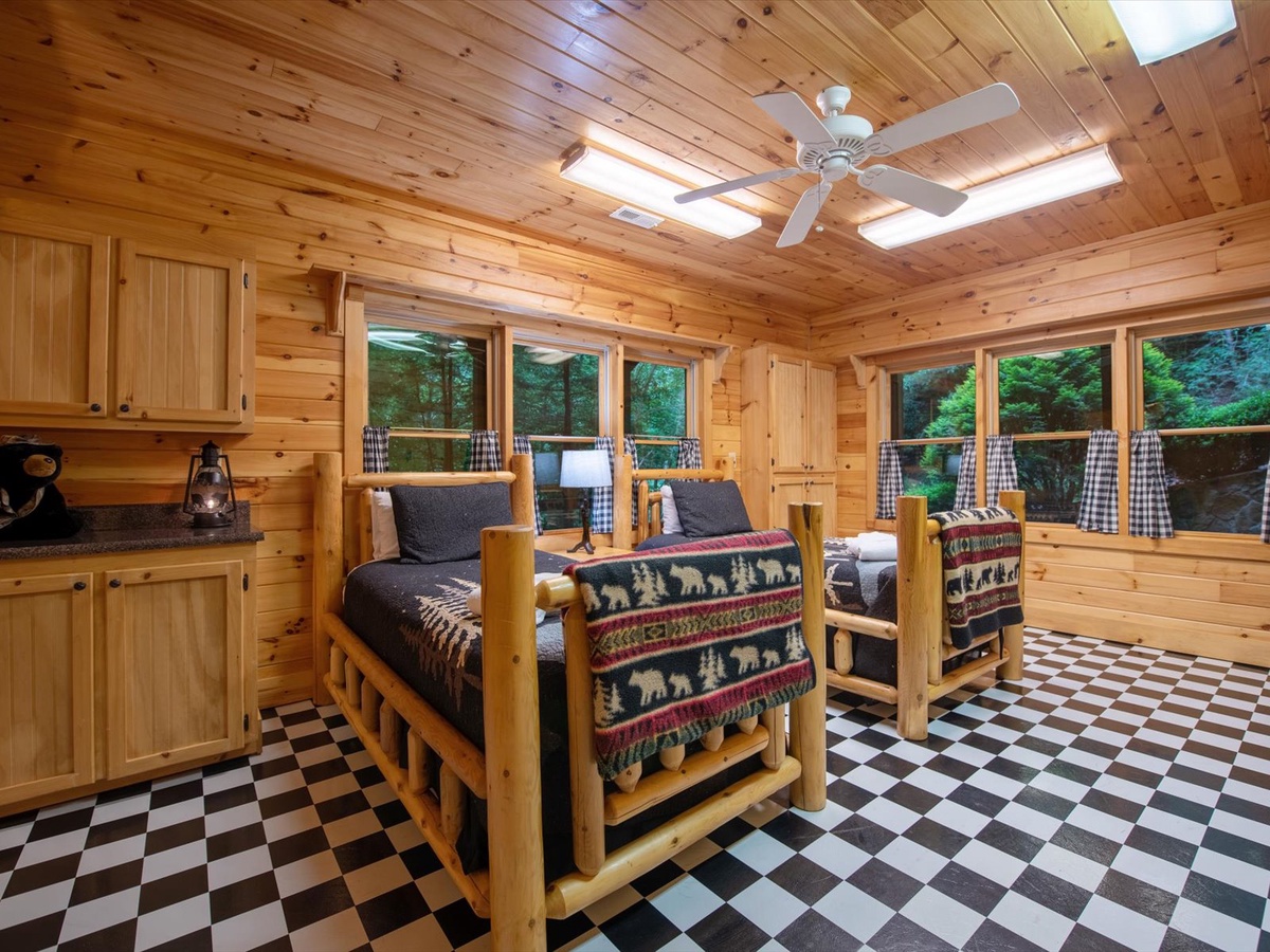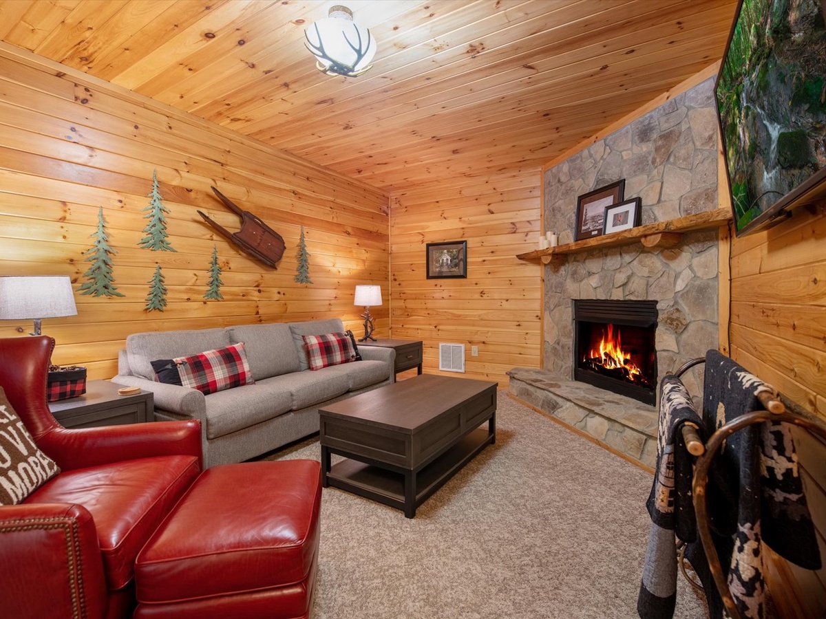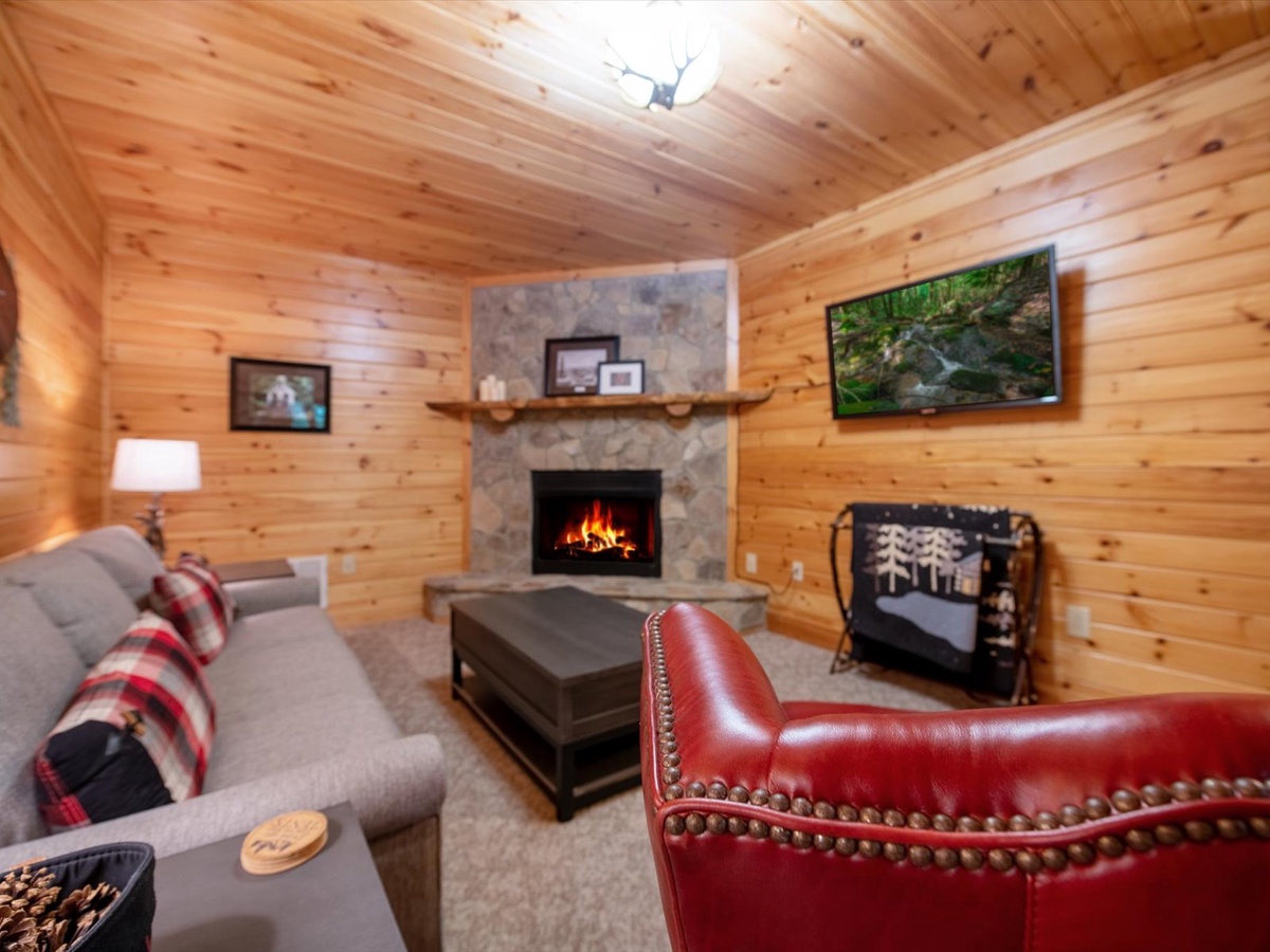 Upon entering Babbling Brook, you'll notice that you have picked the most spacious and comfortable cabin in the area. The fully equipped kitchen has everything you need to prepare a feast fit for a queen. Enjoy this meal in the adjacent and roomy dining area. The entry level offers a primary king bedroom with a private bathroom, while the lower level offers a queen bedroom with a private bathroom. Also found on the lower level is a bedroom with 2 twins and a small den with a gas fireplace, perfectly cozy for snuggling up with a book before crawling into bed.