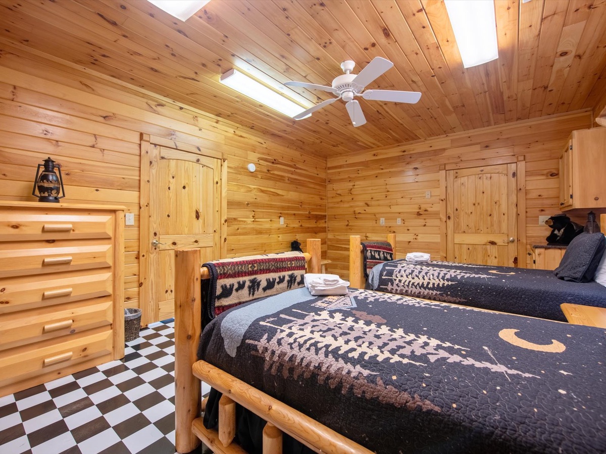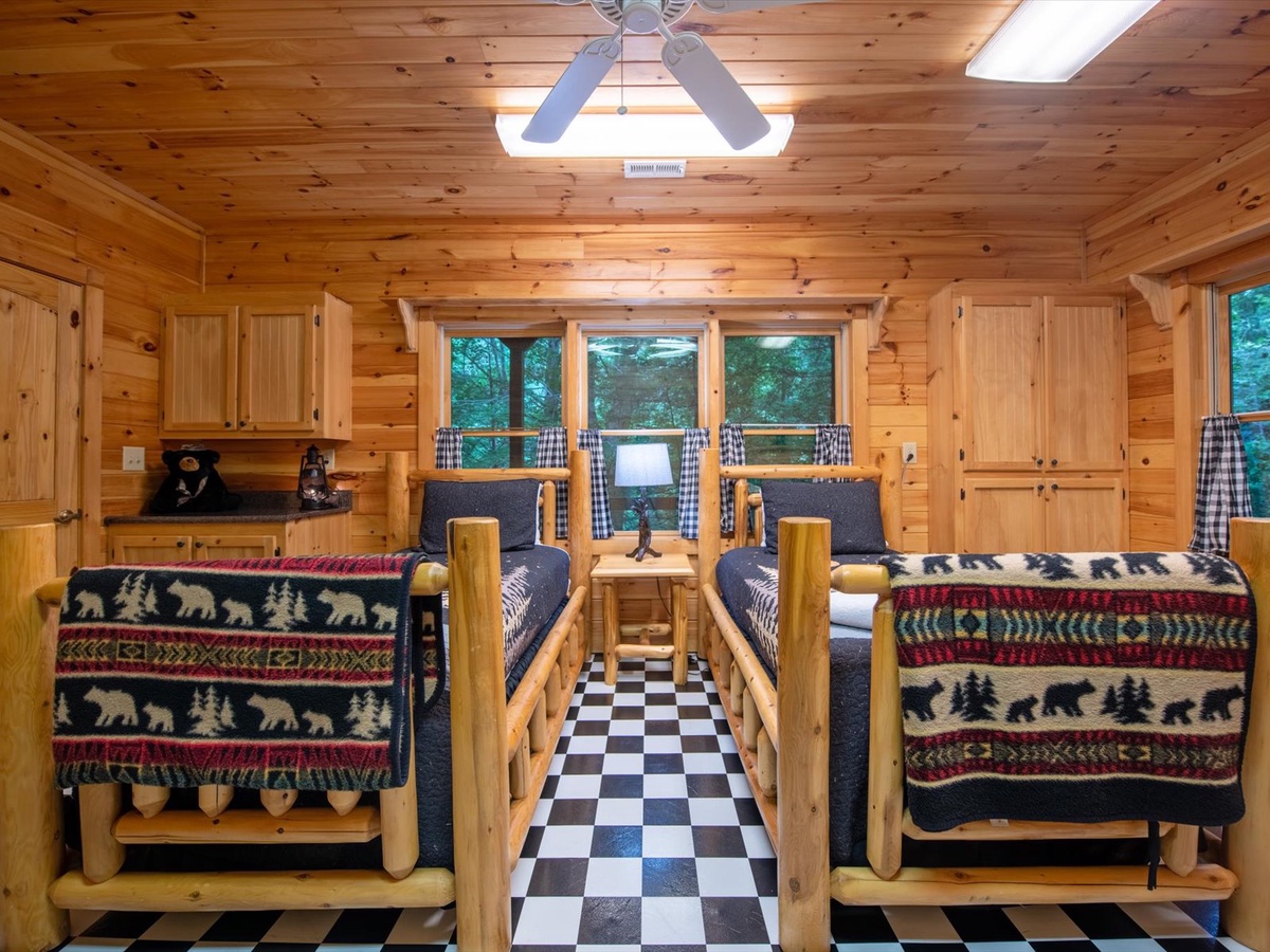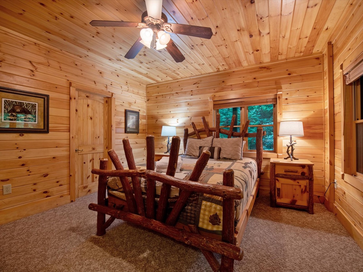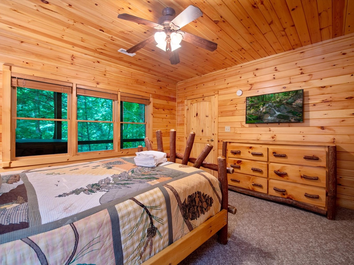 Upon entering Babbling Brook, you'll notice that you have picked the most spacious and comfortable cabin in the area. The fully equipped kitchen has everything you need to prepare a feast fit for a queen. Enjoy this meal in the adjacent and roomy dining area. The entry level offers a primary king bedroom with a private bathroom, while the lower level offers a queen bedroom with a private bathroom. Also found on the lower level is a bedroom with 2 twins and a small den with a gas fireplace, perfectly cozy for snuggling up with a book before crawling into bed.