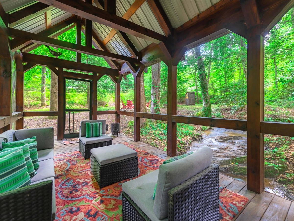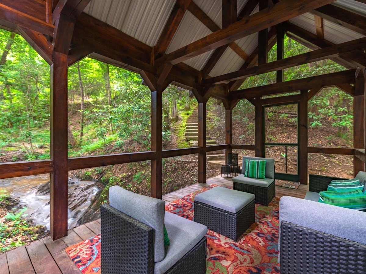 • Screened shelter over brook with sofa seating 2-3 and 2 chairs