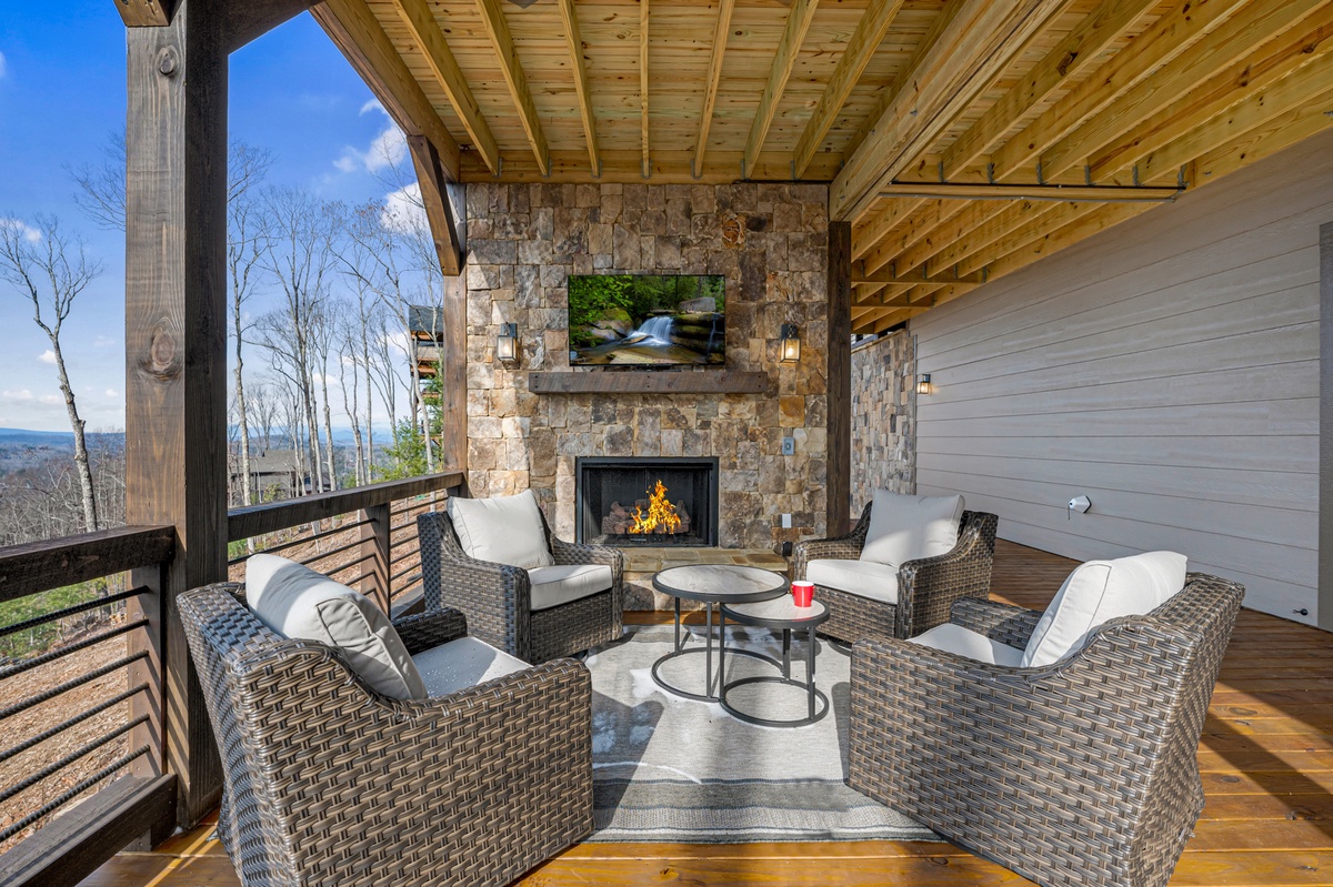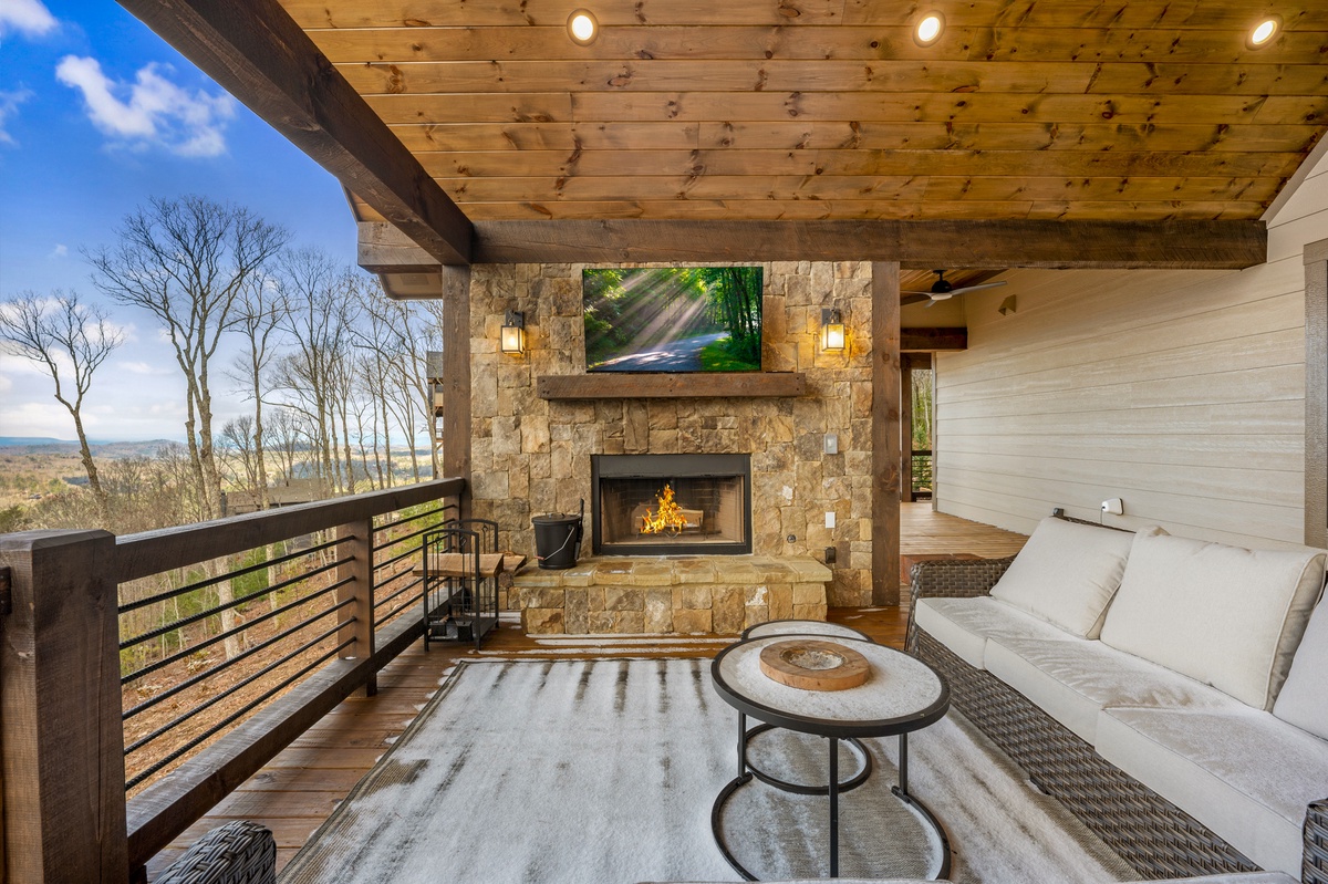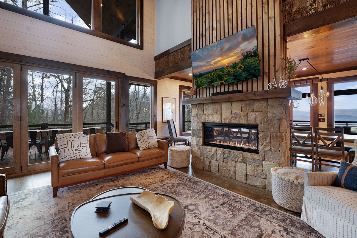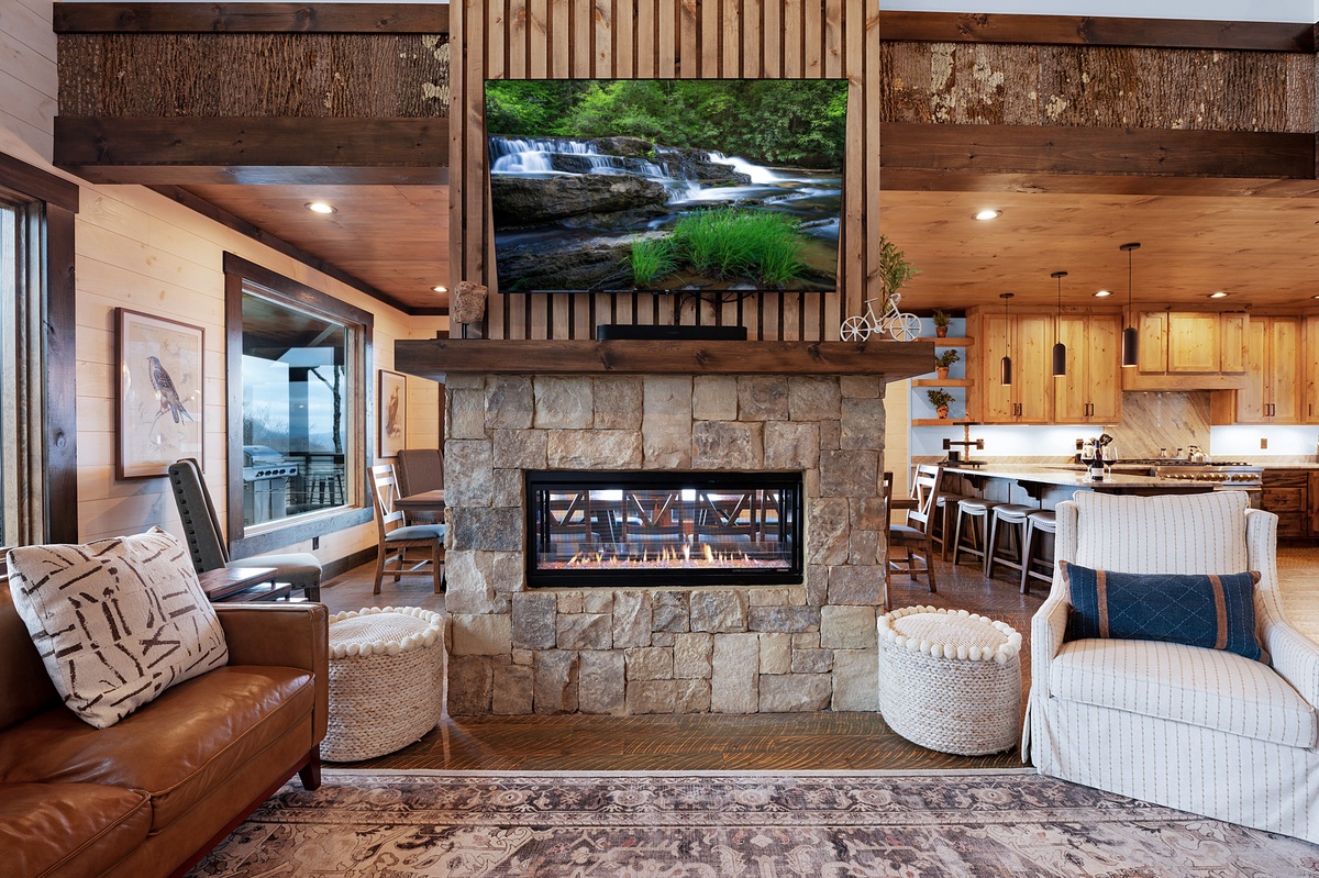- Wood burning fireplace and 55” TV