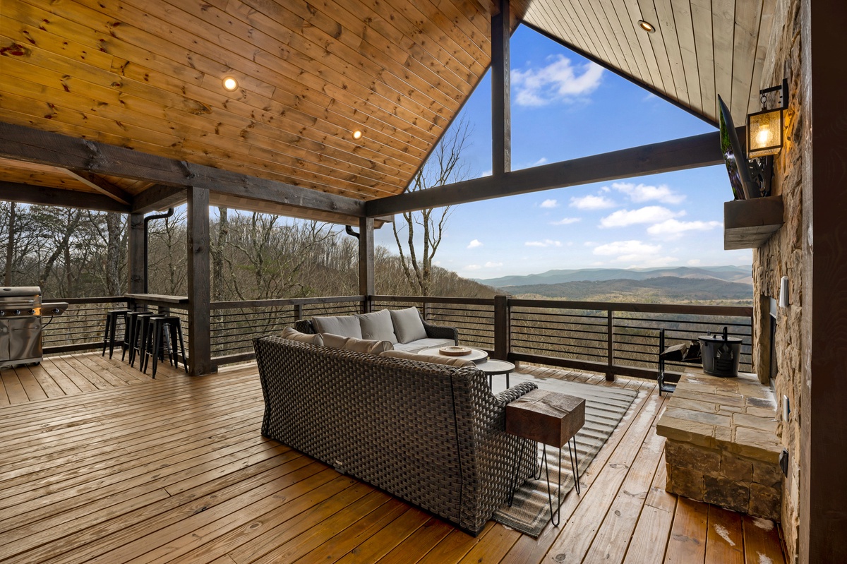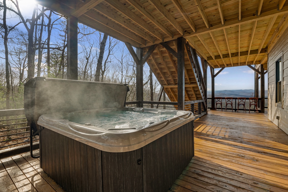 If a quieter ending to your day is desired, the lower level deck features a gas fireplace while the entry-level deck features a gas fireplace. Both decks provide seating, creating inviting spaces to bask in the beauty of nature. The covered steaming hot tub awaits, offering a tranquil escape beneath the starlit sky, creating moments of relaxation and joy. And for those wanting even quieter moments, retreat to the upper level king bedroom suites, each with its own private balcony, providing breathtaking views of the surrounding mountains.