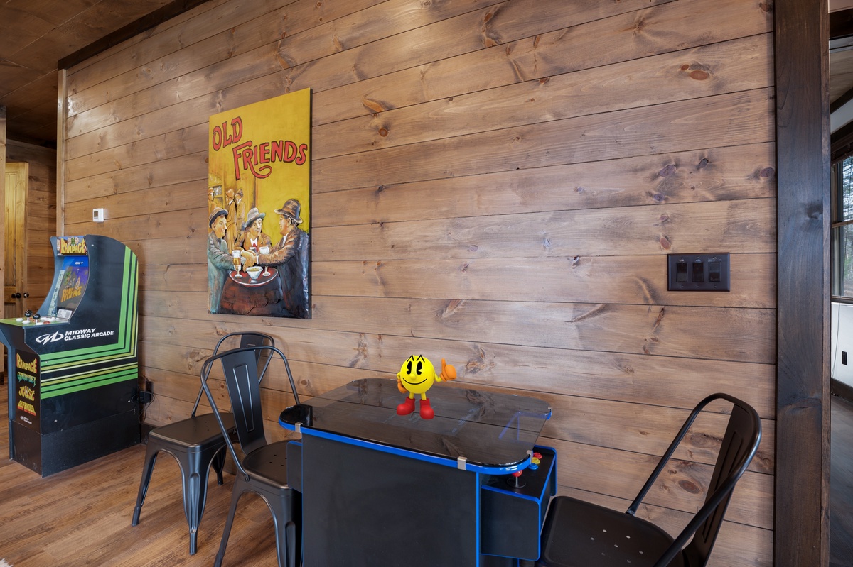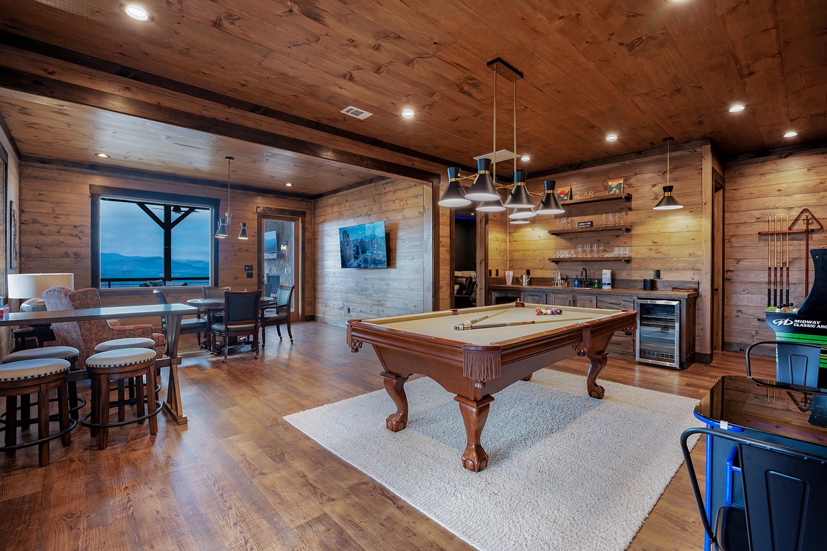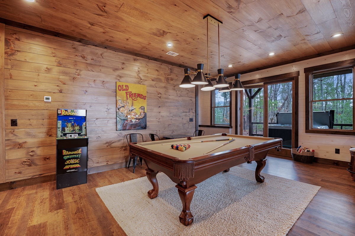 - Pool table, two arcade games, poker table, game table seating 4 with board games