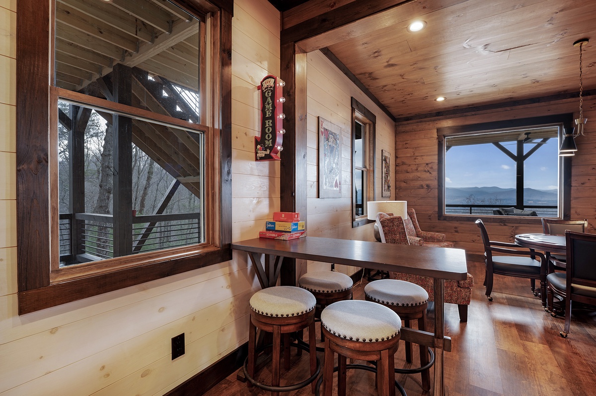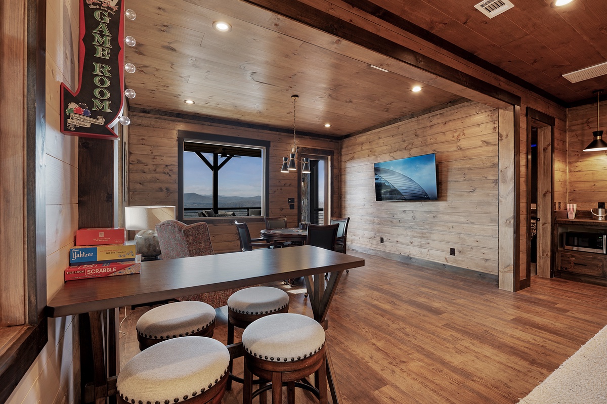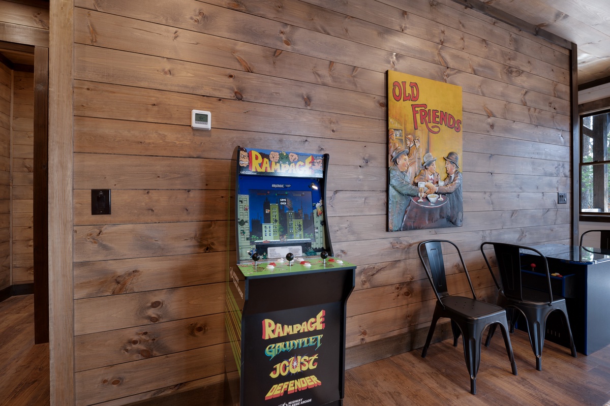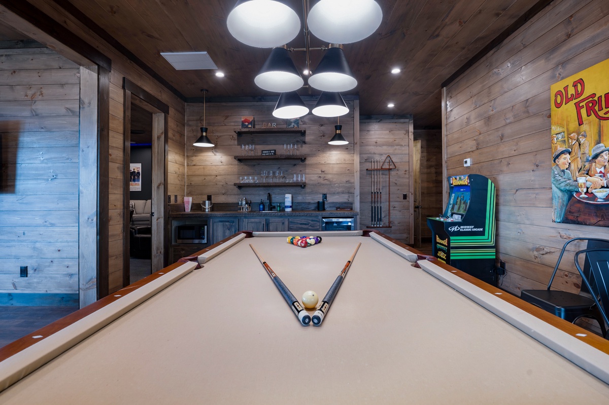- Pool table, two arcade games, poker table, game table seating 4 with board games