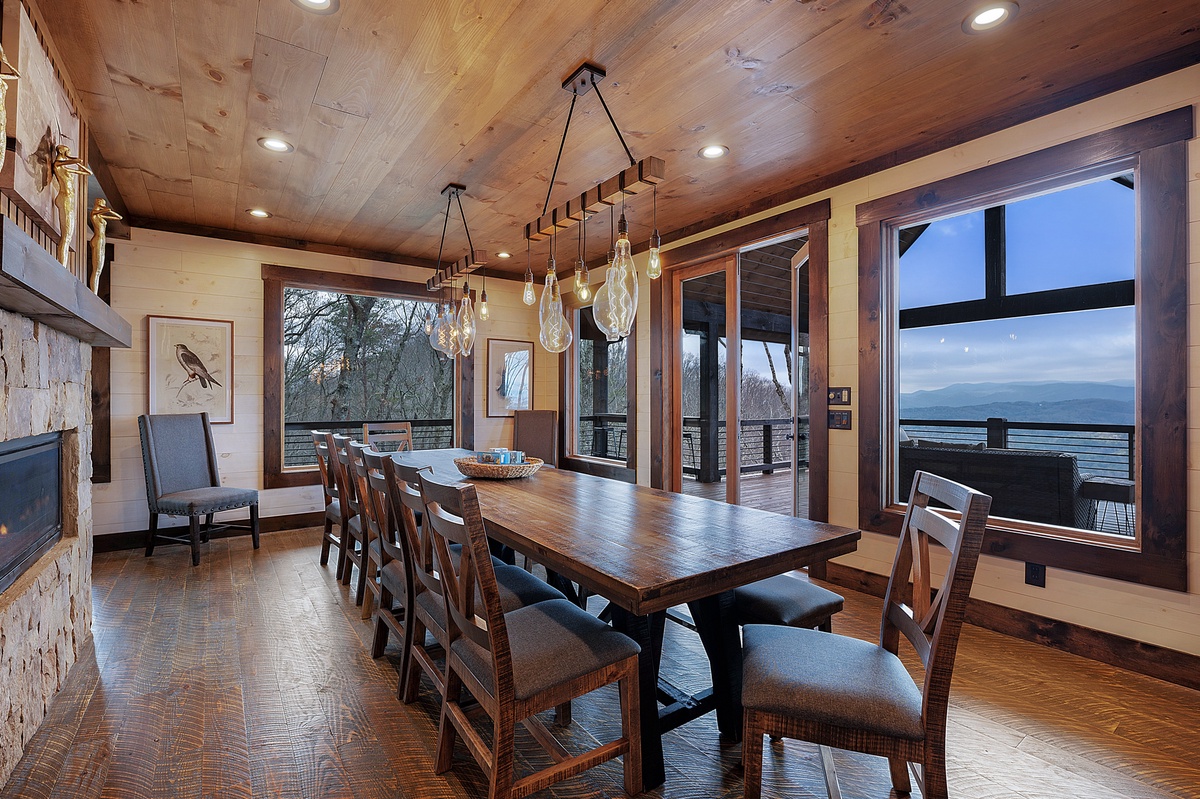 Warmth and ambiance abound with our artisan see-through gas fireplace, adorned with multi-colored LED lights to set the perfect mood. Culinary enthusiasts will delight in our 6-gas burner stove top with griddle and double oven, allowing for the creation of culinary masterpieces. Whether you eat inside around the dining table with its beautiful views or dine al fresco at our huge outdoor table that seats 12, both will foster a sense of connection over shared meals that will be remembered for days to come.