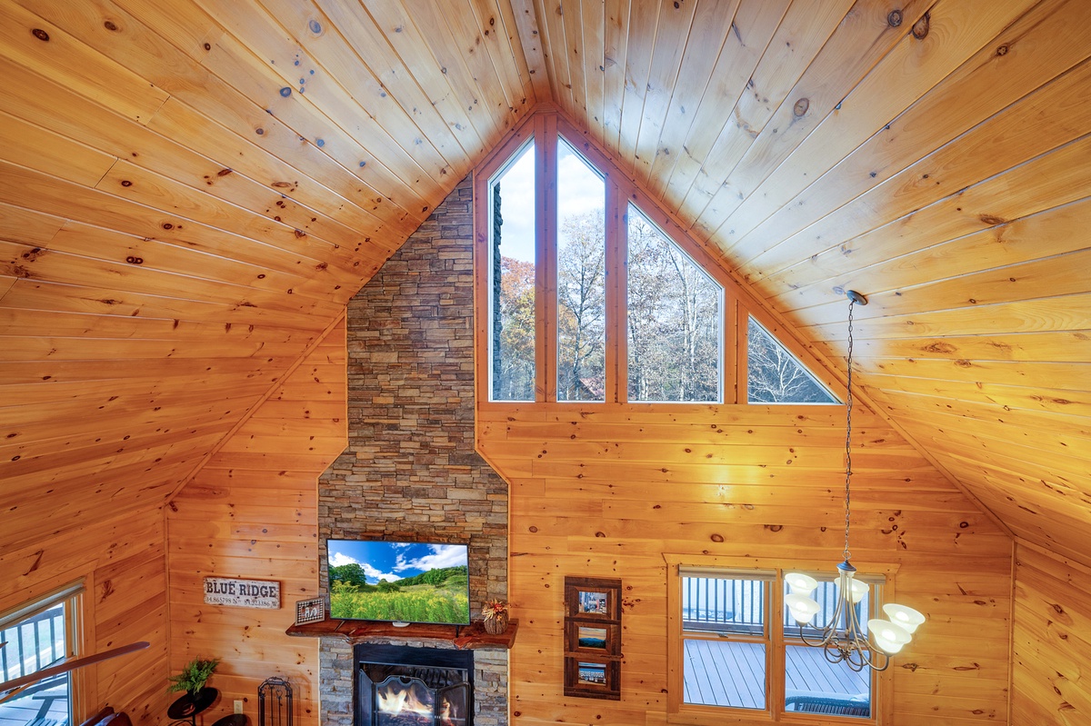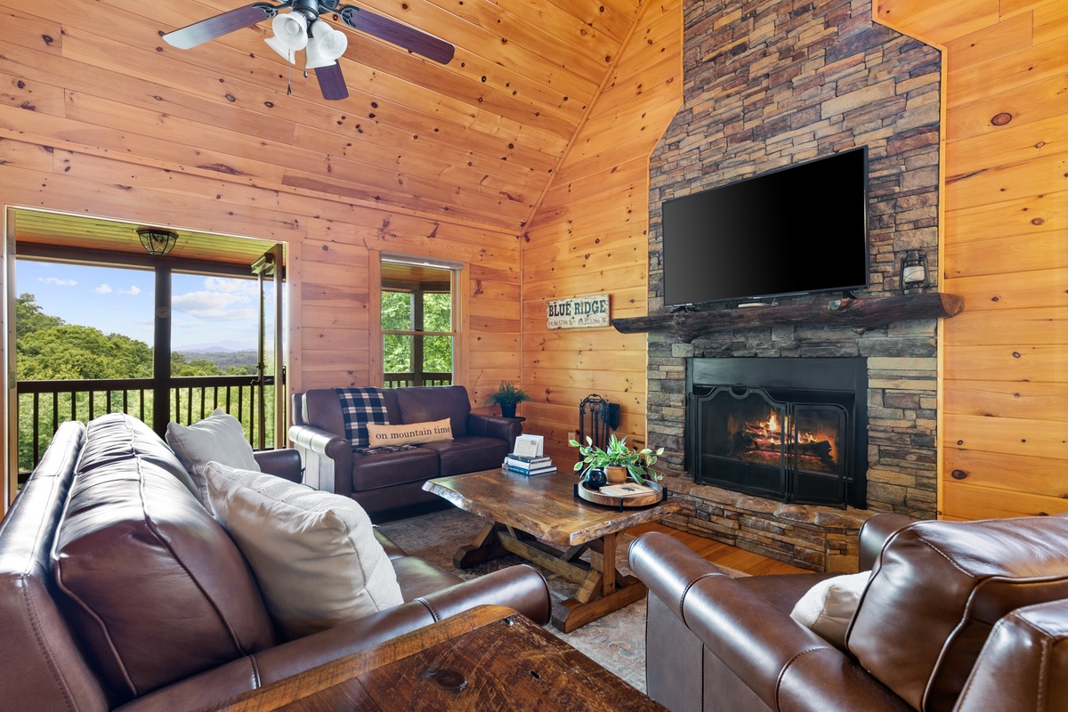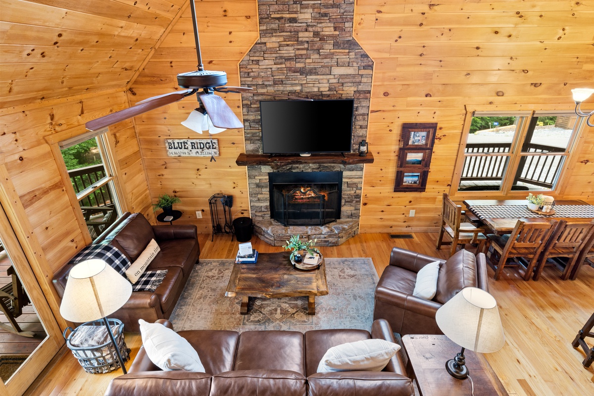 - Living room with stone laid wood burning fireplace and 55” Smart TV