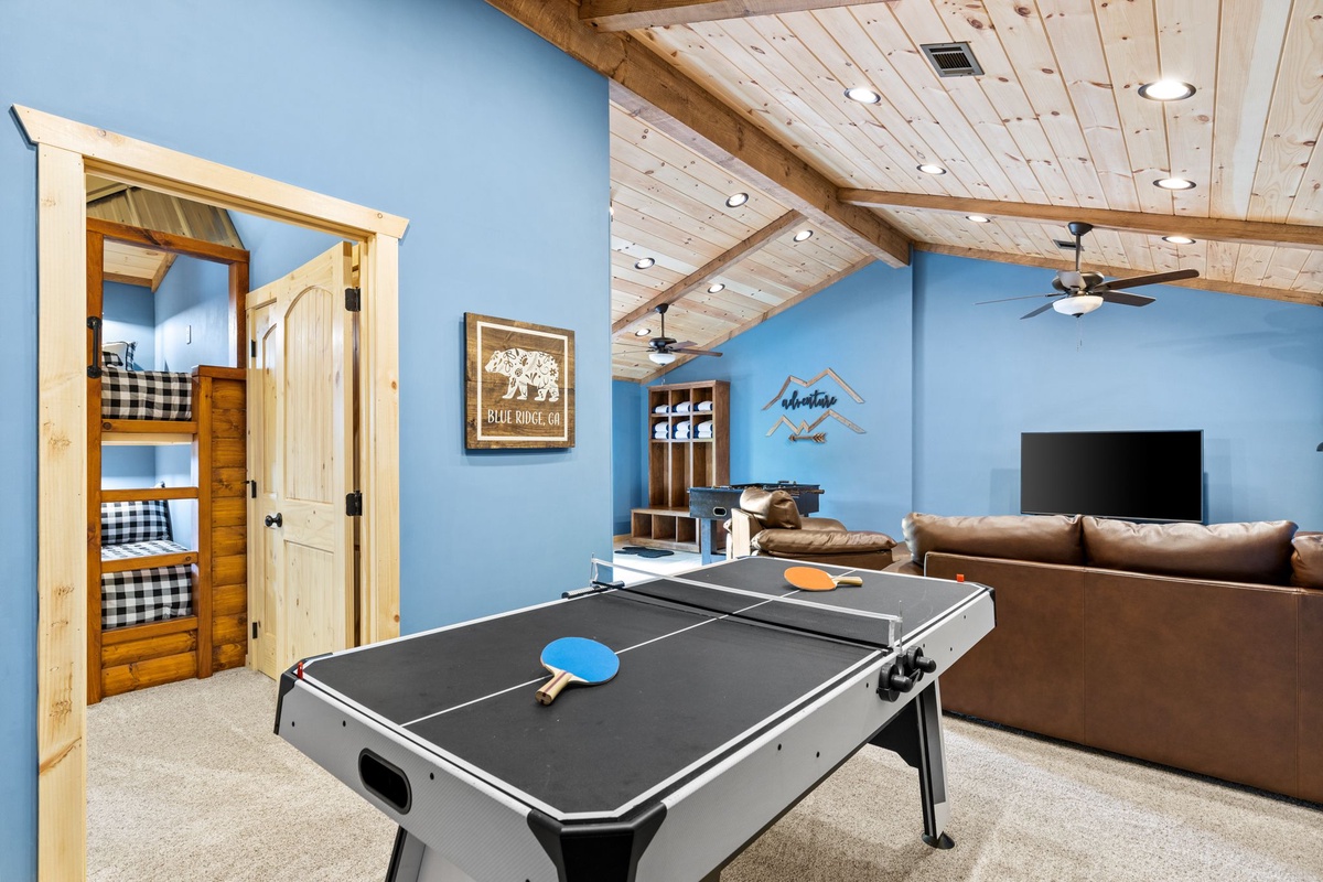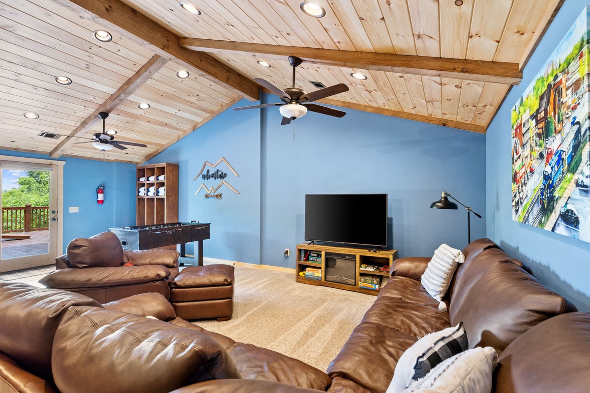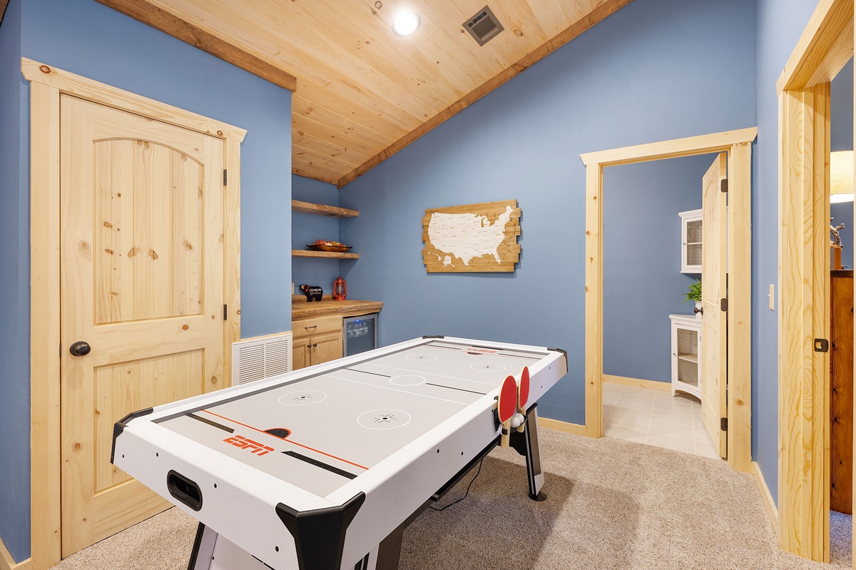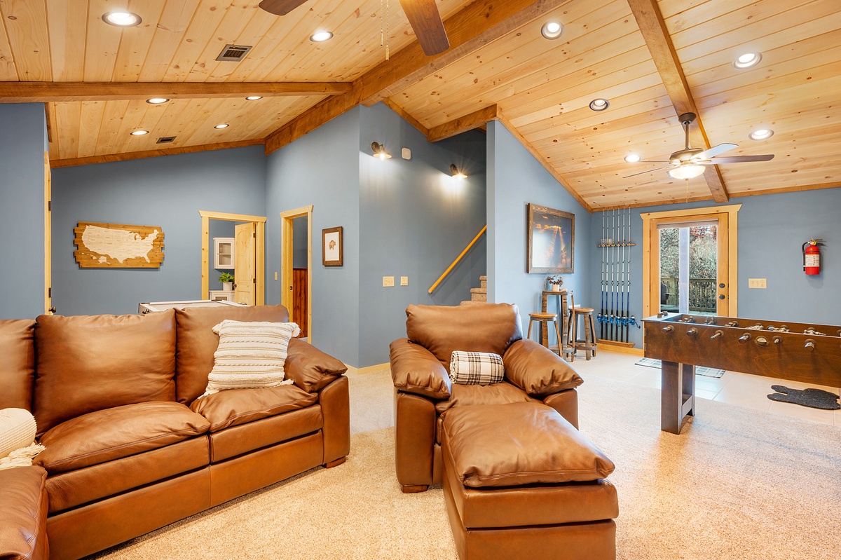 For the gamers in the group, the lower-level living area with cathedral ceilings is waiting for you with its foosball, air hockey and ping pong table. Those who like to be spectators, there is plenty of seating available to cheer on your favorite player or simply turn on the 55”TV to root for your favorite team.