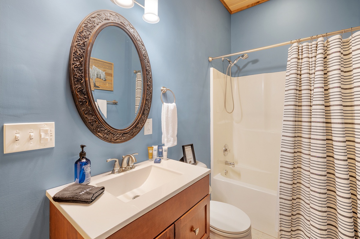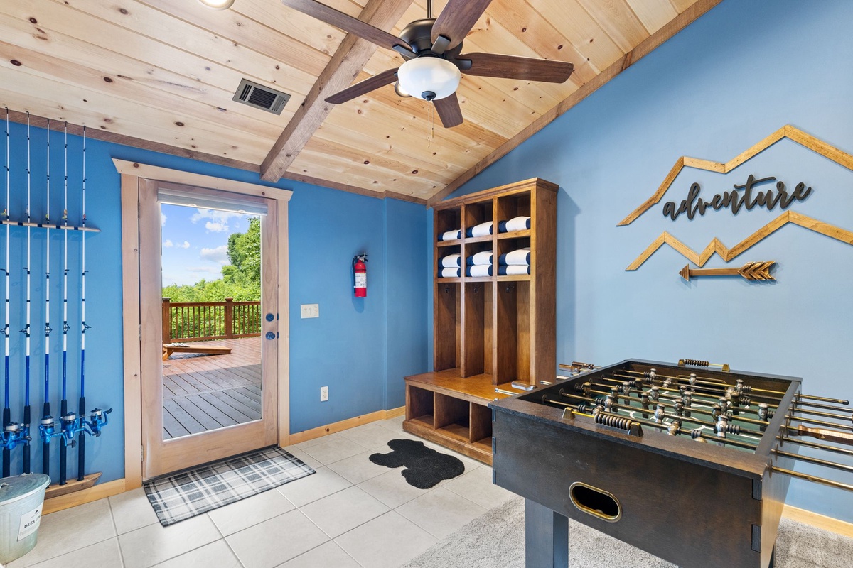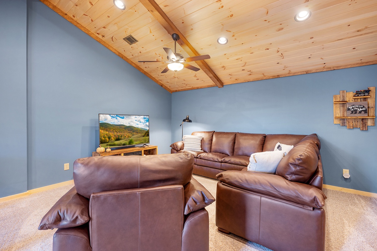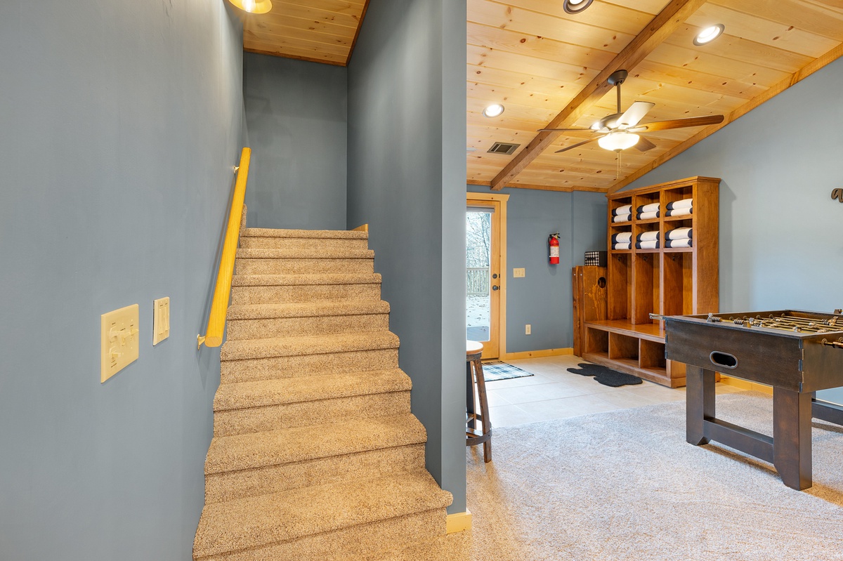 For the gamers in the group, the lower-level living area with cathedral ceilings is waiting for you with its foosball, air hockey and ping pong table. Those who like to be spectators, there is plenty of seating available to cheer on your favorite player or simply turn on the 55”TV to root for your favorite team.
