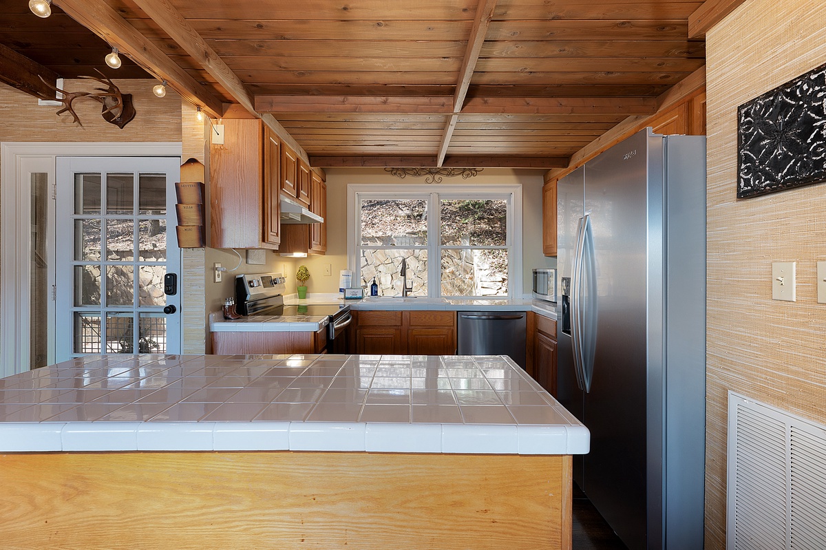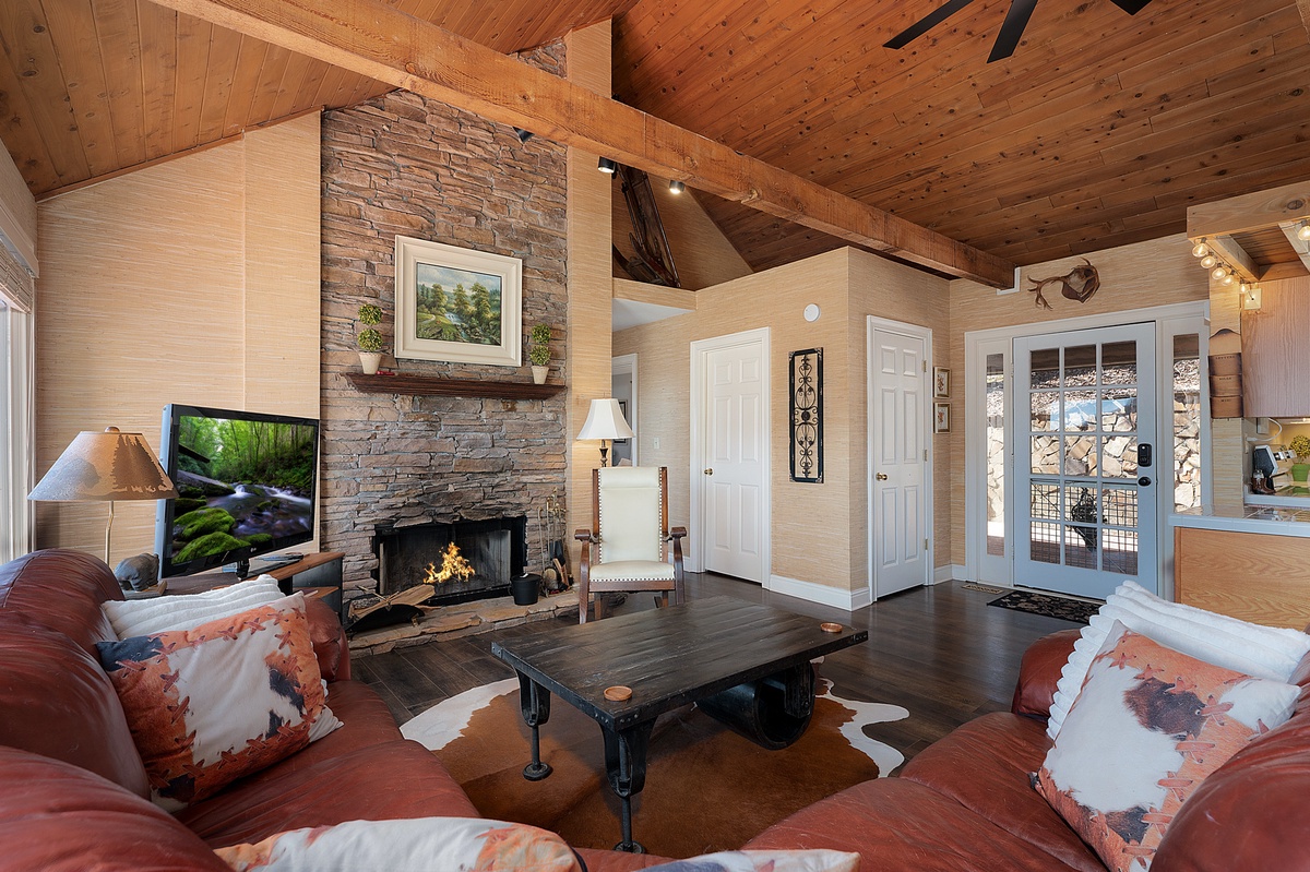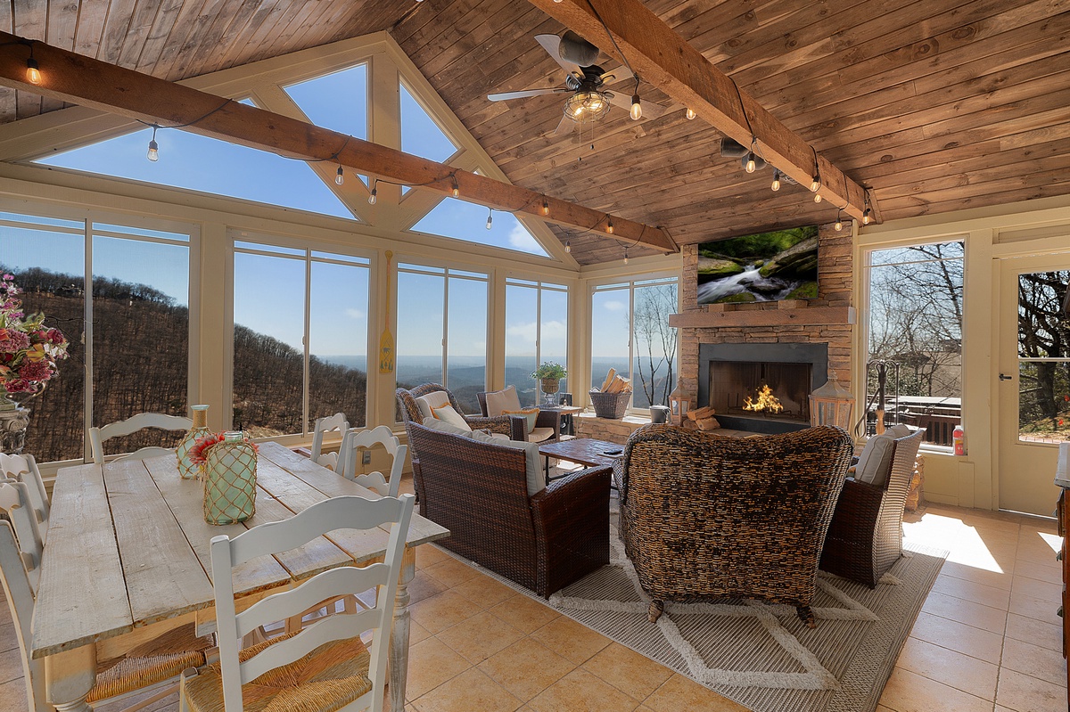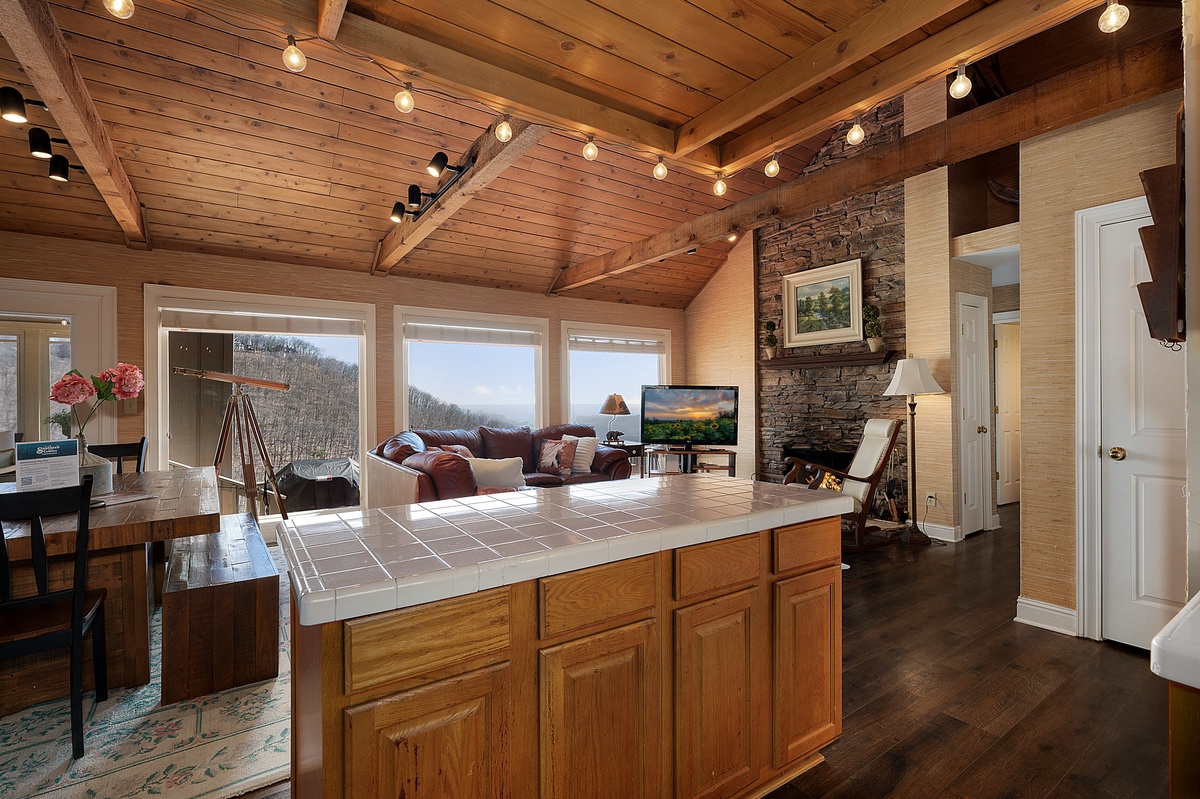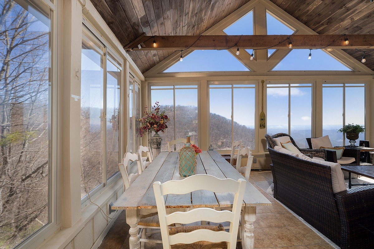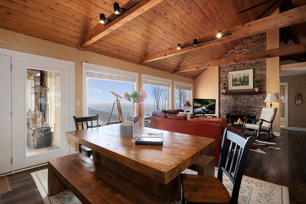Breathe in the mountain air with a warm cup of coffee while watching the sunrise on a brand-new day. Cozy up by the fireplace in the sunroom or step out onto the open deck space with tables fit for the whole group to enjoy a traditional family meal. The fully equipped kitchen offers stainless steel appliances, and an island perfect for preparing any meal.