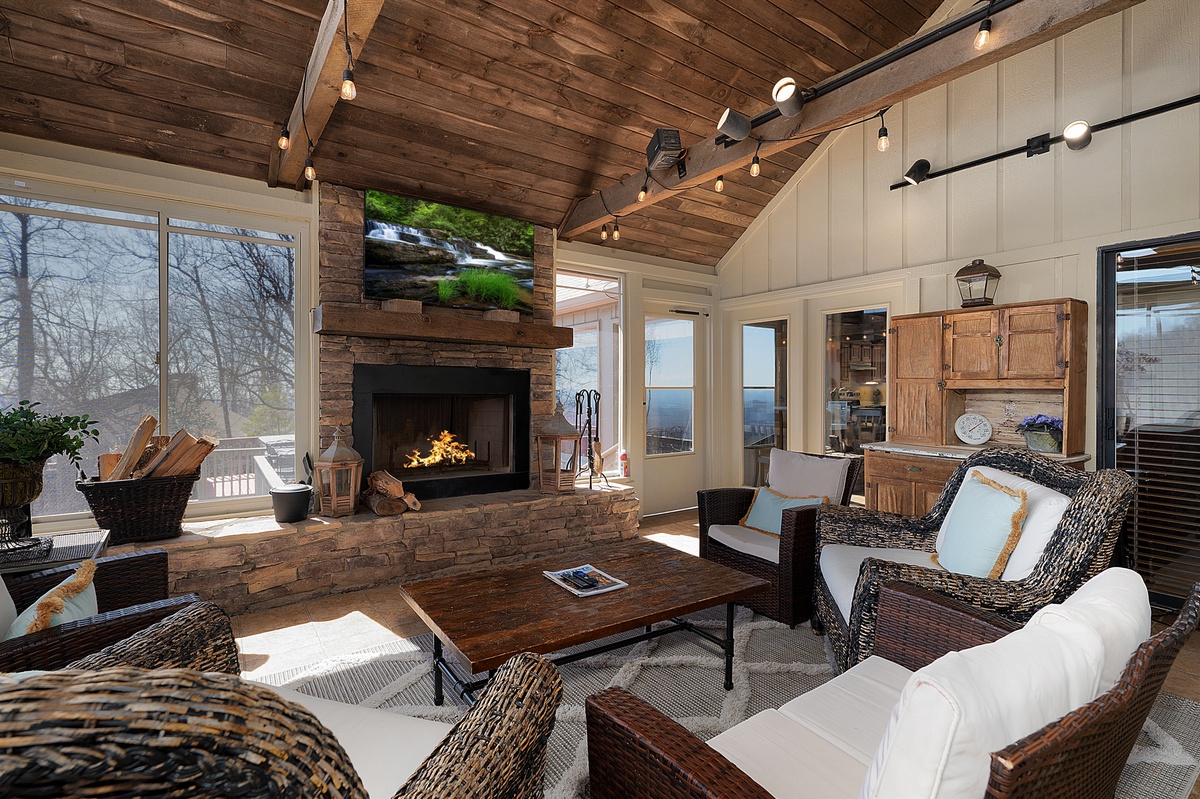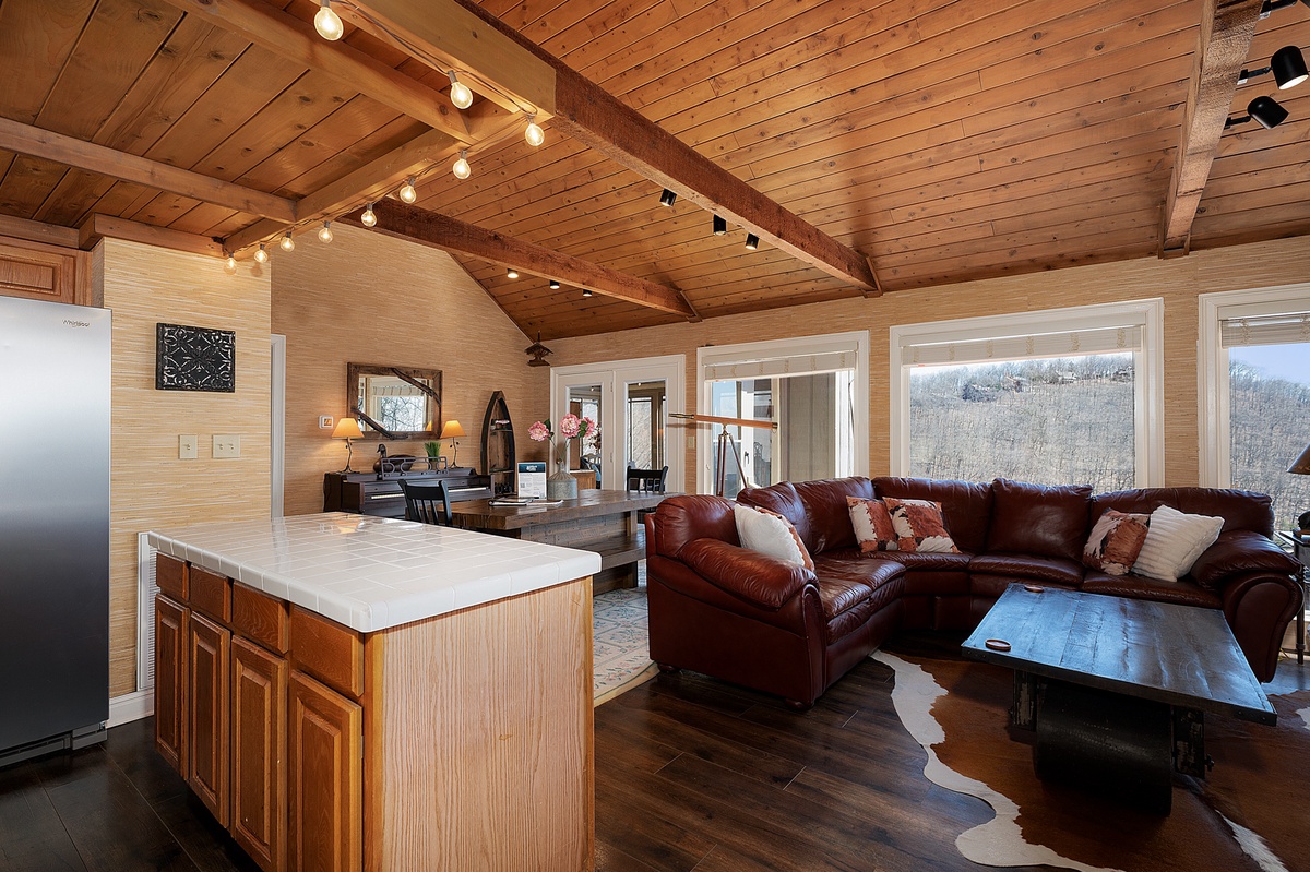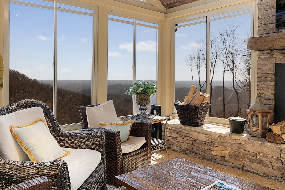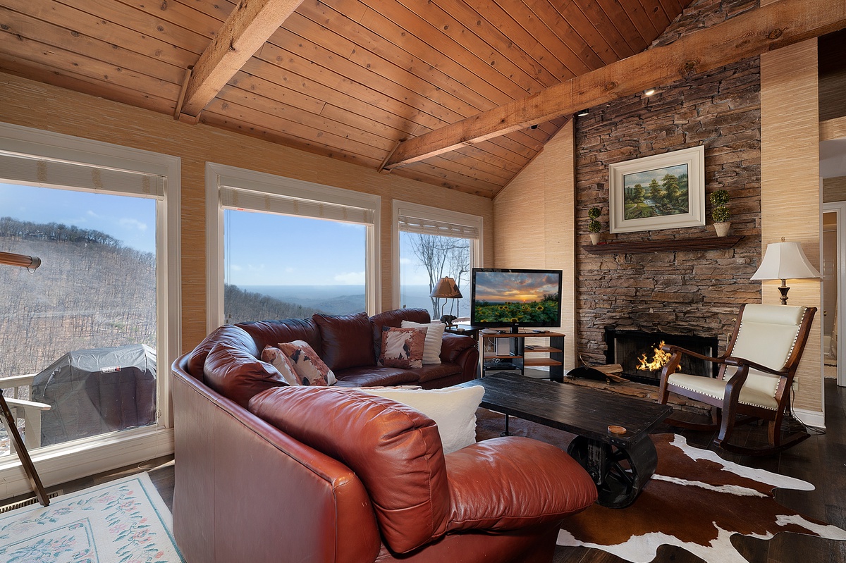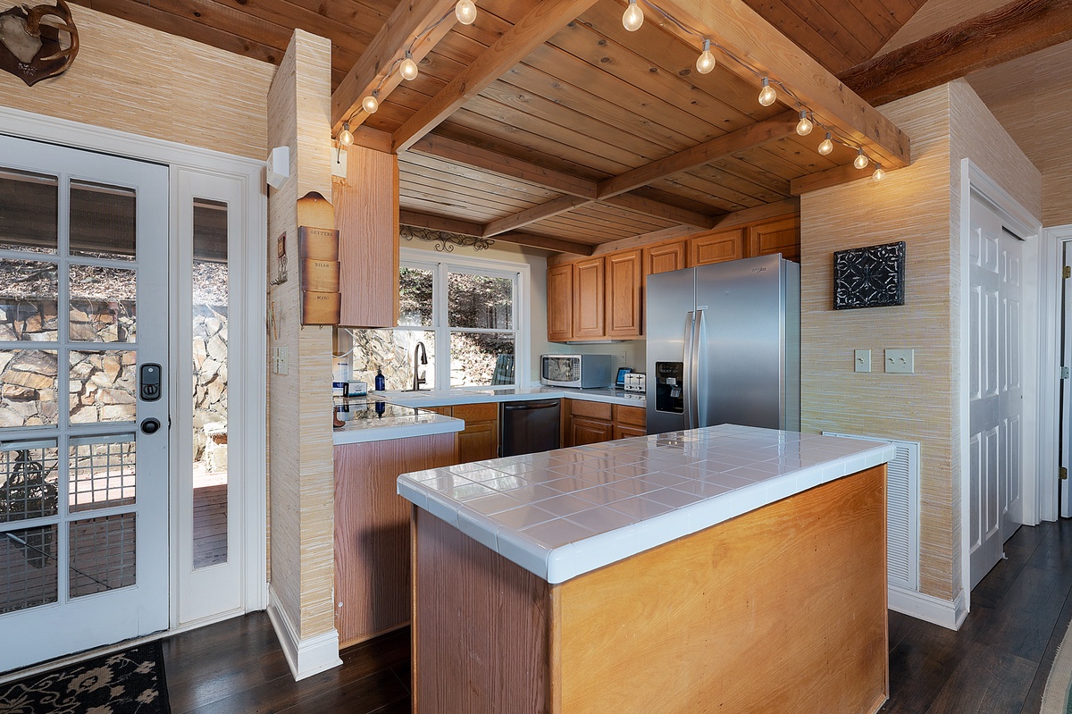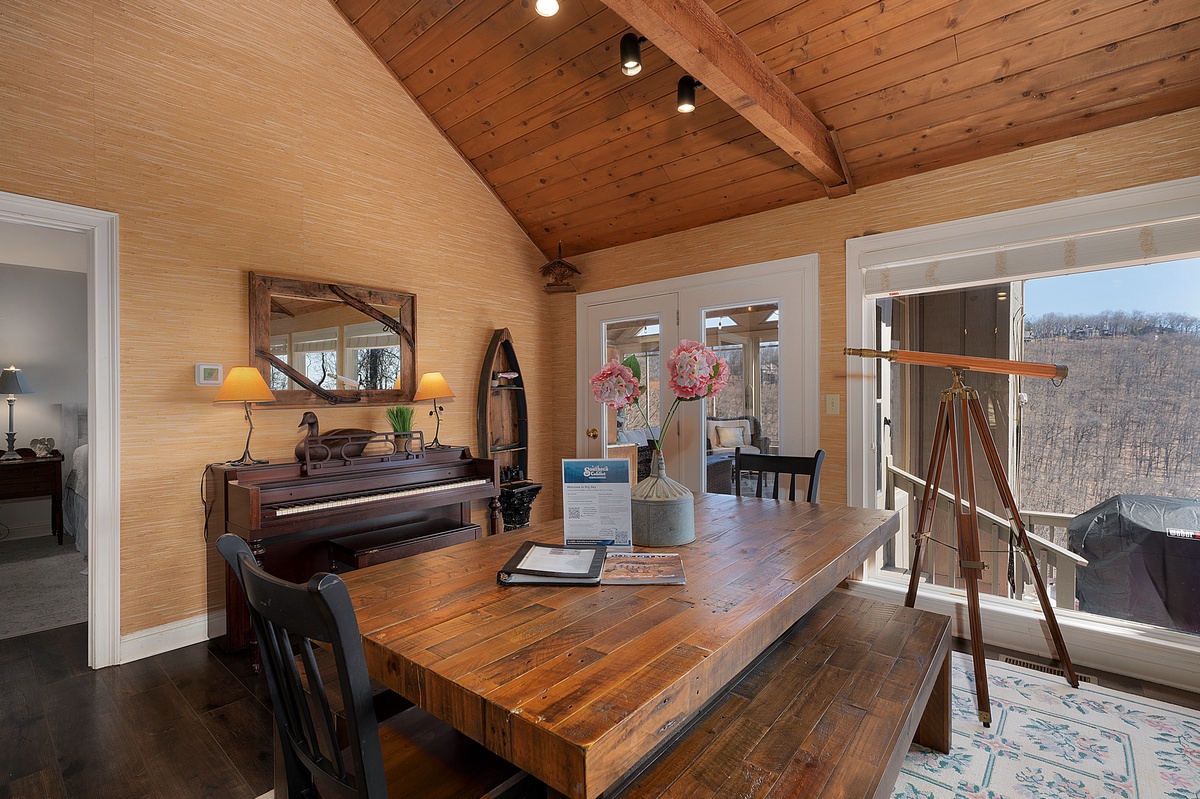 Breathe in the mountain air with a warm cup of coffee while watching the sunrise on a brand-new day. Cozy up by the fireplace in the sunroom or step out onto the open deck space with tables fit for the whole group to enjoy a traditional family meal. The fully equipped kitchen offers stainless steel appliances, and an island perfect for preparing any meal.