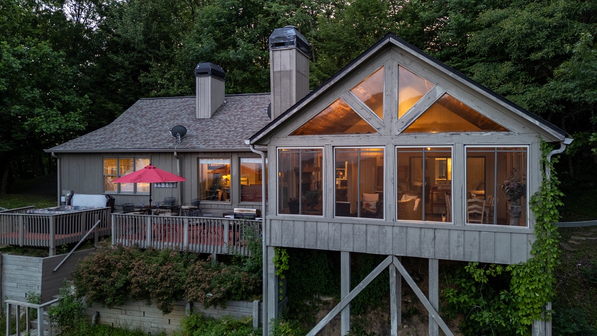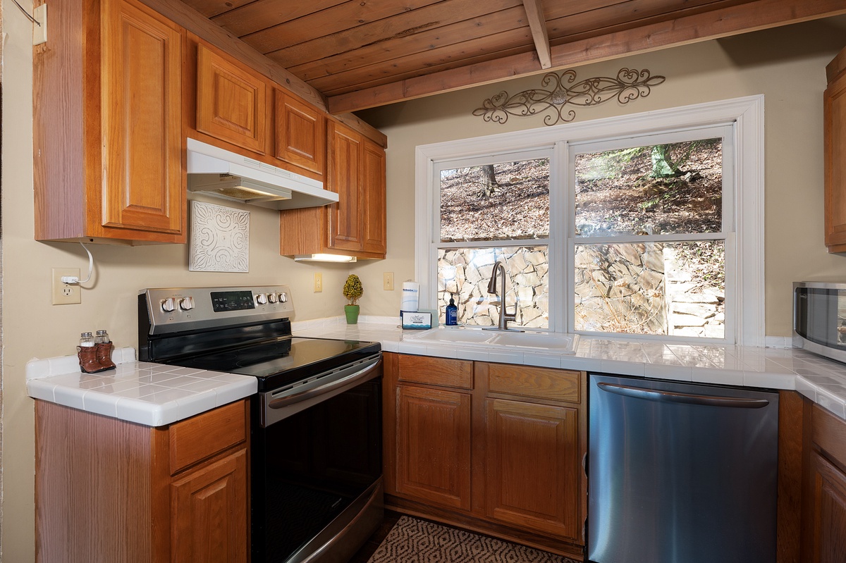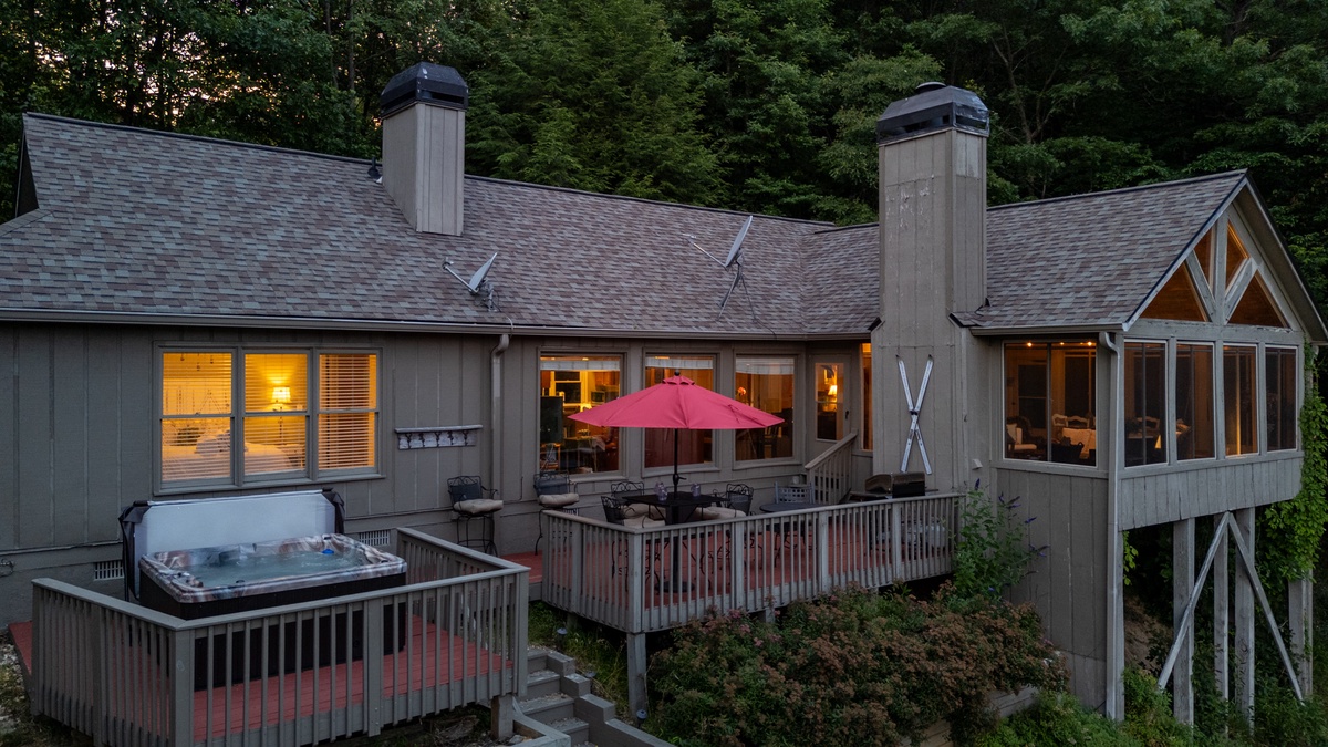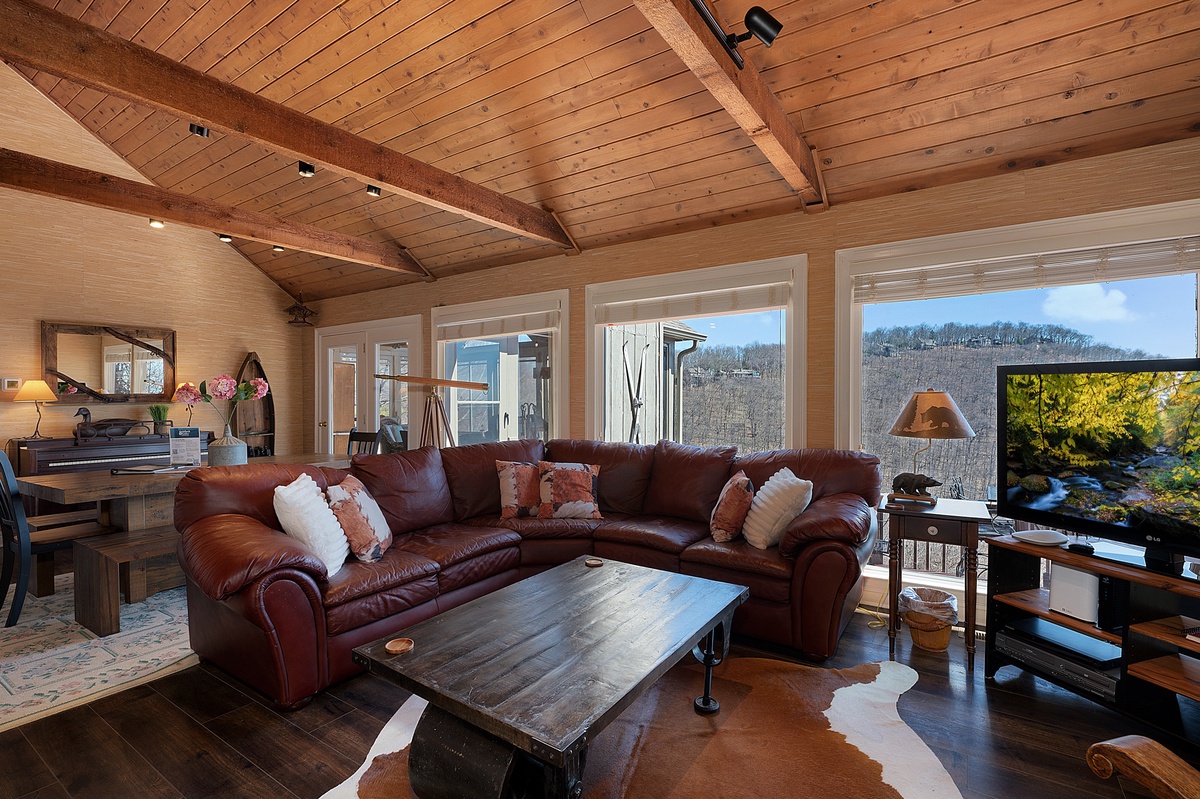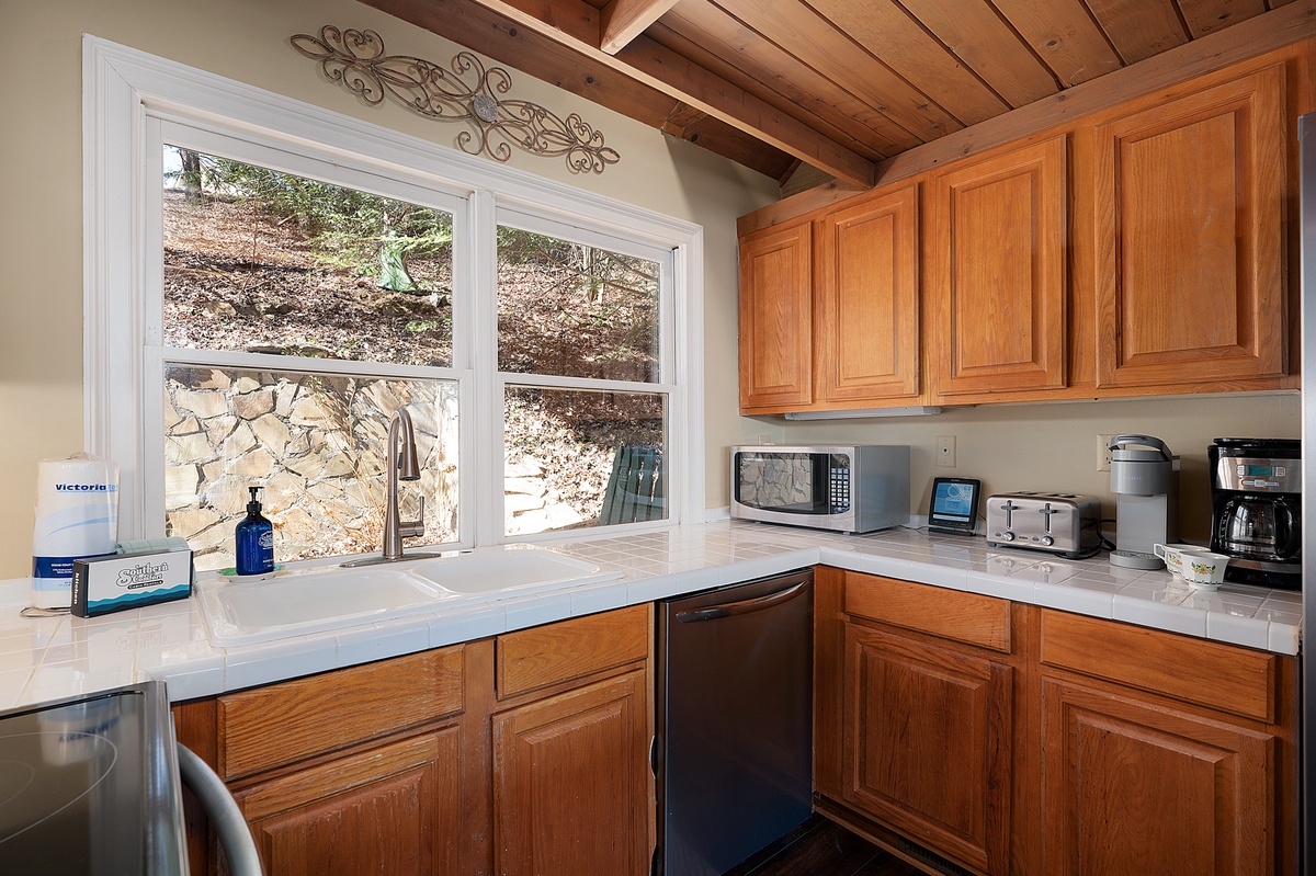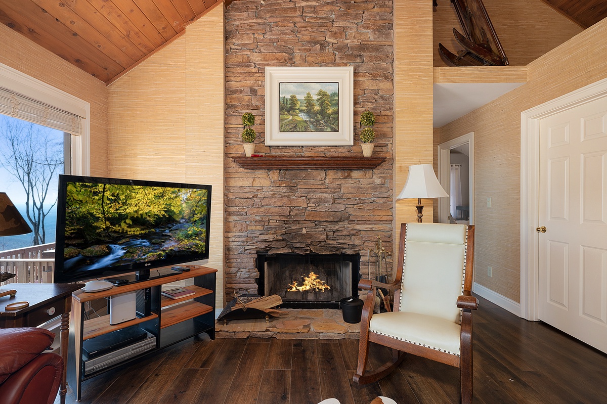 Breathe in the mountain air with a warm cup of coffee while watching the sunrise on a brand-new day. Cozy up by the fireplace in the sunroom or step out onto the open deck space with tables fit for the whole group to enjoy a traditional family meal. The fully equipped kitchen offers stainless steel appliances, and an island perfect for preparing any meal.