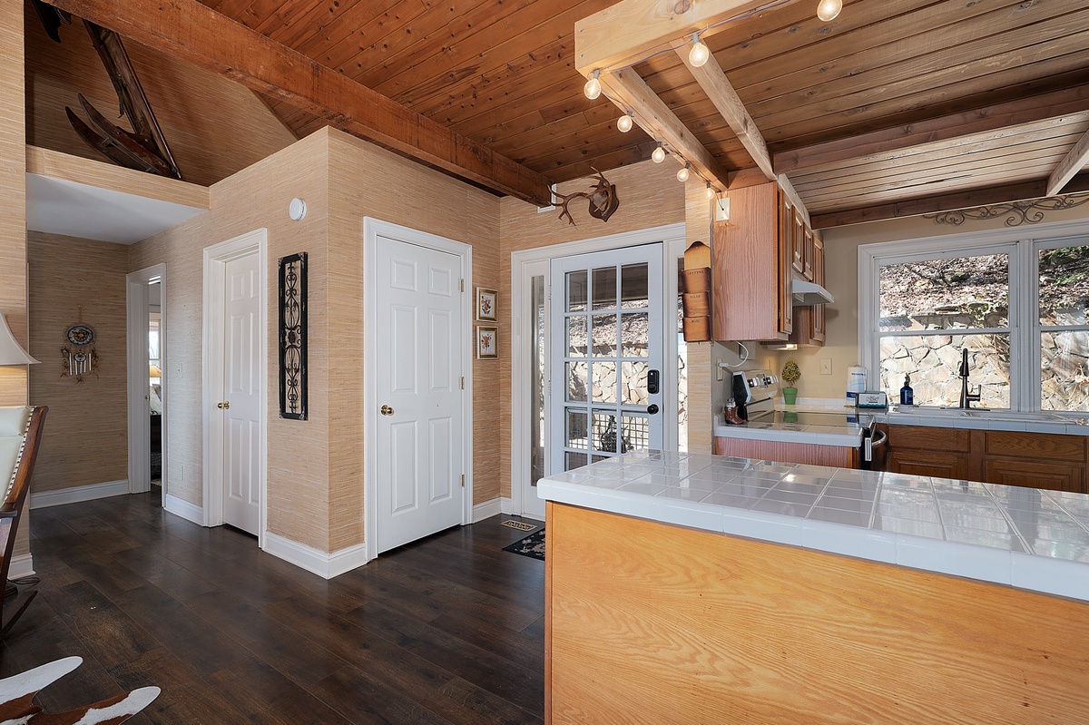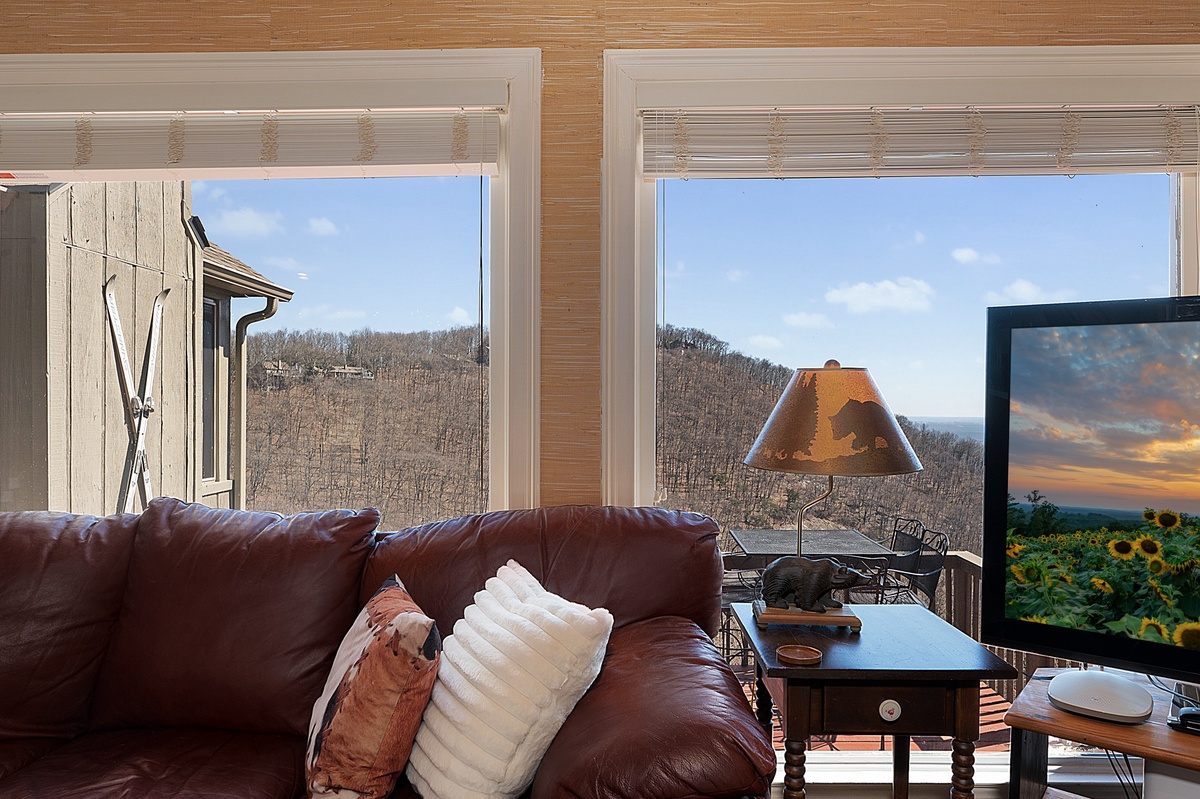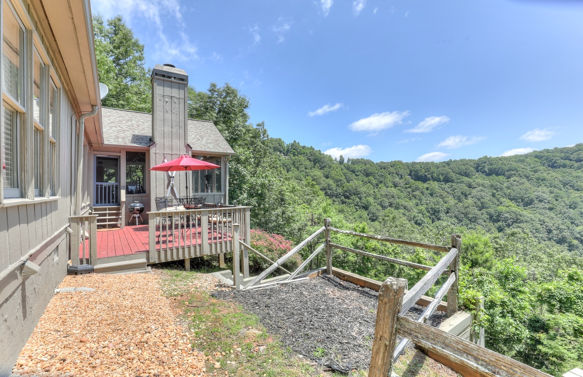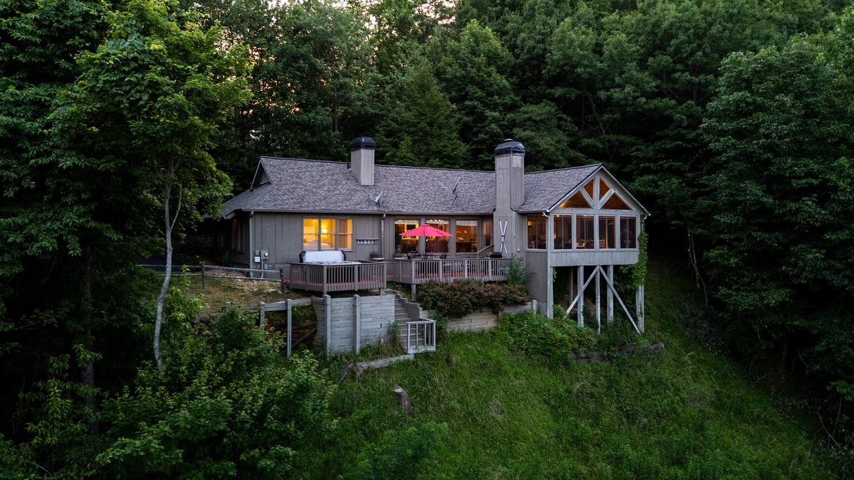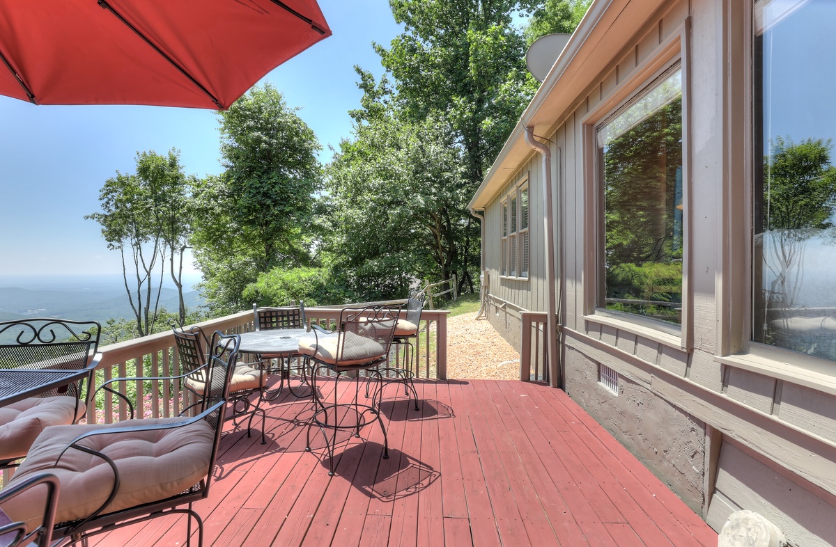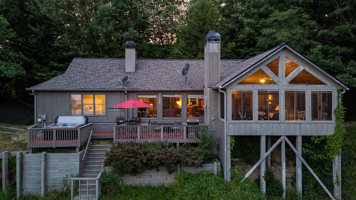 Breathe in the mountain air with a warm cup of coffee while watching the sunrise on a brand-new day. Cozy up by the fireplace in the sunroom or step out onto the open deck space with tables fit for the whole group to enjoy a traditional family meal. The fully equipped kitchen offers stainless steel appliances, and an island perfect for preparing any meal.