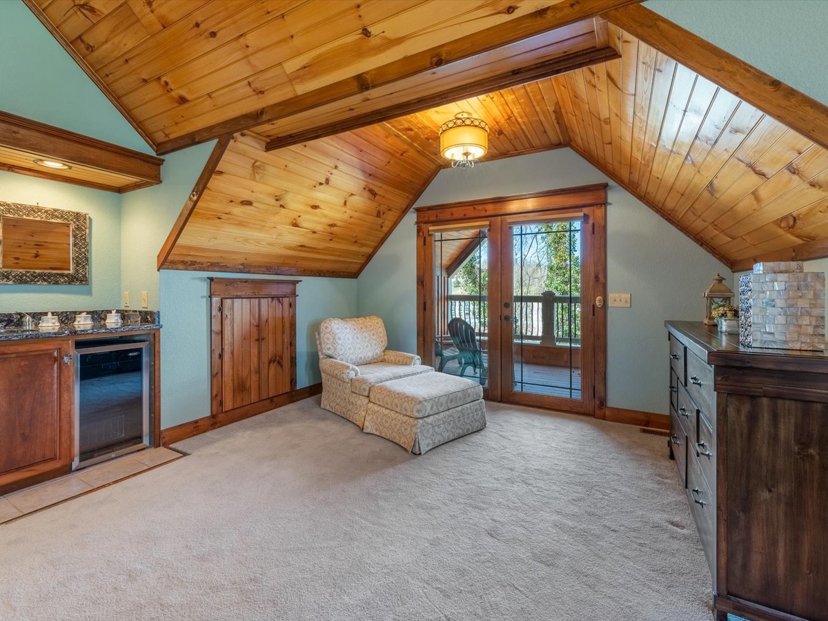 Blue Ridge Cottage offers bedrooms on each level creating a haven of privacy and modern luxury. The entry level guest bedroom offers that cozy feel as soon as you enter the room. Its comfortable bed will make it hard to get up in the morning. Venturing to the upper level, you’ll be greeted with an oversized primary bedroom suite like no other. The private balcony, with seating for two, gifts you with a lovely view of the quaint downtown area. A comfortable lounge chair in the spacious reading area and mini-wet bar nearby is just what the doctor ordered. To top that off, a king size bed in front of the fireplace and 70” TV await you. You’ll wish you could call for room service all day and night!