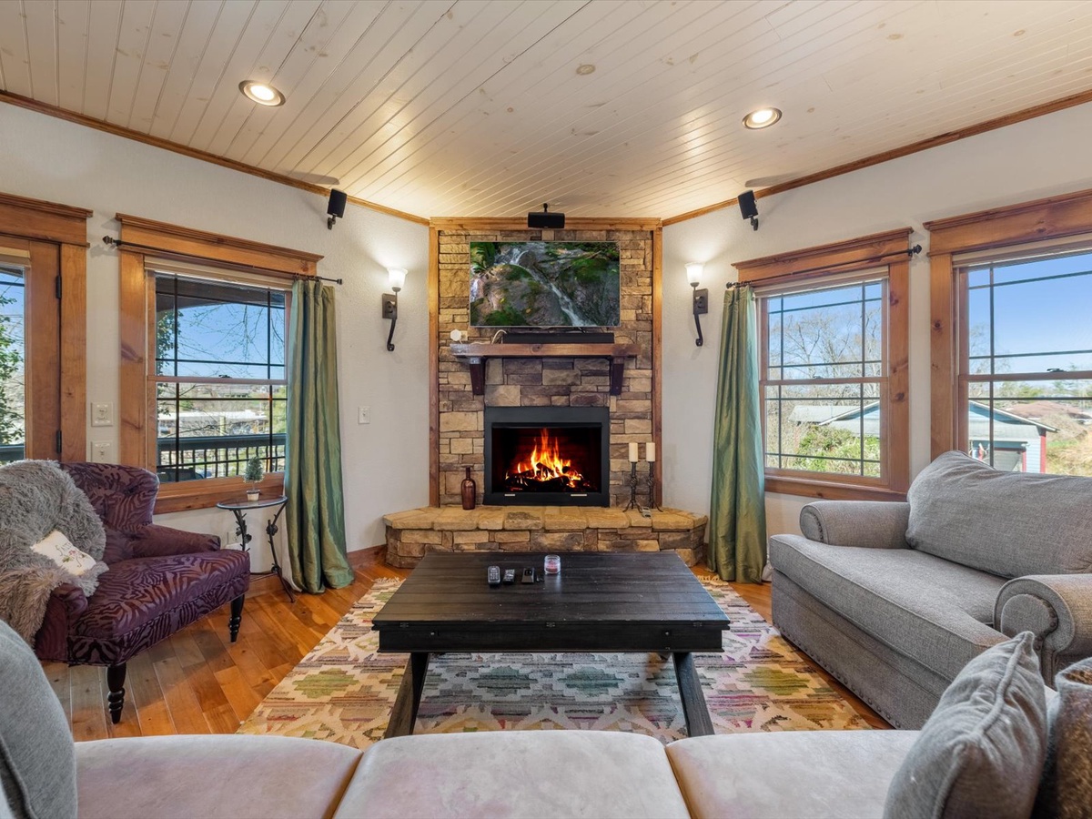 - Stone laid gas fireplace and 55”TV with surround sound