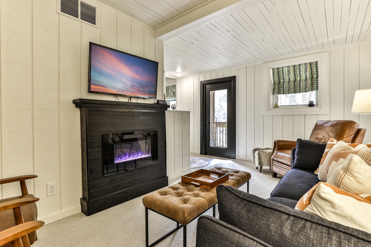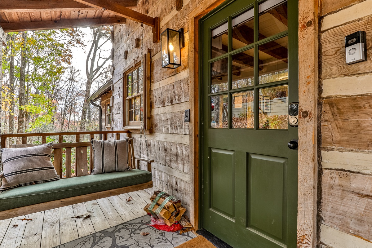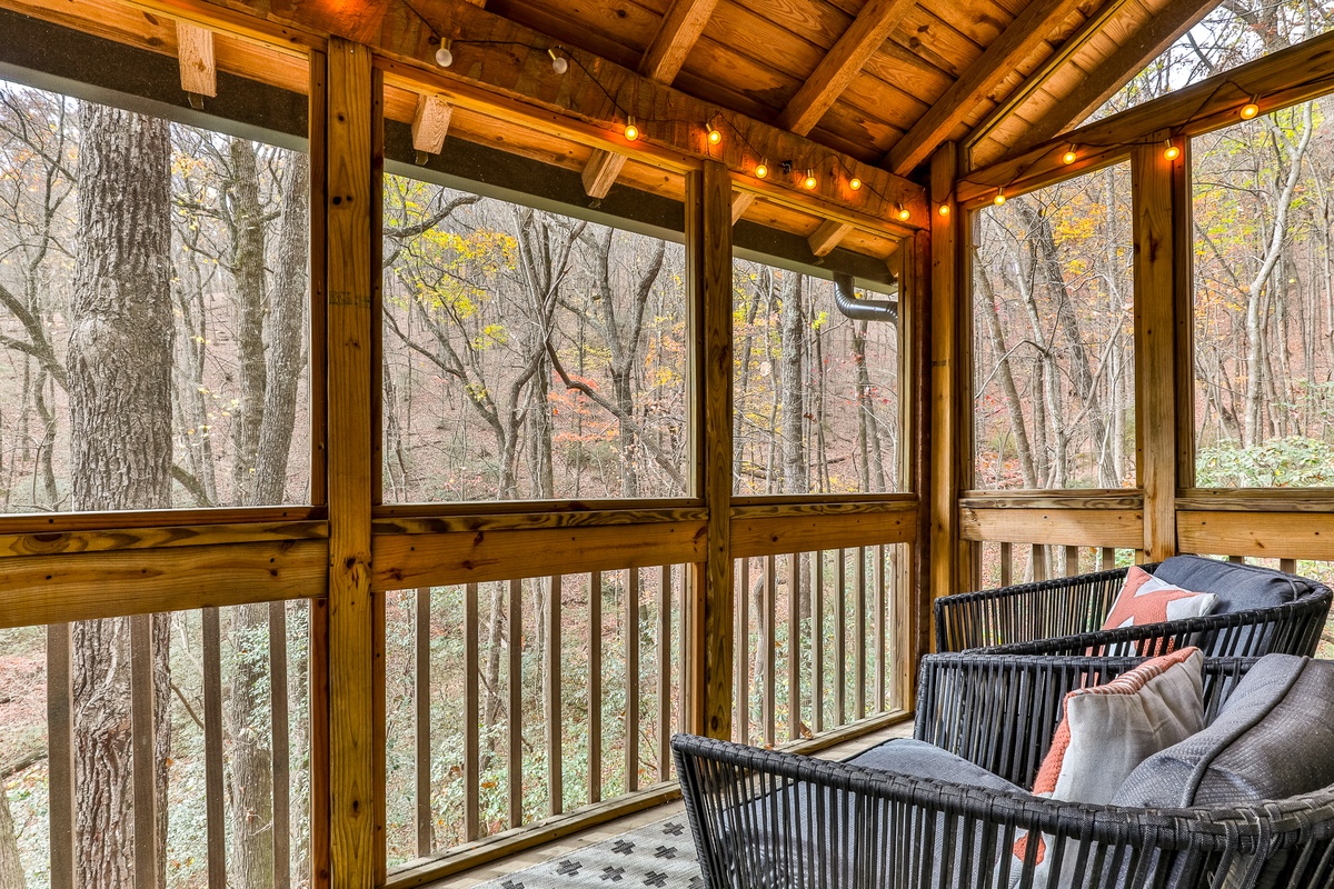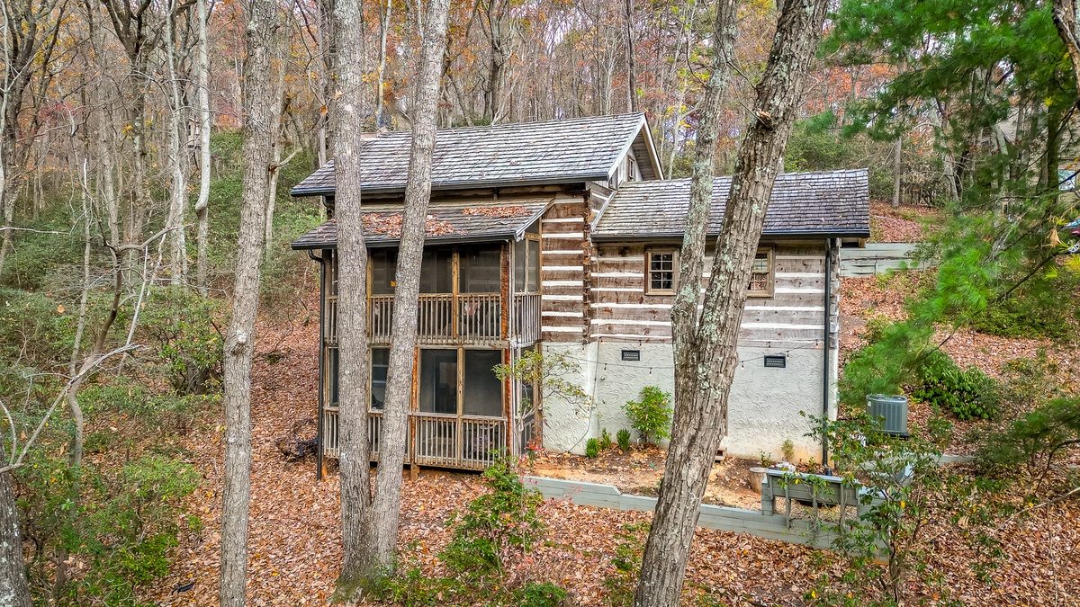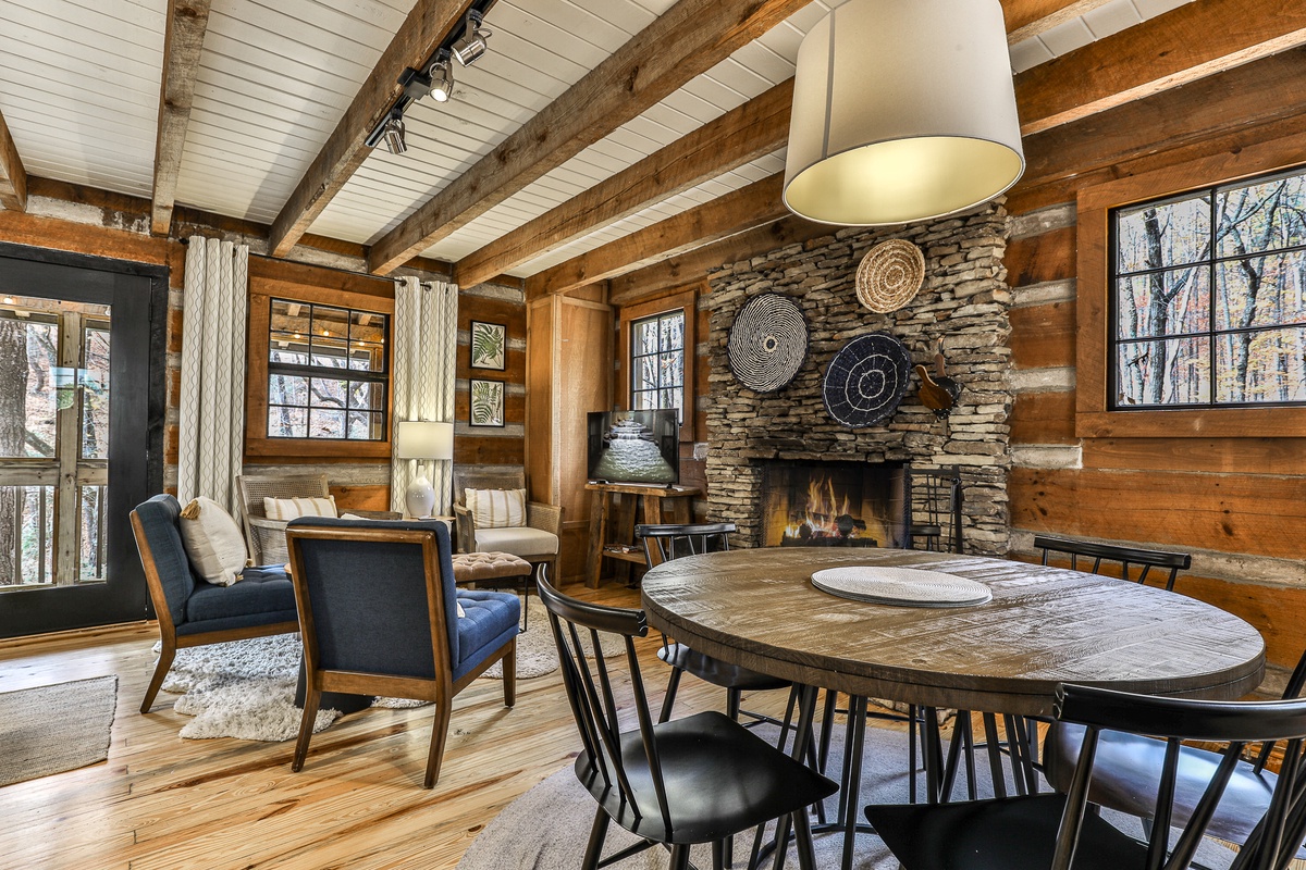 Enter the beautifully restored timber and white chink cabin through a rocking chair front porch into the open-plan dining, living area, and kitchen. The living area offers beautiful views of the wooded glen through multiple windows and a treehouse-like screened back sitting porch. Downstairs, a second living room with a TV is perfect for movie night or the game and features a stylish electric flat-screen fireplace. Behind the living room is a second screened porch sitting area, a great spot to listen to the creek or read a book. Outside, nestled at the back of the cabin, is a beautiful fire pit, perfect for relaxing and enjoying nature and the sounds of the nearby creek.