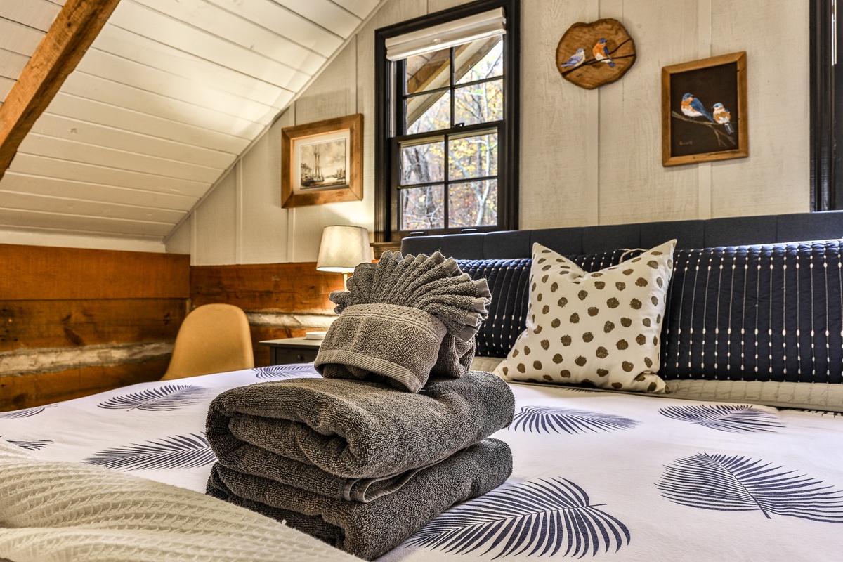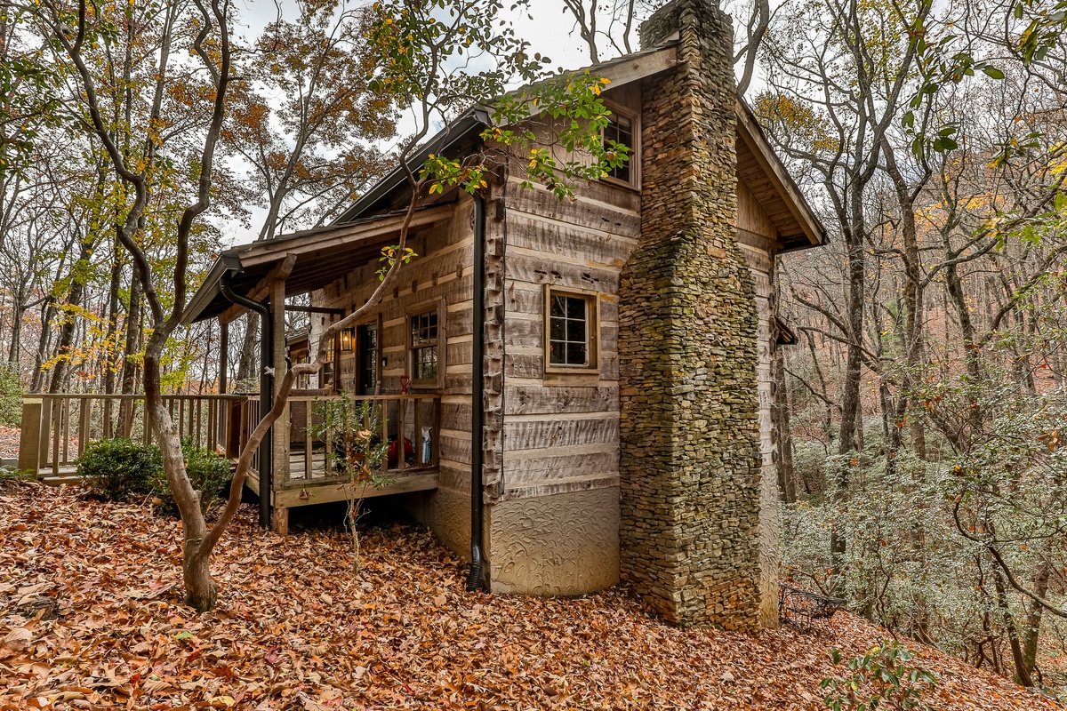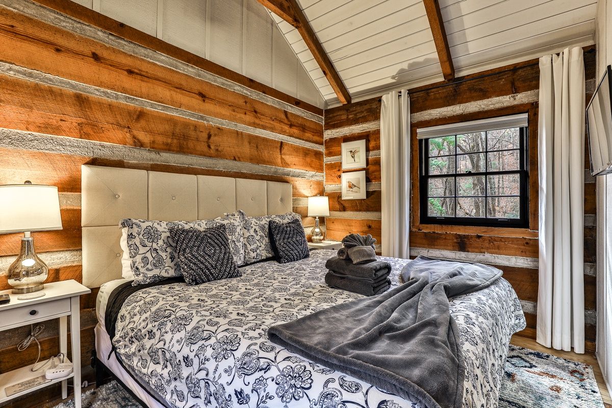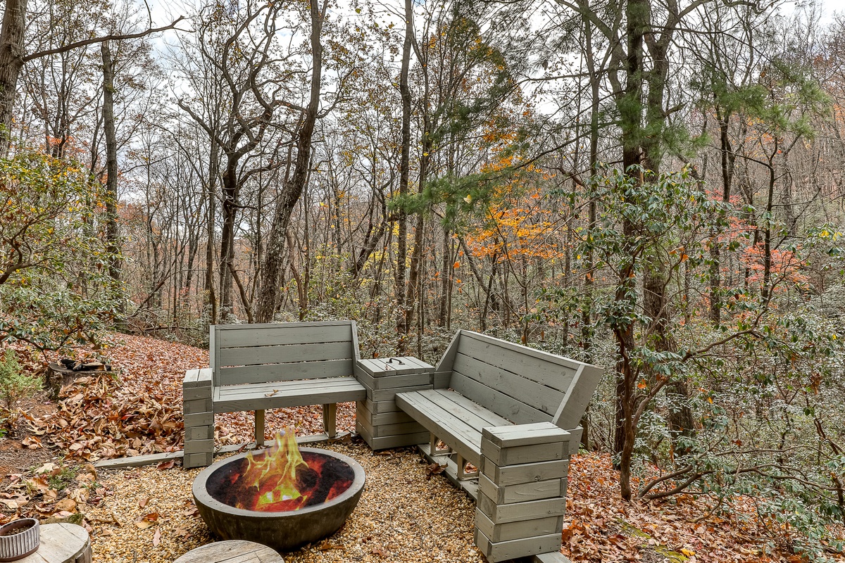 Enter the beautifully restored timber and white chink cabin through a rocking chair front porch into the open-plan dining, living area, and kitchen. The living area offers beautiful views of the wooded glen through multiple windows and a treehouse-like screened back sitting porch. Downstairs, a second living room with a TV is perfect for movie night or the game and features a stylish electric flat-screen fireplace. Behind the living room is a second screened porch sitting area, a great spot to listen to the creek or read a book. Outside, nestled at the back of the cabin, is a beautiful fire pit, perfect for relaxing and enjoying nature and the sounds of the nearby creek.