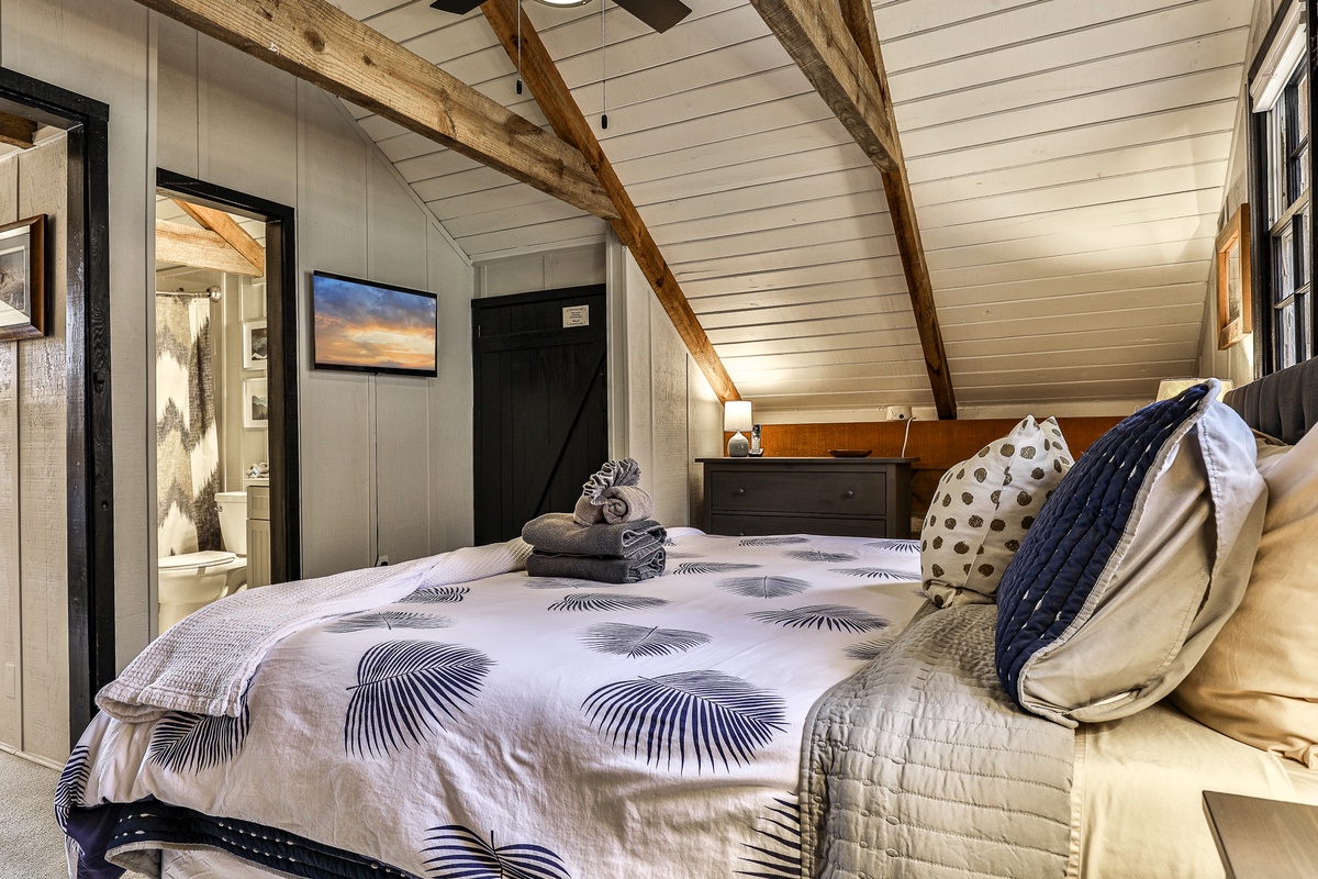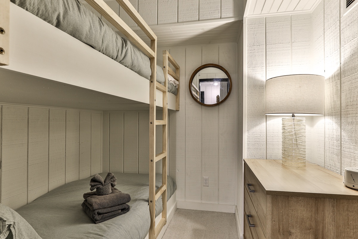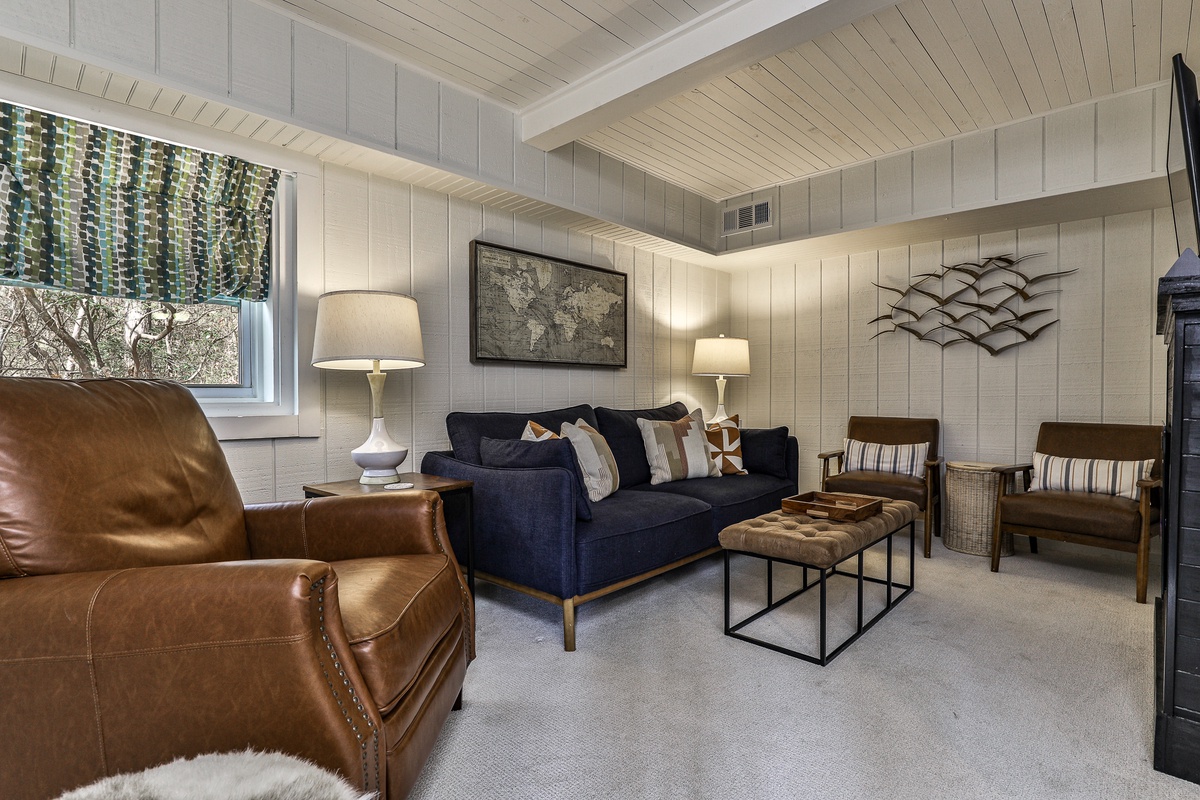 The primary bedroom upstairs has an attached bathroom and a private living room with a TV. The main floor bedroom (king) shares a stylish full hall bath and has a TV. The cozy wall bunk on the lower level shares a half bath. This beautiful home features four TVs (main living room, both bedrooms, and lower living room).