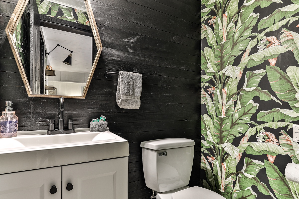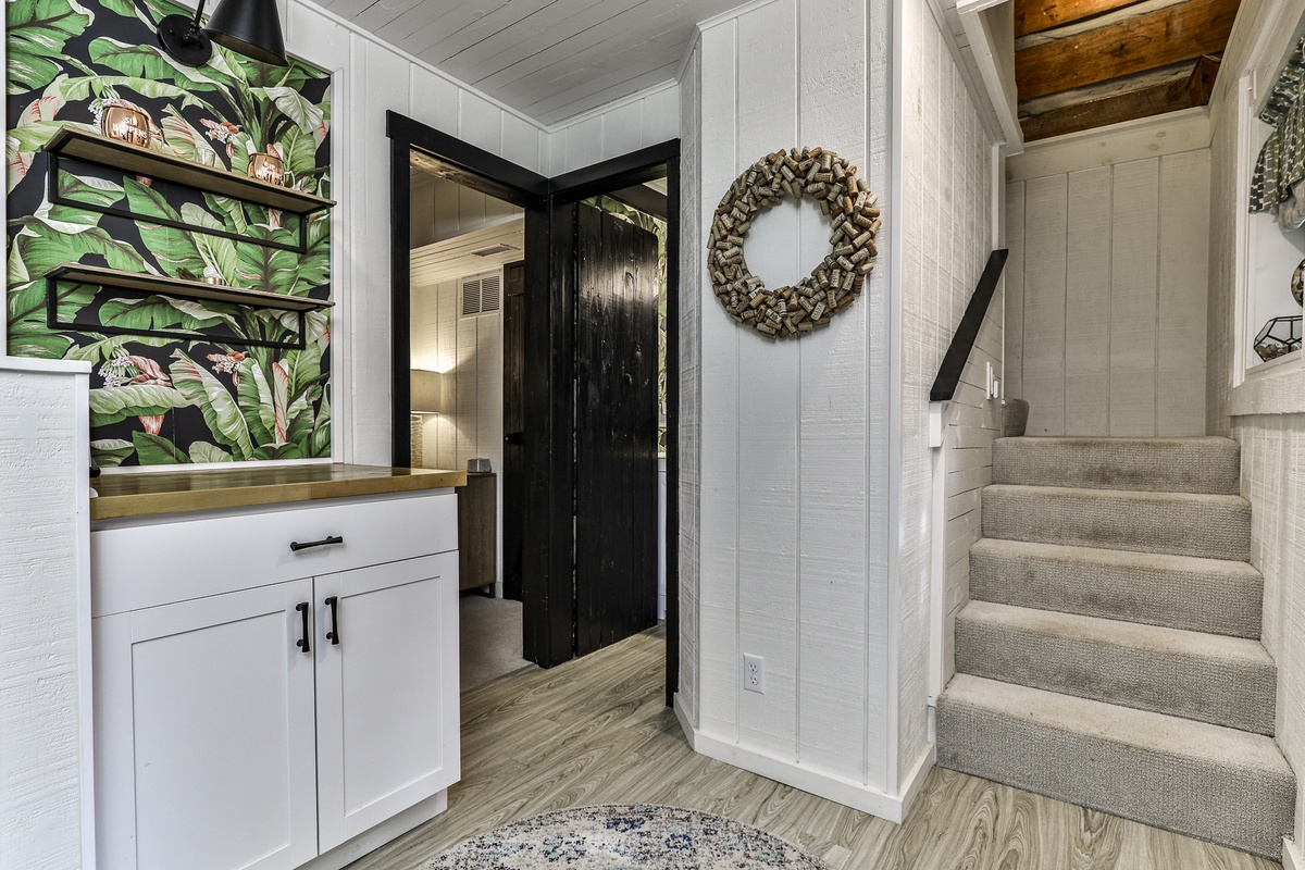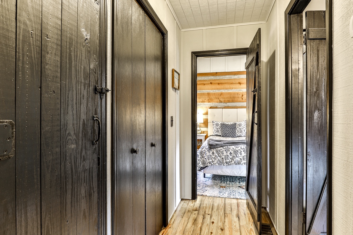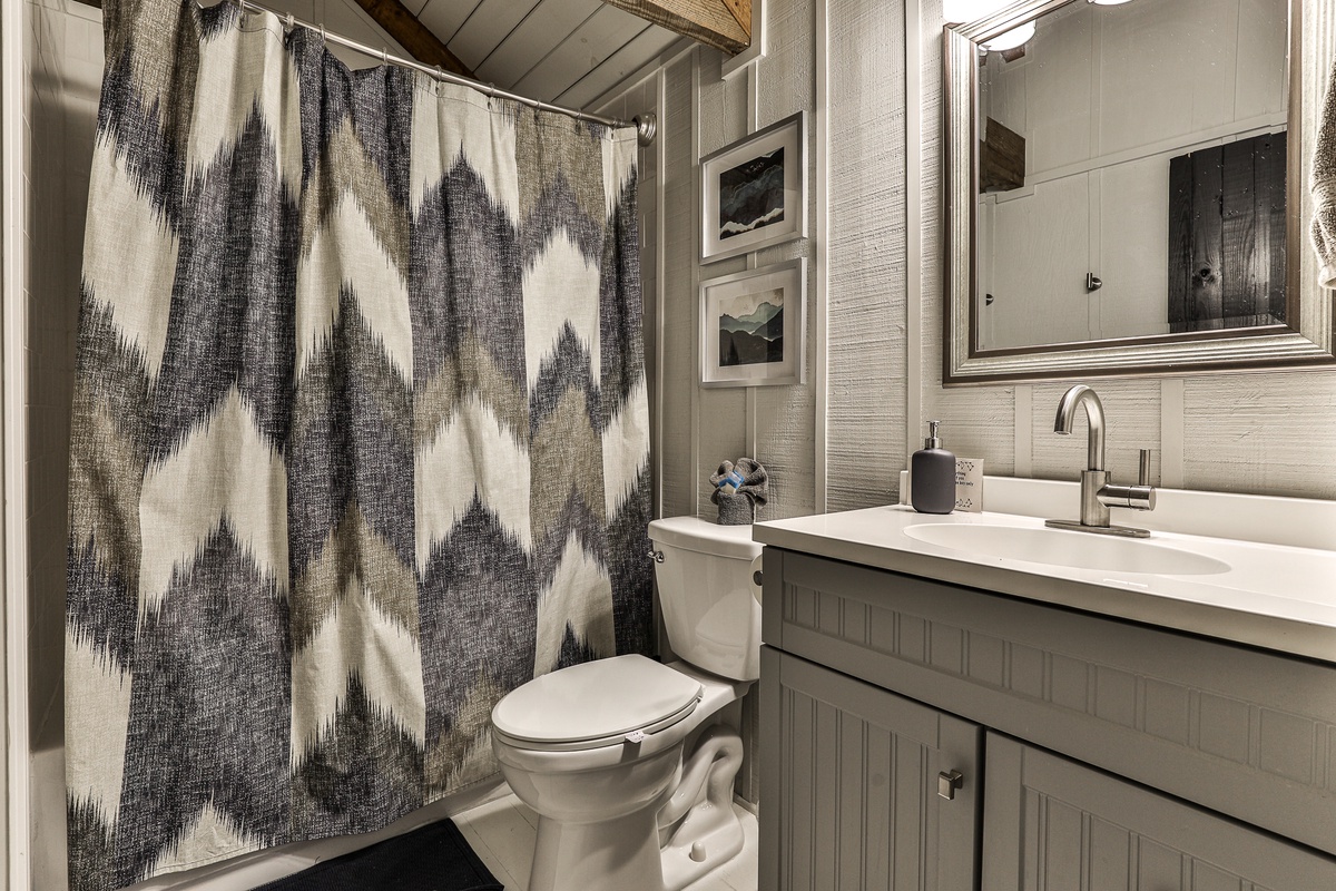 The primary bedroom upstairs has an attached bathroom and a private living room with a TV. The main floor bedroom (king) shares a stylish full hall bath and has a TV. The cozy wall bunk on the lower level shares a half bath. This beautiful home features four TVs (main living room, both bedrooms, and lower living room).