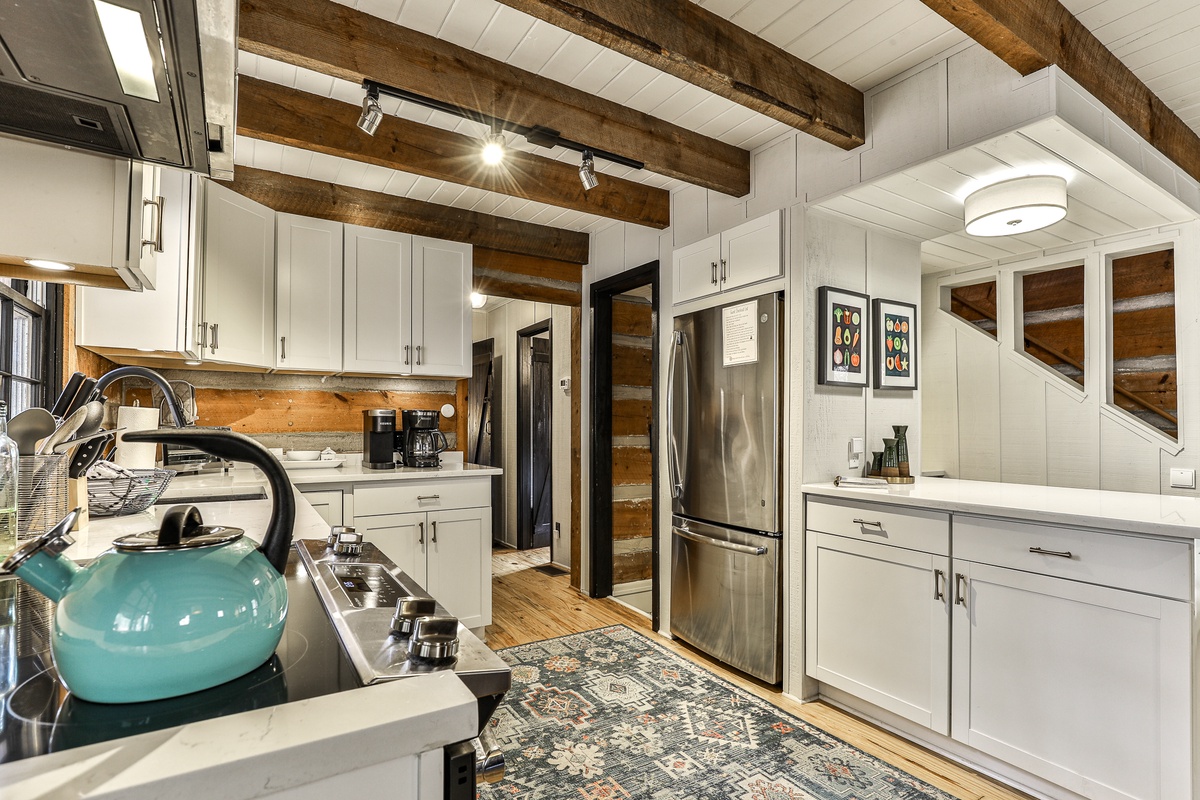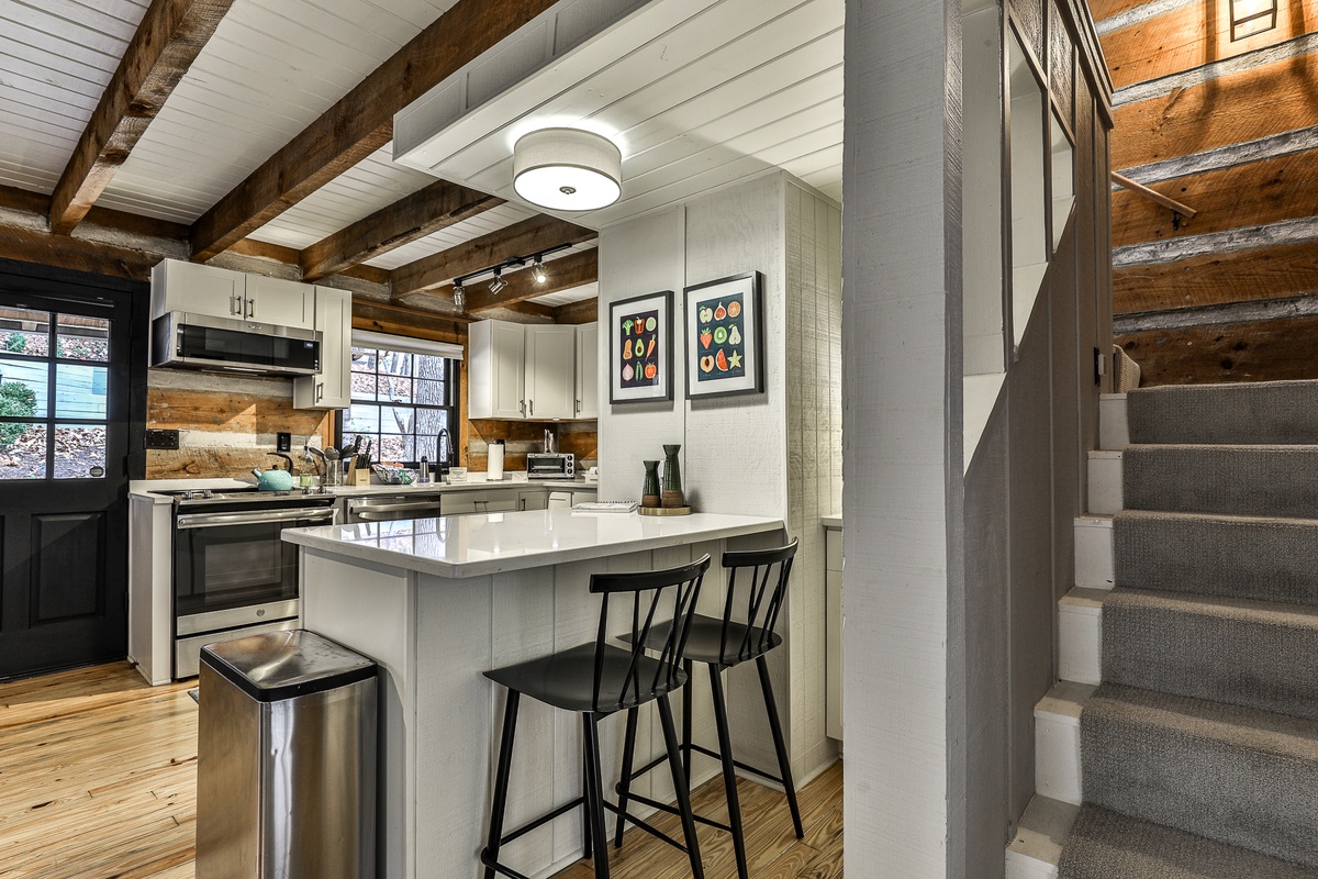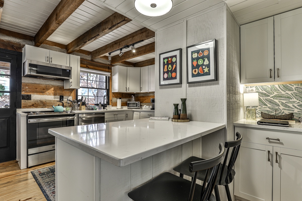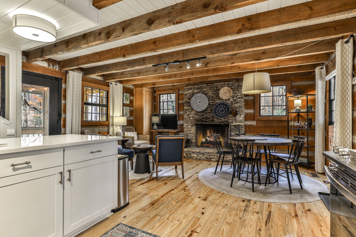 The newly renovated open-plan kitchen is well-appointed for preparing meals, coffee, or snacks. The dining table seats five and overlooks the stacked stone fireplace and hearth of the living room.