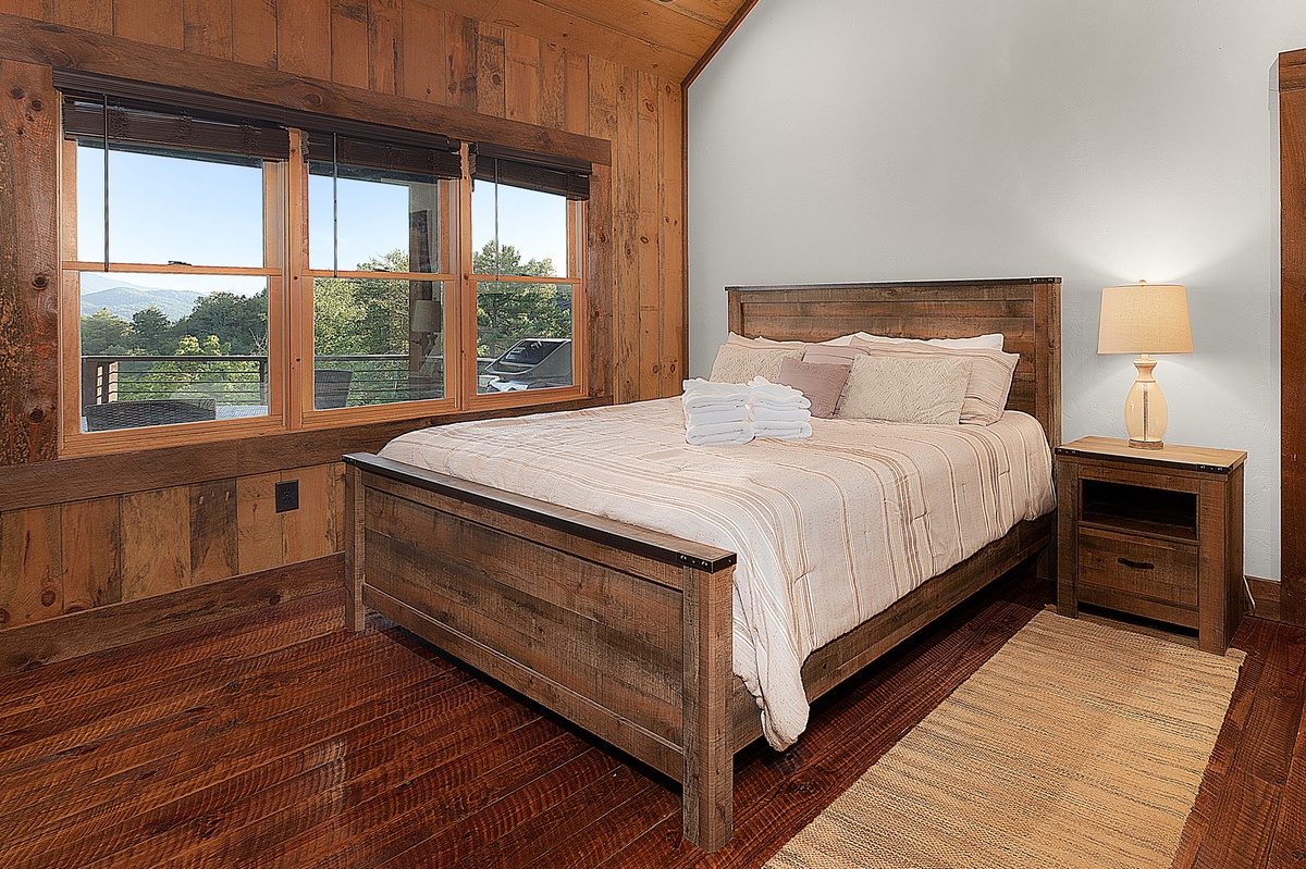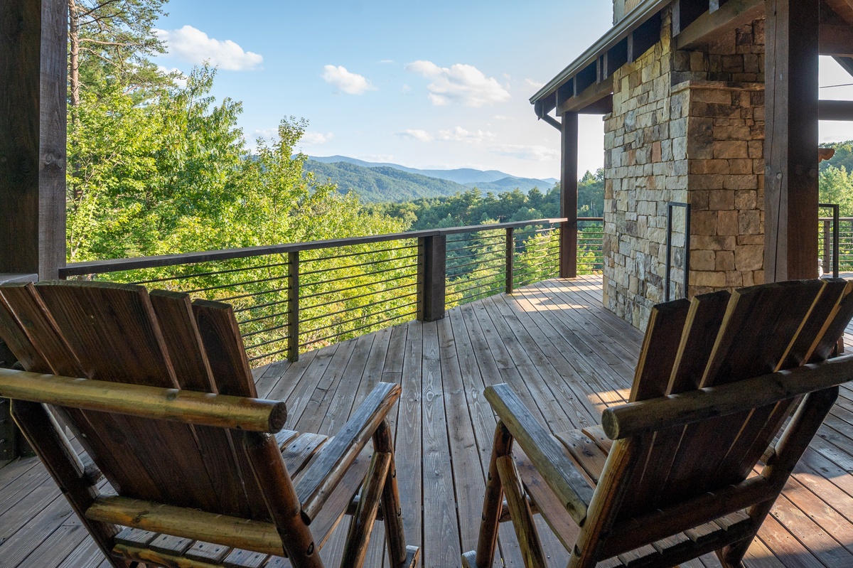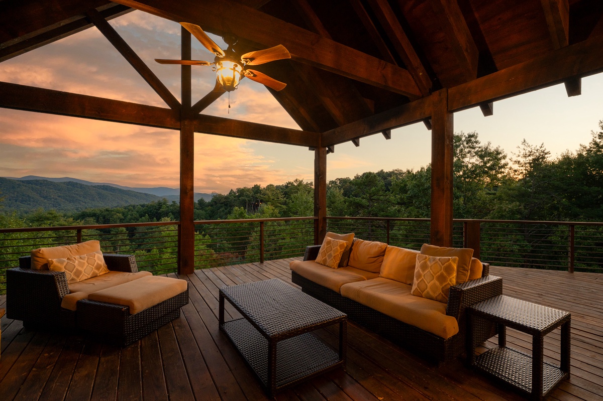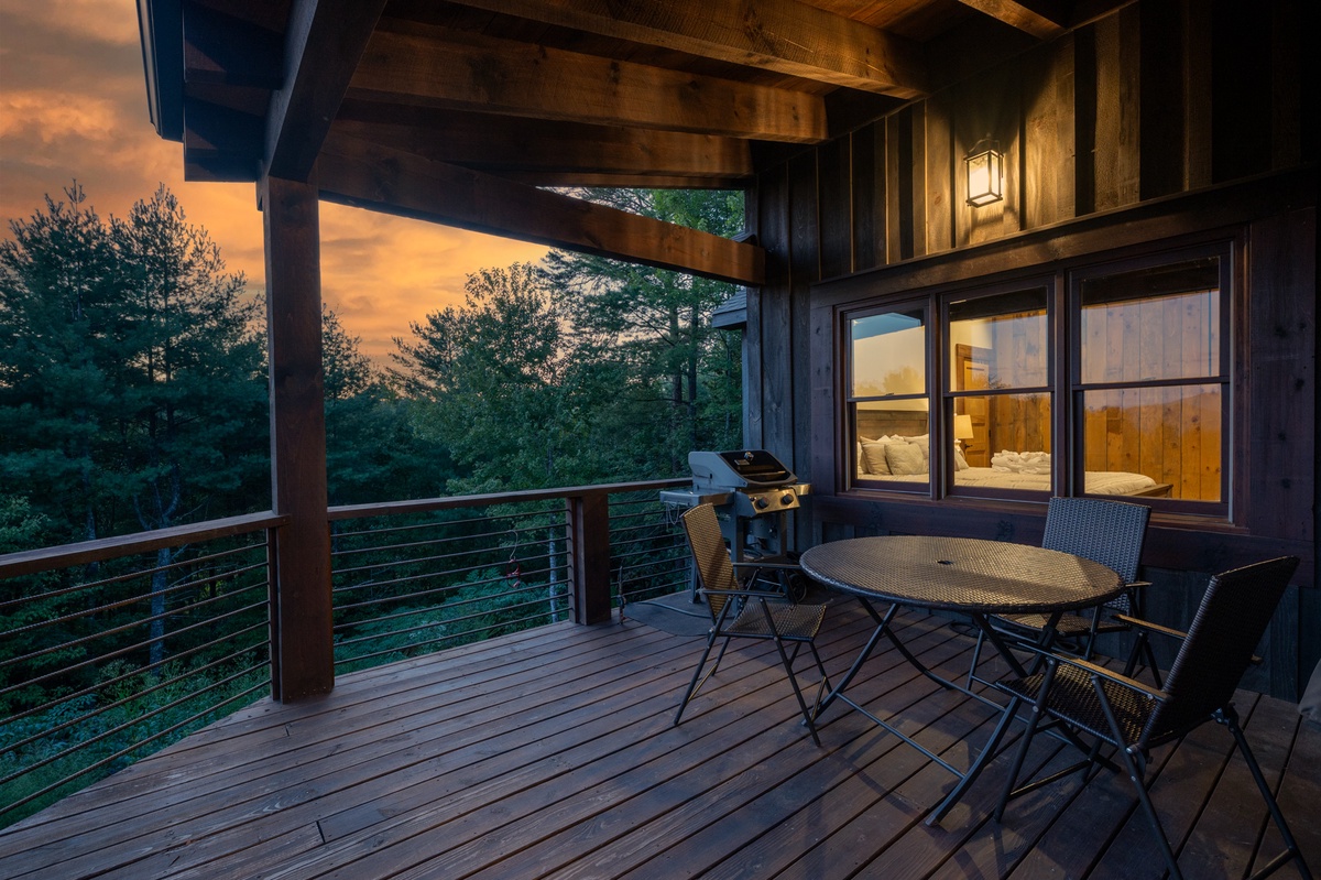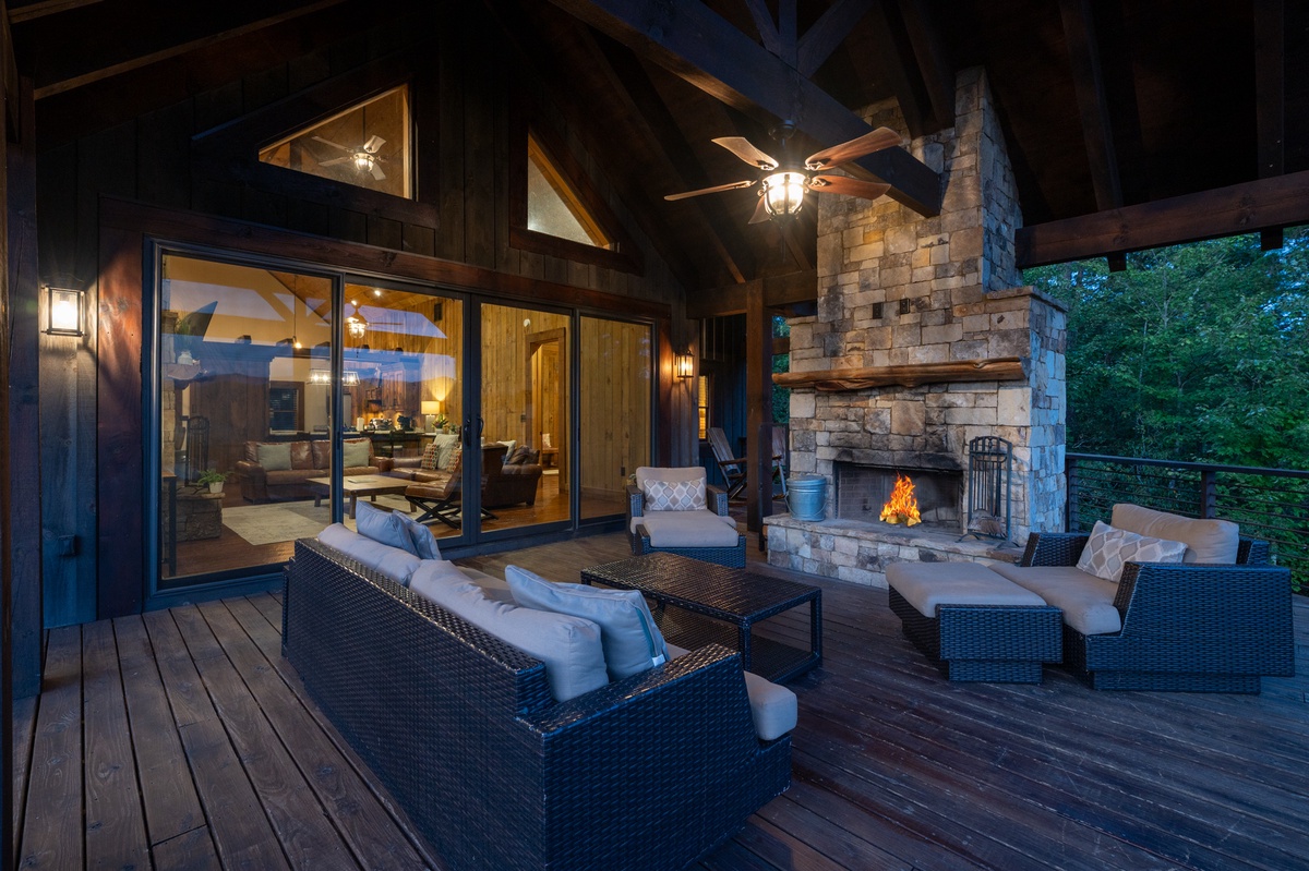 One of the neatest features of this cabin is the ability to have a jaw-dropping mountain view from EVERY bedroom in this property. The first deck on the entry-level boasts an outdoor living area that has a dining patio set for 4 and a wood-burning fireplace with ample wicker furniture to thoroughly enjoy your outdoor experience with friends and family. There are also two rocking chairs and a gas grill for your enjoyment.