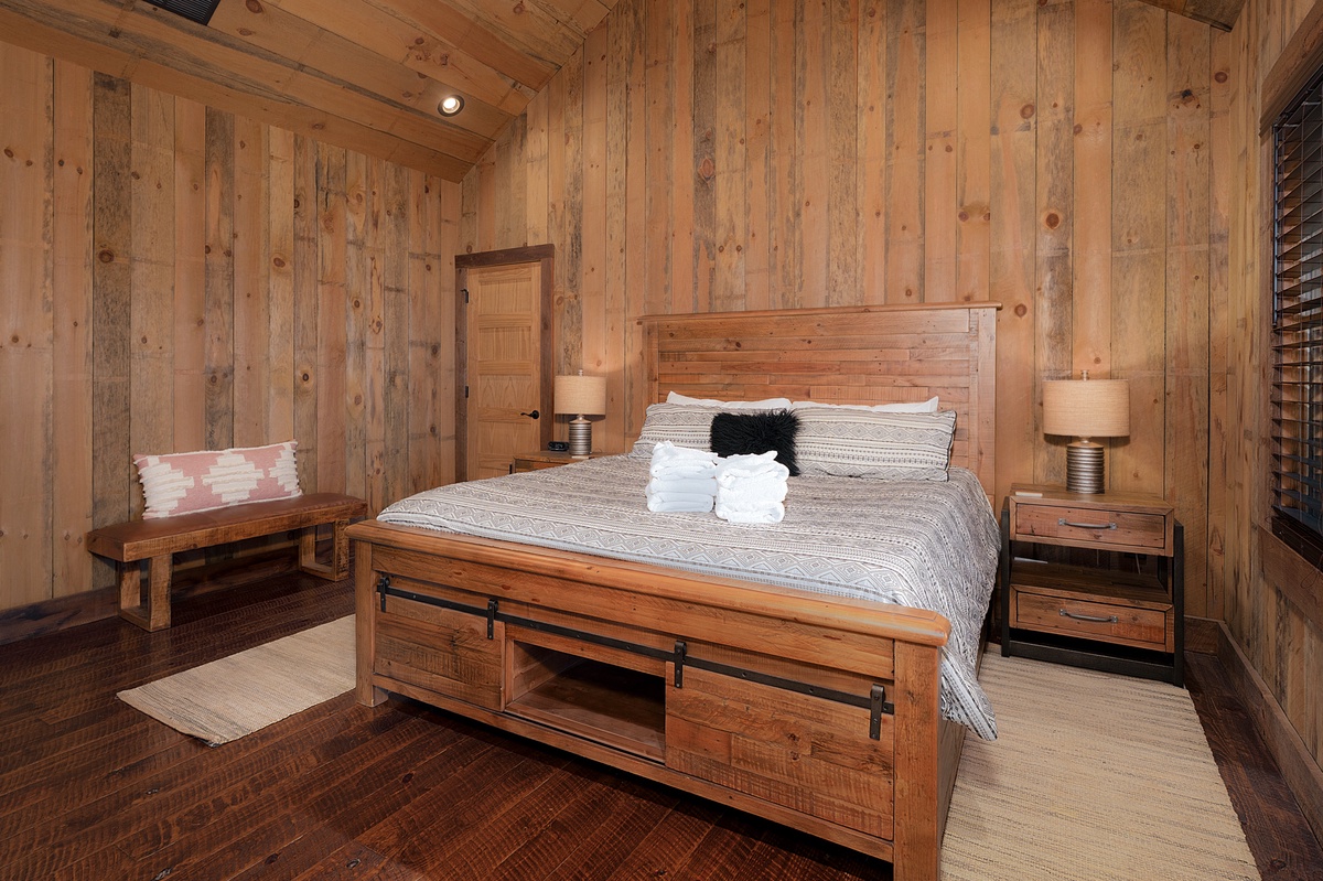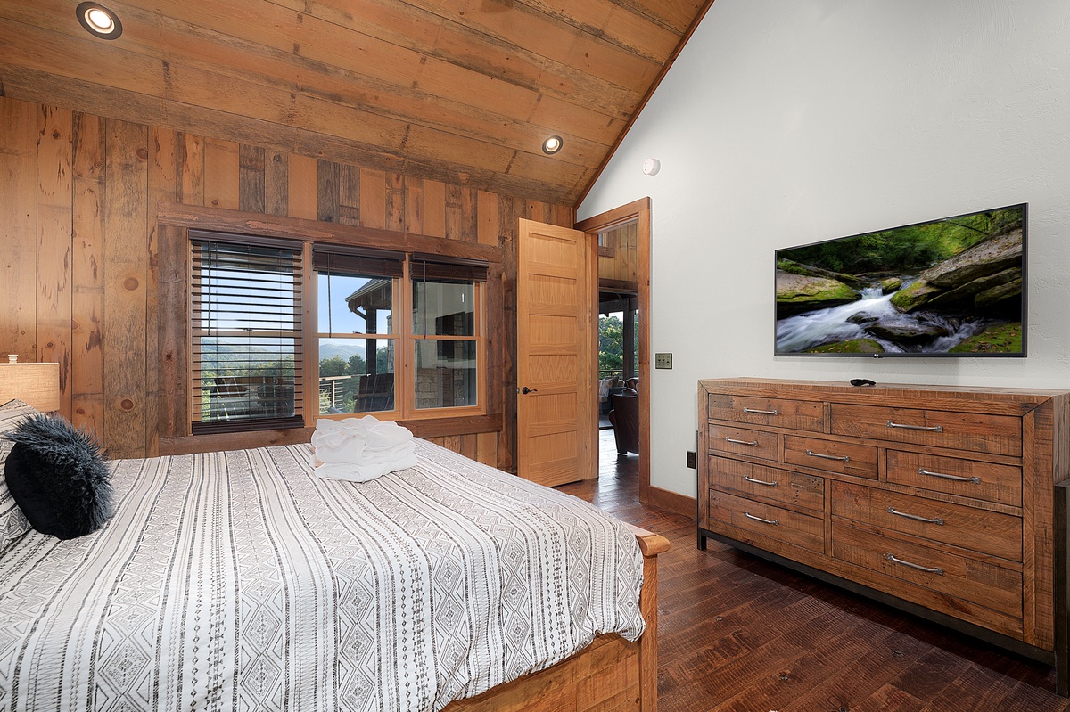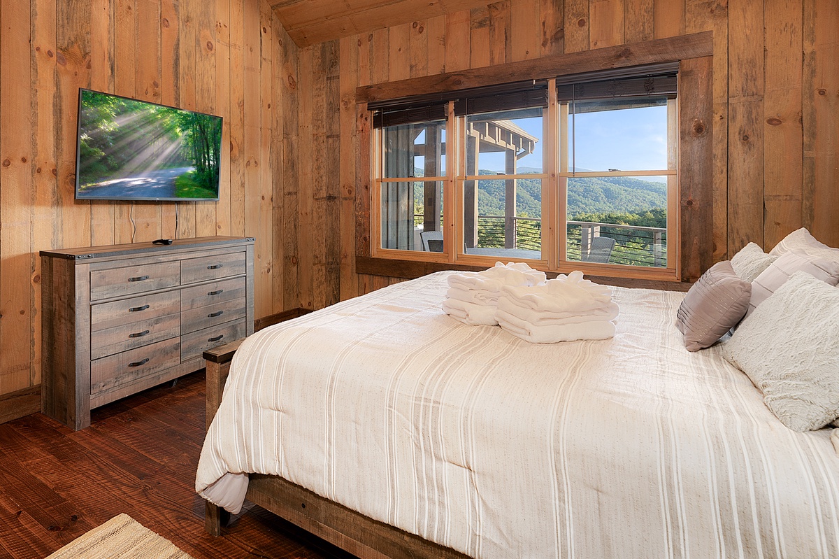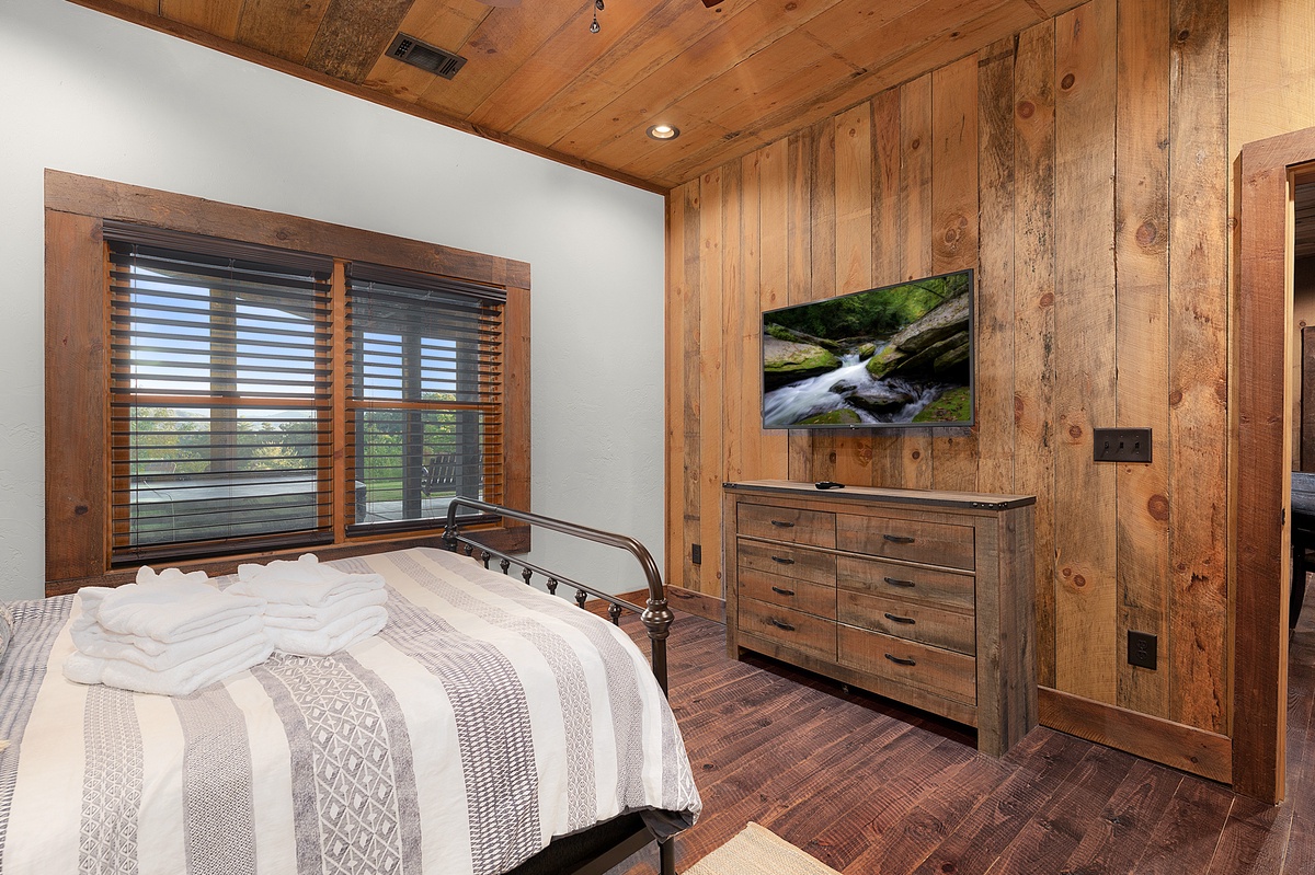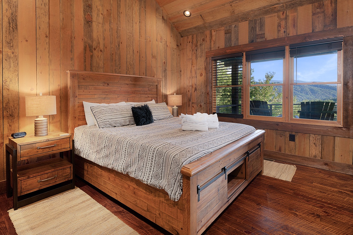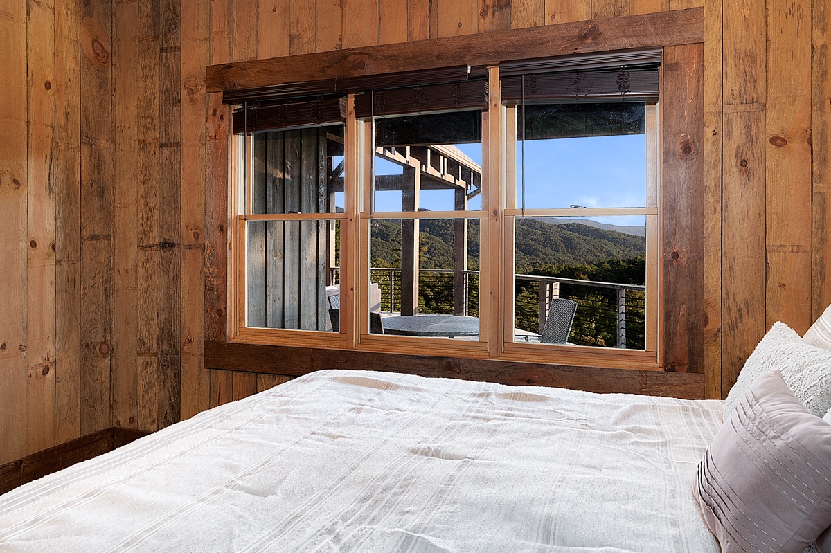One of the neatest features of this cabin is the ability to have a jaw-dropping mountain view from EVERY bedroom in this property. The first deck on the entry-level boasts an outdoor living area that has a dining patio set for 4 and a wood-burning fireplace with ample wicker furniture to thoroughly enjoy your outdoor experience with friends and family. There are also two rocking chairs and a gas grill for your enjoyment.