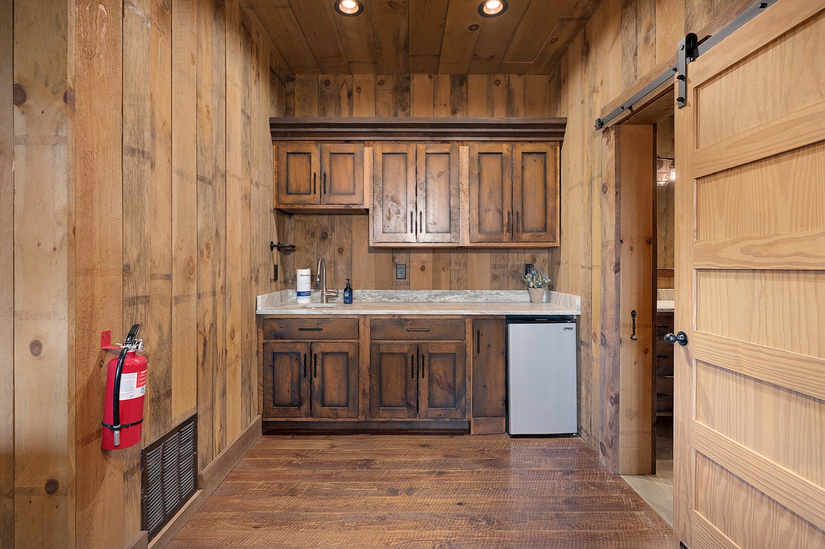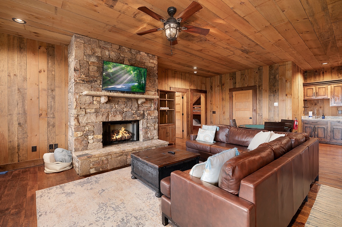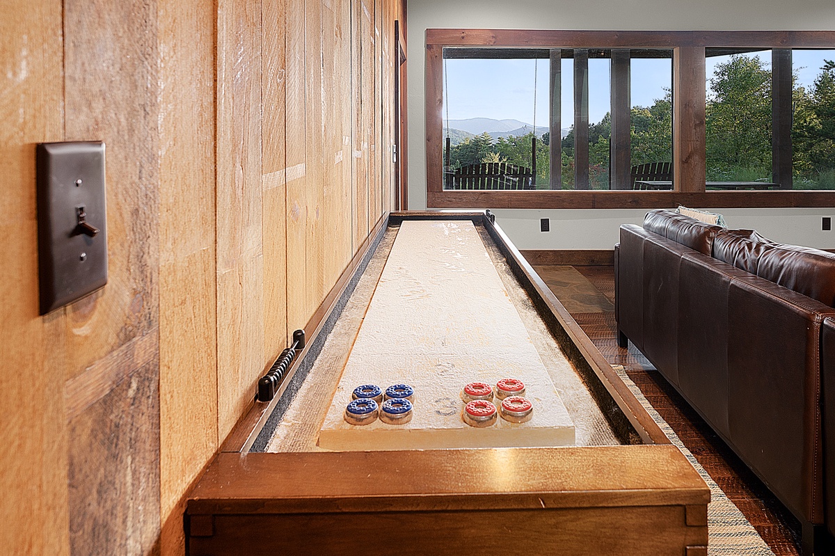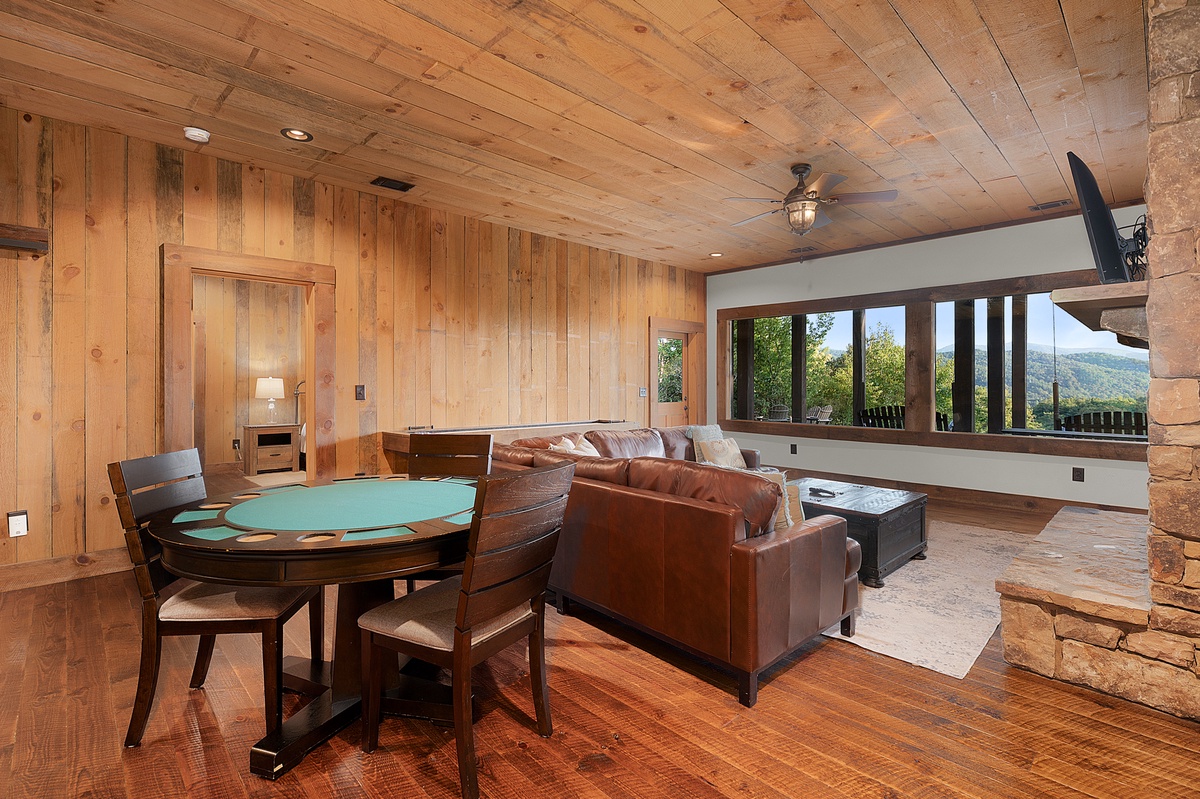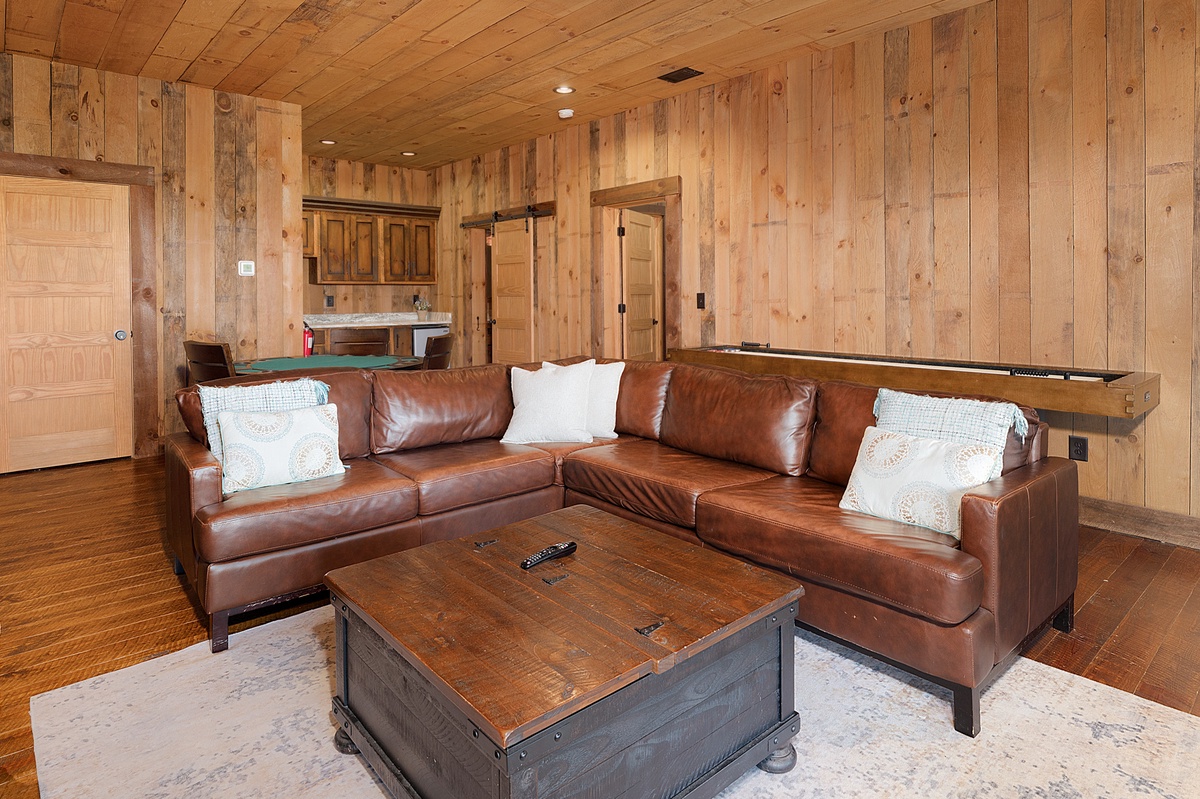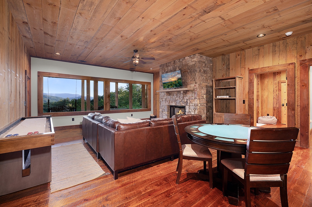 The den is located in the lower level of this beautiful cabin. Plenty is available to keep you entertained including a card/poker table and a shuffleboard table. This level has a large leather sectional perfect for watching the big game on the 55" cable TV over a gas log fireplace. Mix up your favorite cocktail at the mini bar that has a mini-fridge and sink. There is a shared walk-in shower bathroom on this level as well.