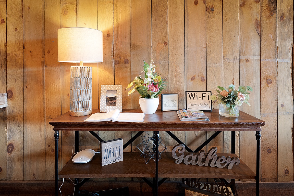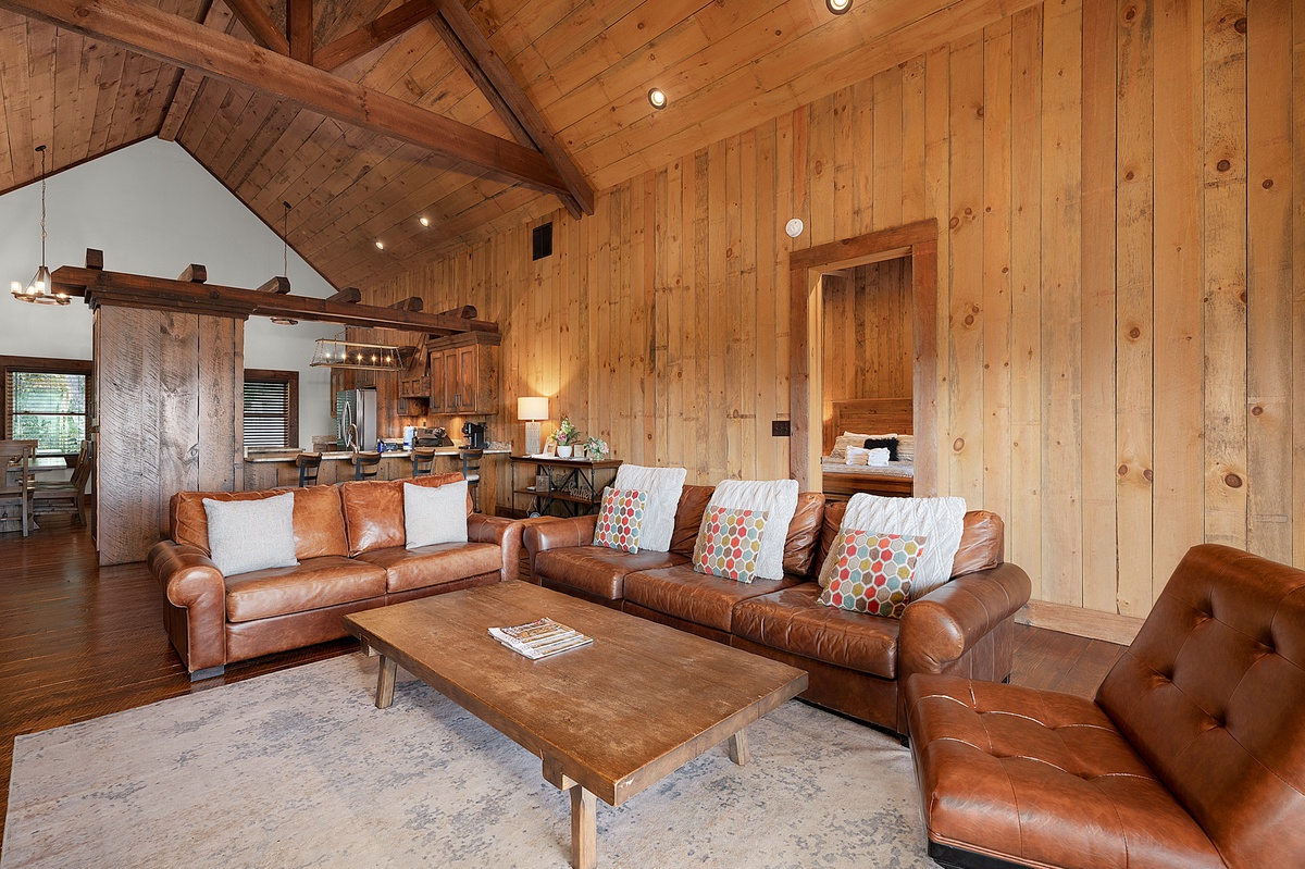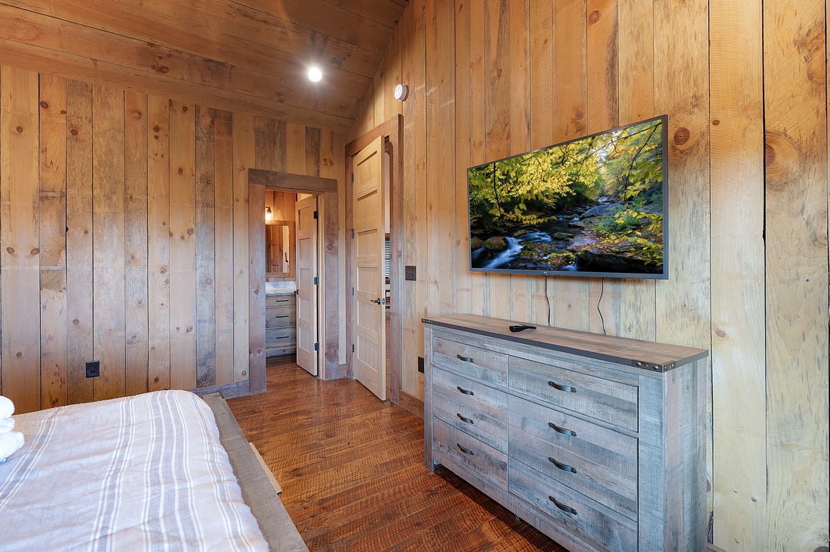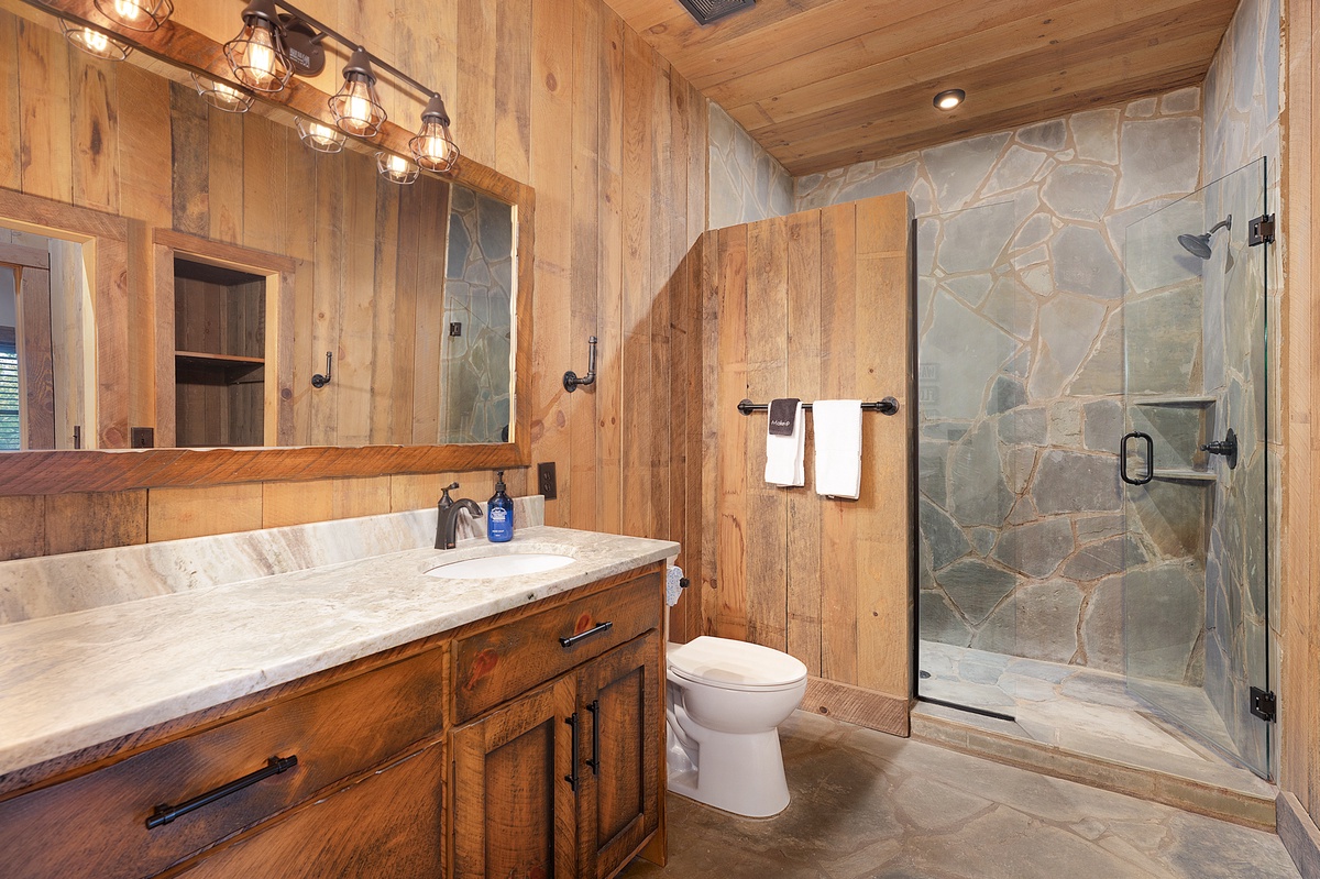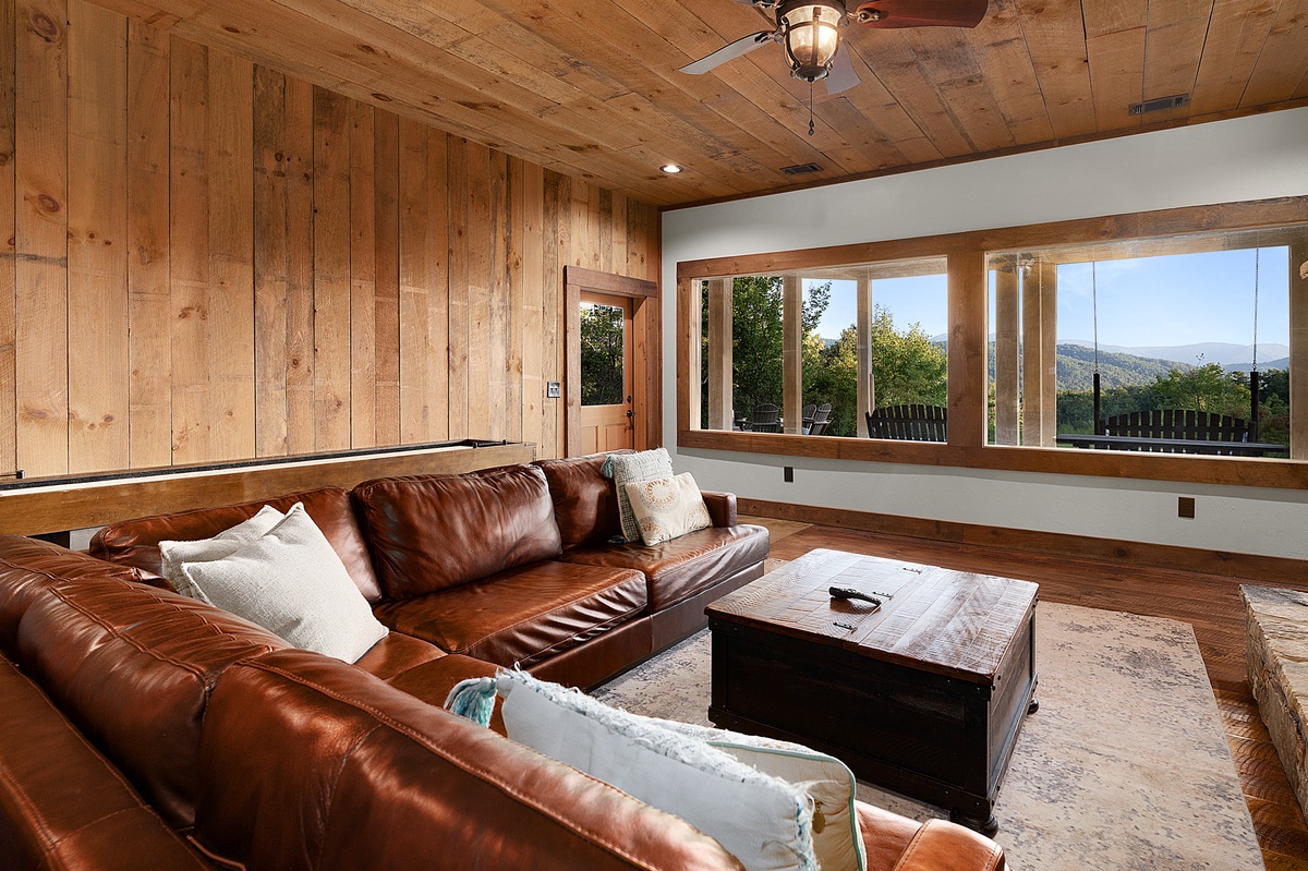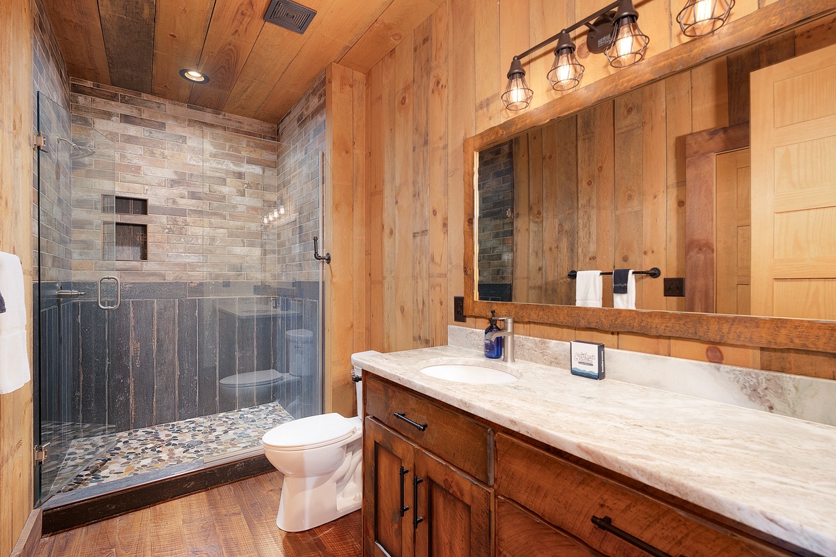 The den is located in the lower level of this beautiful cabin. Plenty is available to keep you entertained including a card/poker table and a shuffleboard table. This level has a large leather sectional perfect for watching the big game on the 55" cable TV over a gas log fireplace. Mix up your favorite cocktail at the mini bar that has a mini-fridge and sink. There is a shared walk-in shower bathroom on this level as well.