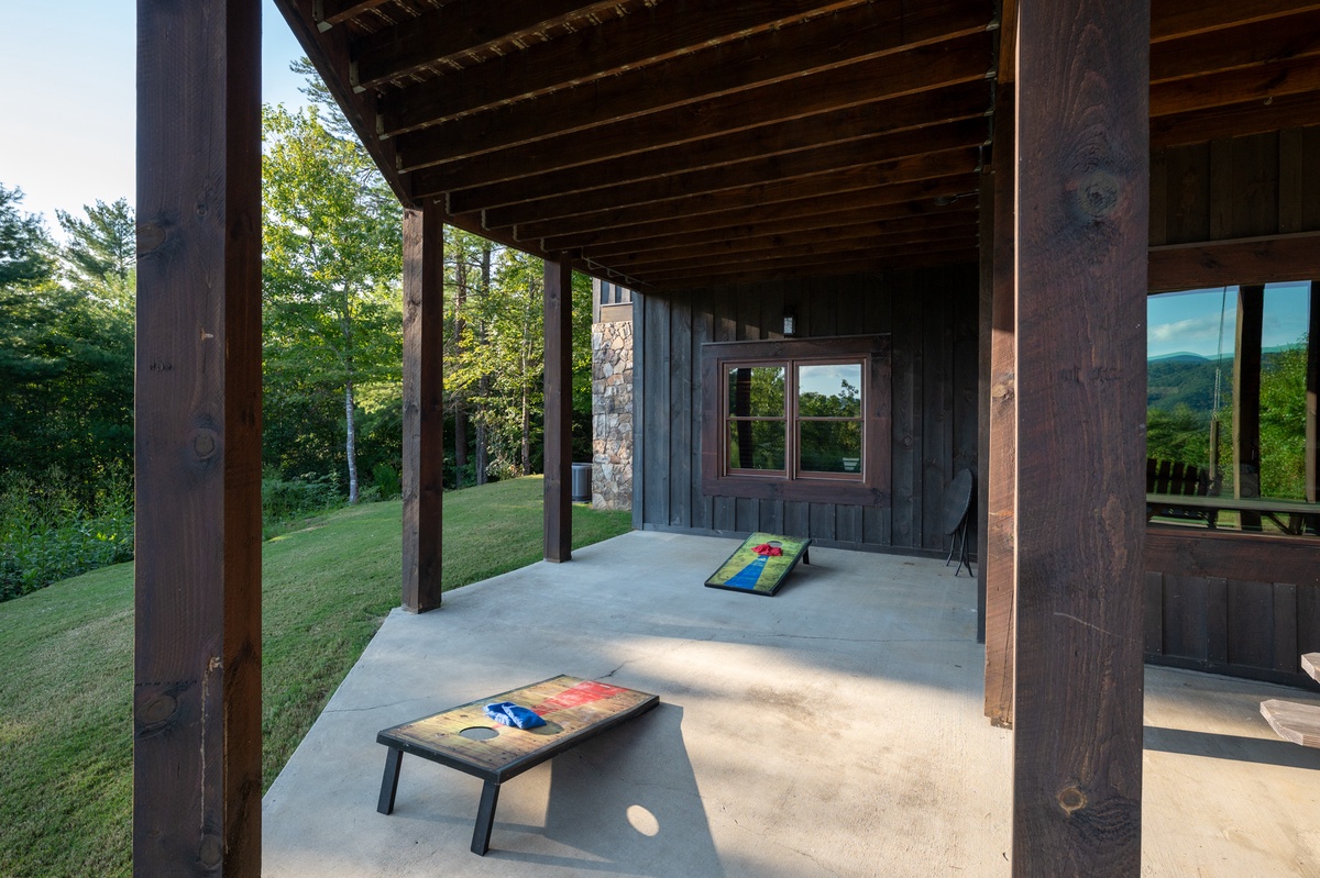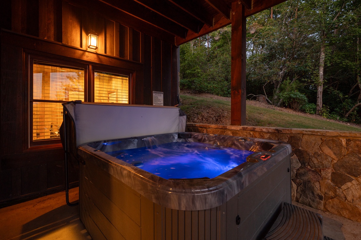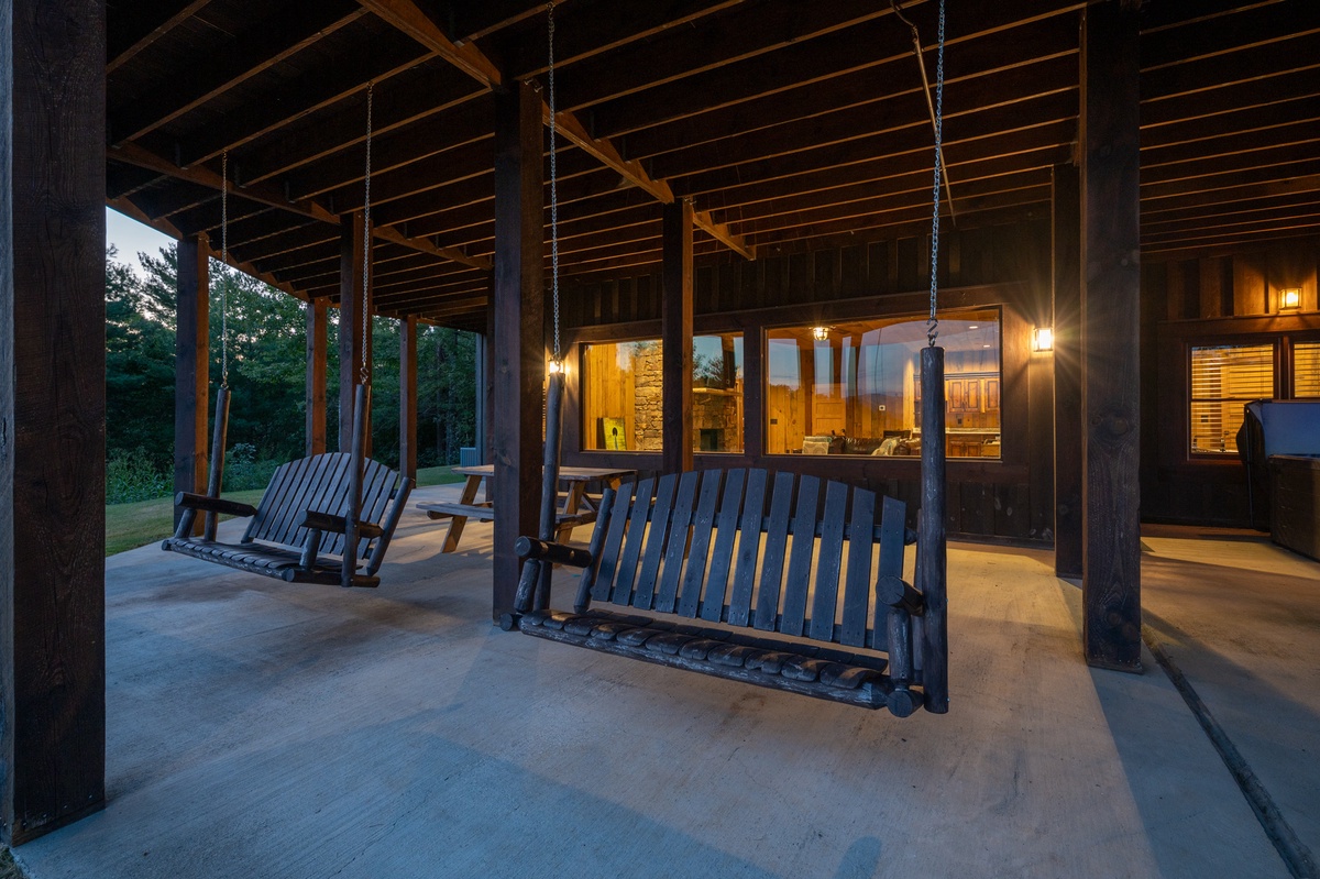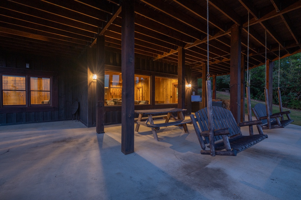 The lower level patio has a 5 person hot tub, 2 large porch swings, and corn hole boards. A must-do activity while staying at Breakaway Ridge is roasting marshmallows over the fire pit after the sun goes down and sitting comfortably on wooden Adirondack chairs.