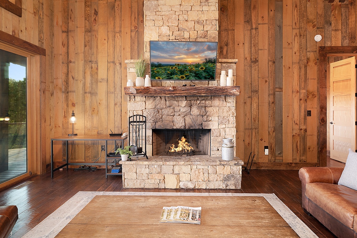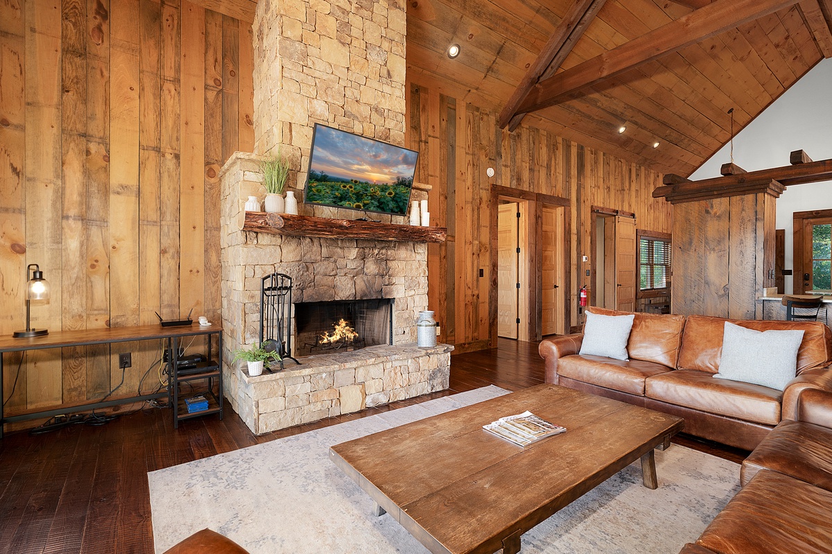 - Living room with leather furniture and a 55" cable TV over a wood-burning fireplace