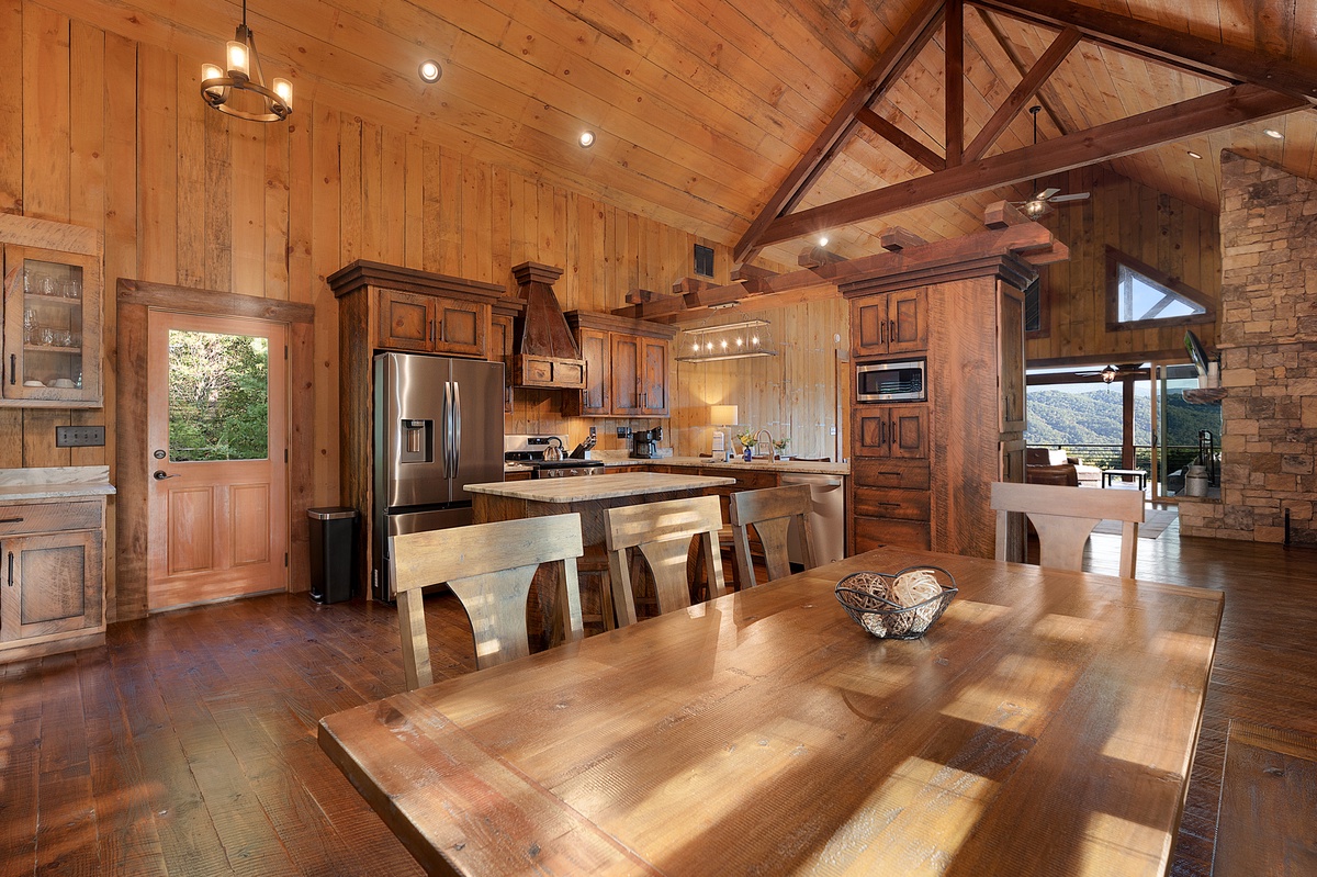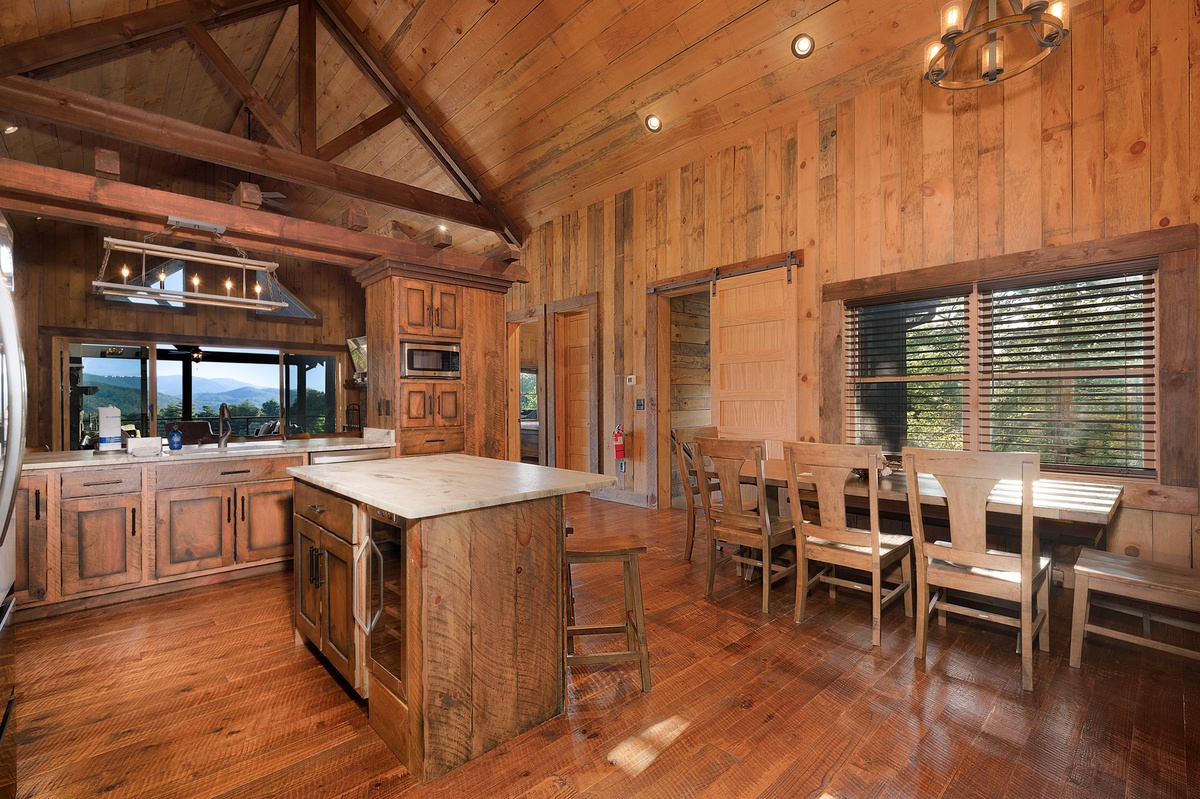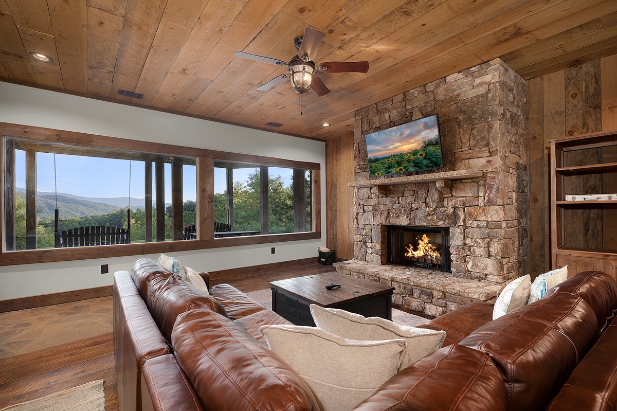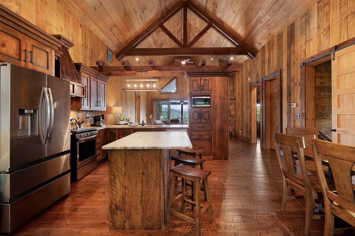 This 4 bedroom cabin boasts an open concept to entertain the whole family throughout the cabin on both levels. The first thing that will greet you walking into this gorgeous cabin is the immaculate kitchen with brand new EVERYTHING! You'll find no shortage of anything you would need to make a holiday dinner. Take it all in once to the living room, where a majestic mountain view is ready to awe you. There is comfortable leather furniture around a 55" cable TV over a wood-burning fireplace with a work desk neatly tucked into the corner for any of those "mandatory" tasks that just can't wait while you're away on vacation.