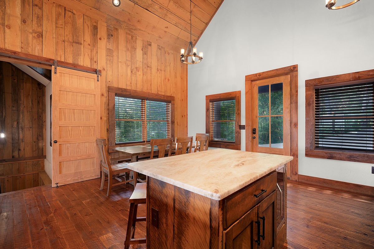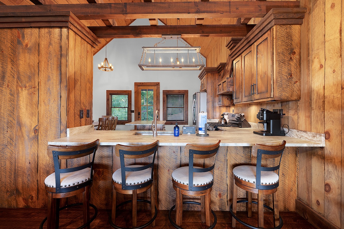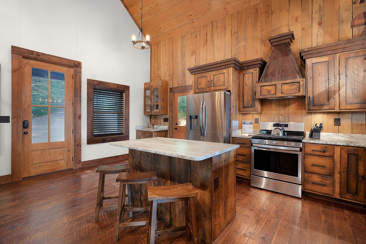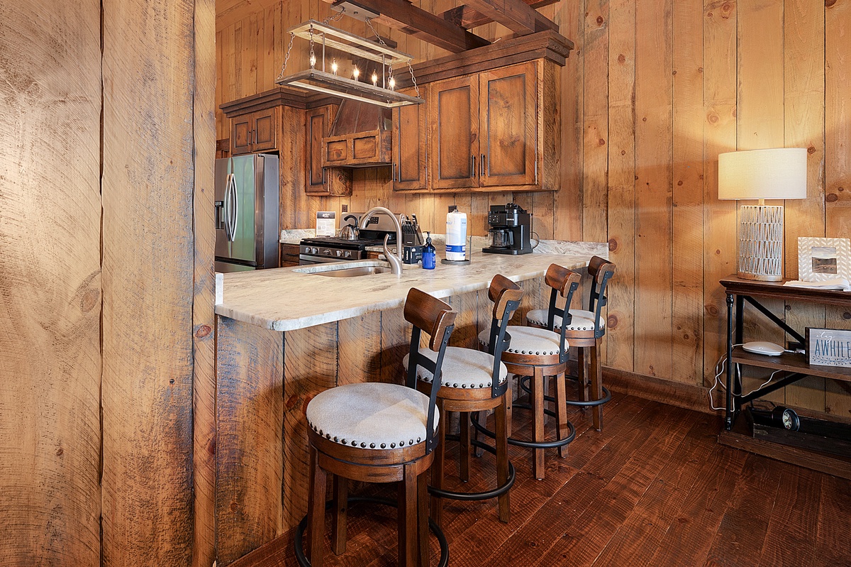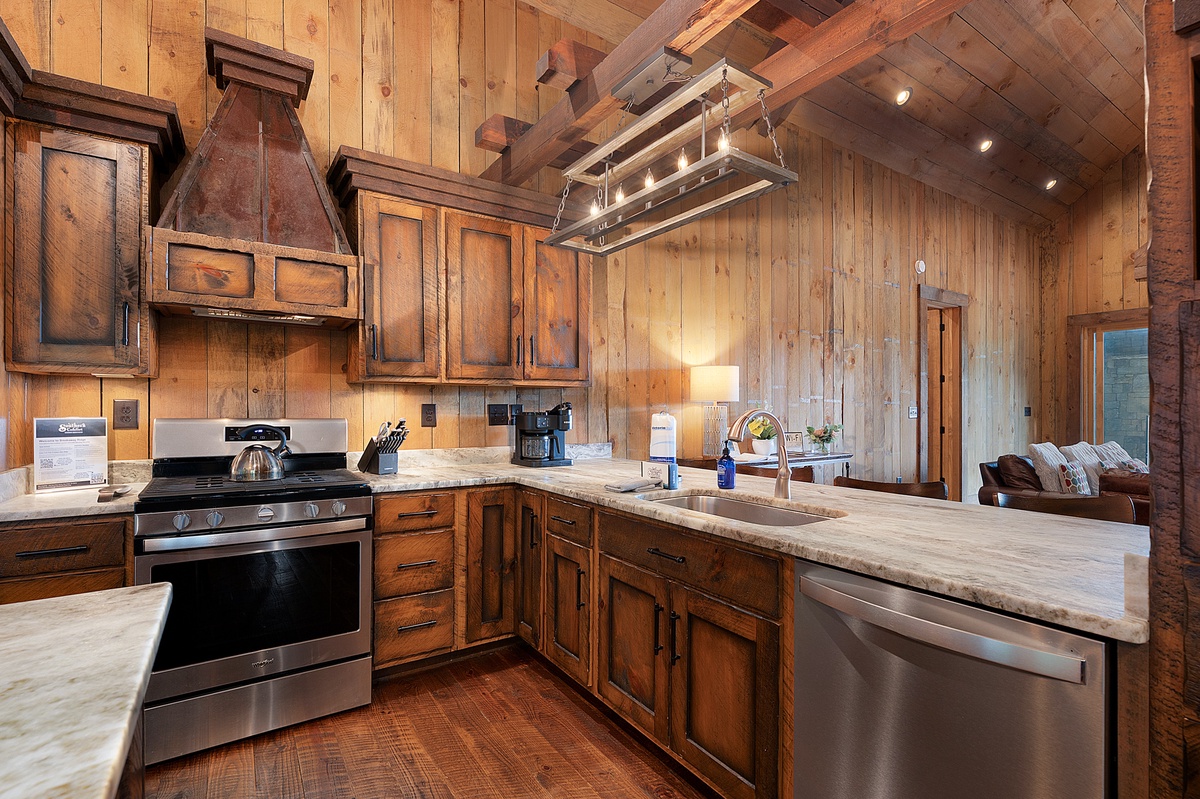 This 4 bedroom cabin boasts an open concept to entertain the whole family throughout the cabin on both levels. The first thing that will greet you walking into this gorgeous cabin is the immaculate kitchen with brand new EVERYTHING! You'll find no shortage of anything you would need to make a holiday dinner. Take it all in once to the living room, where a majestic mountain view is ready to awe you. There is comfortable leather furniture around a 55" cable TV over a wood-burning fireplace with a work desk neatly tucked into the corner for any of those "mandatory" tasks that just can't wait while you're away on vacation.