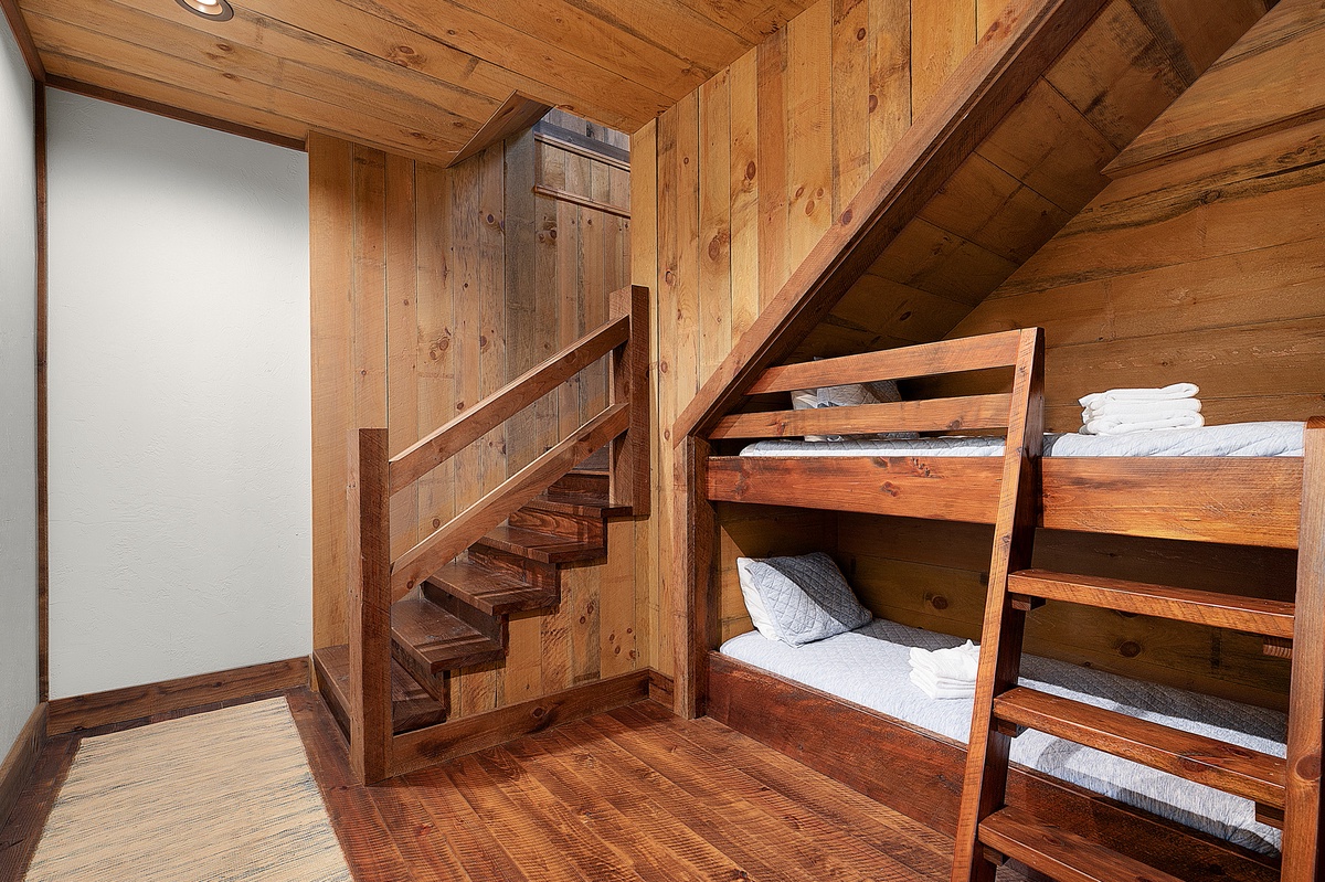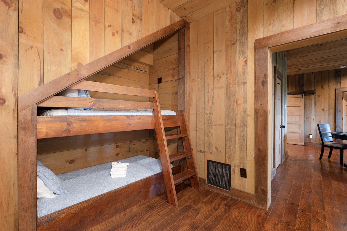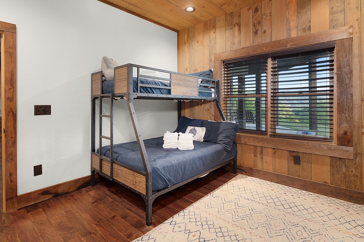 Once down to the bottom of the stairs, you will find the first set of twin bunks built into the wall. This area is considered a common space and not a bedroom, although perfectly located for great sleeping arrangements once it's time to shut the lights off. The second bunk bedroom has a full-size mattress on the bottom and a twin on the top. The final bedroom on the lower level is a queen bedroom that has a 55" cable TV and access to the shared walk-in shower bathroom.