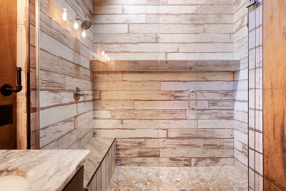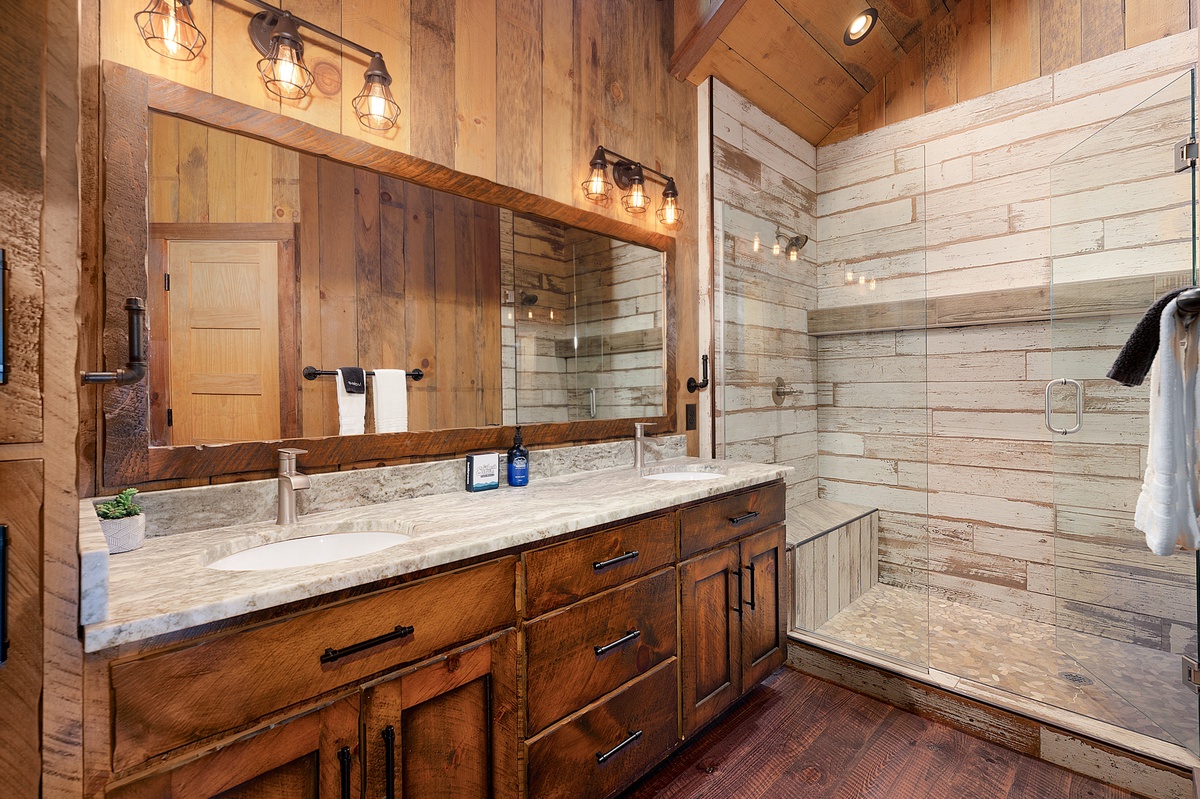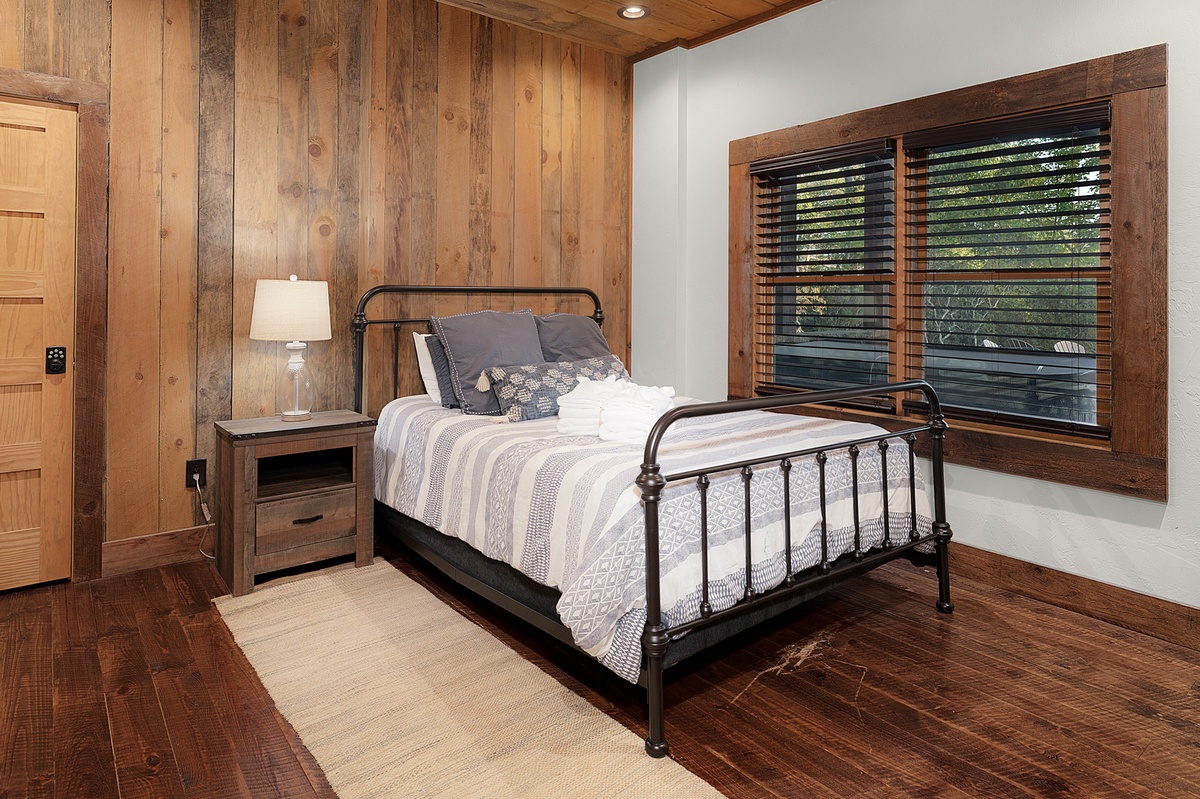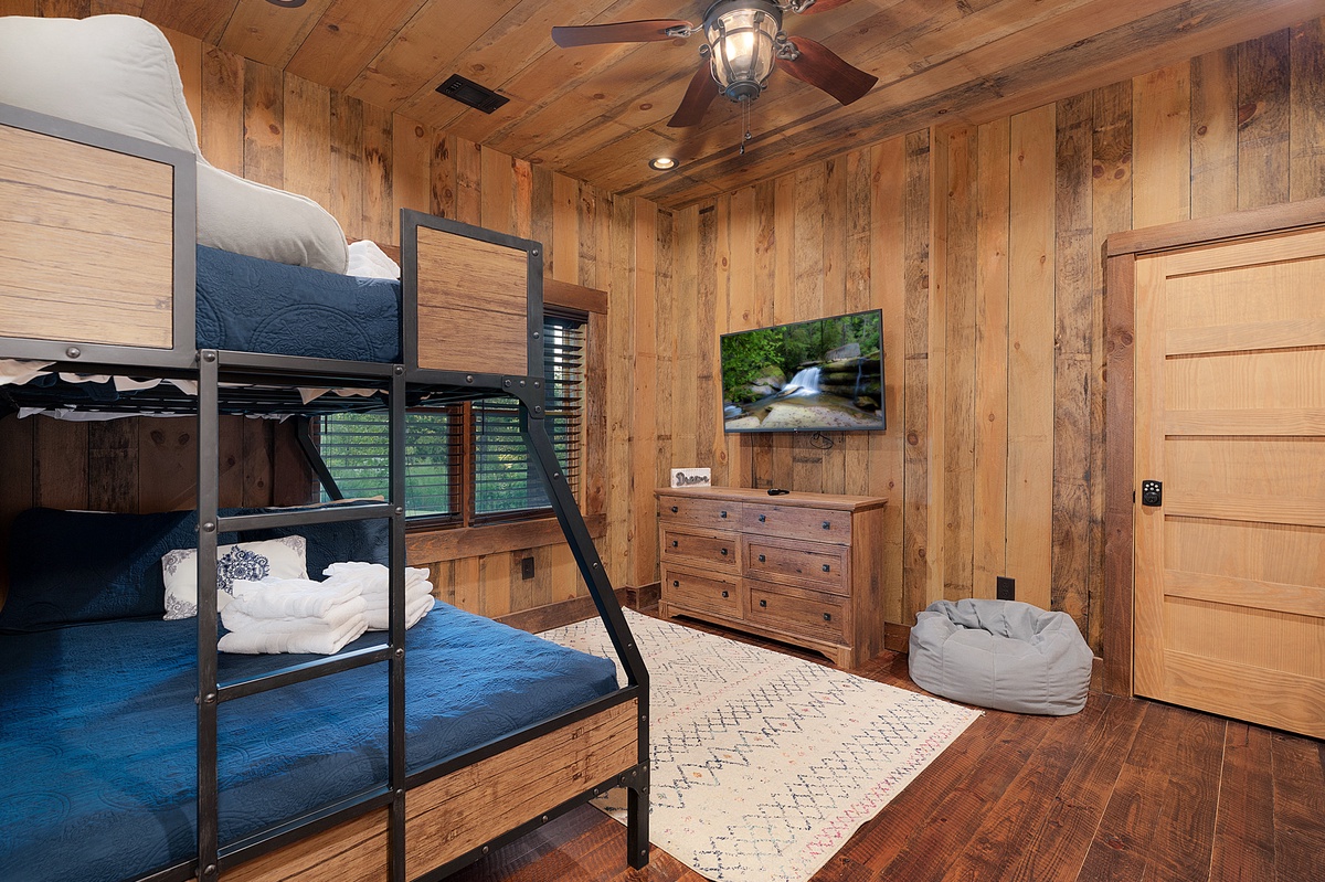 Once down to the bottom of the stairs, you will find the first set of twin bunks built into the wall. This area is considered a common space and not a bedroom, although perfectly located for great sleeping arrangements once it's time to shut the lights off. The second bunk bedroom has a full-size mattress on the bottom and a twin on the top. The final bedroom on the lower level is a queen bedroom that has a 55" cable TV and access to the shared walk-in shower bathroom.