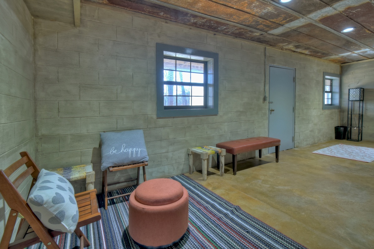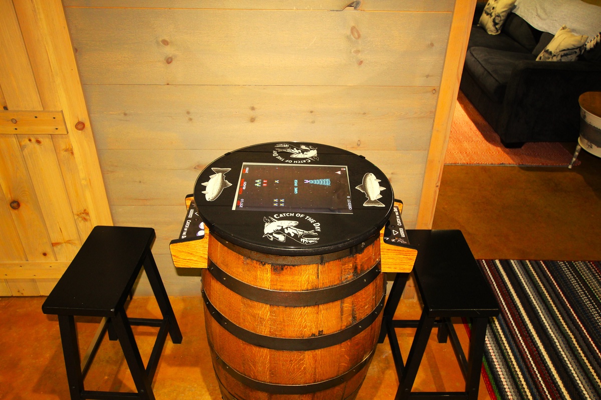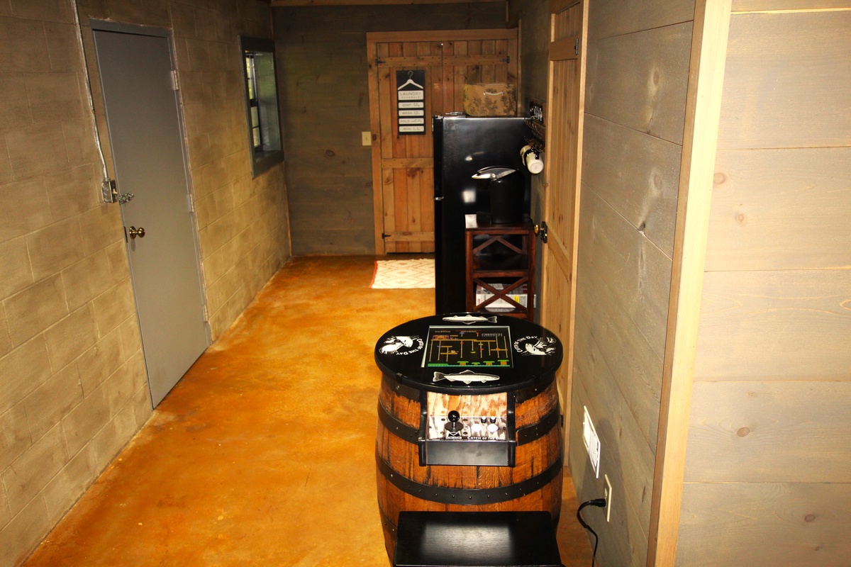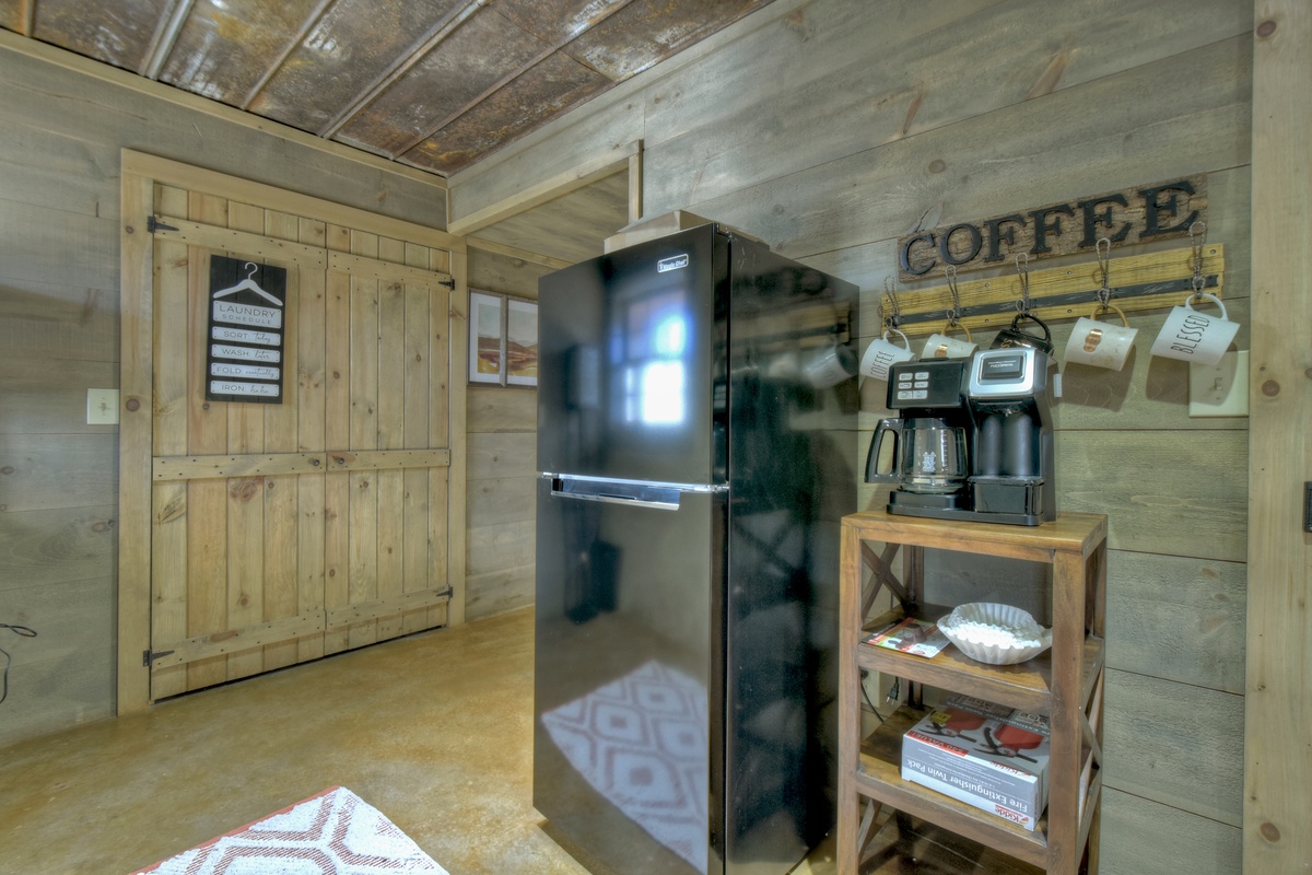 The basement level boasts an entertaining game room with arcade and board games, a living area and a full-size bedroom with a third full bath combo. There's also a fridge and coffee stand complete with a Hamilton Beach Flex/brew which allows for drip or pod coffee.
