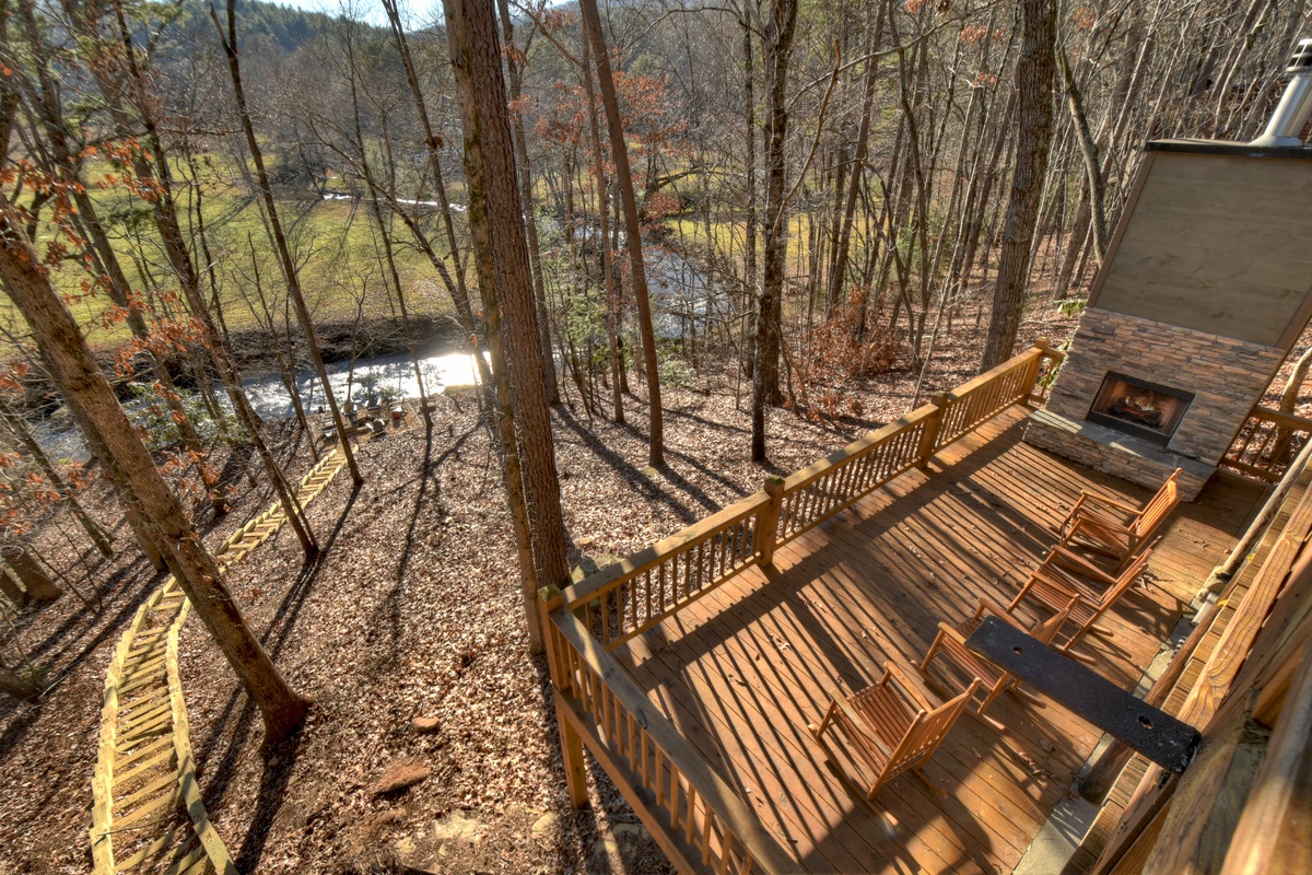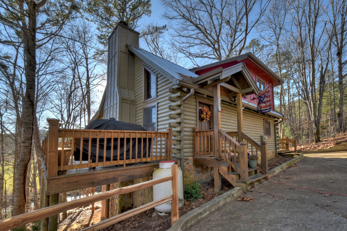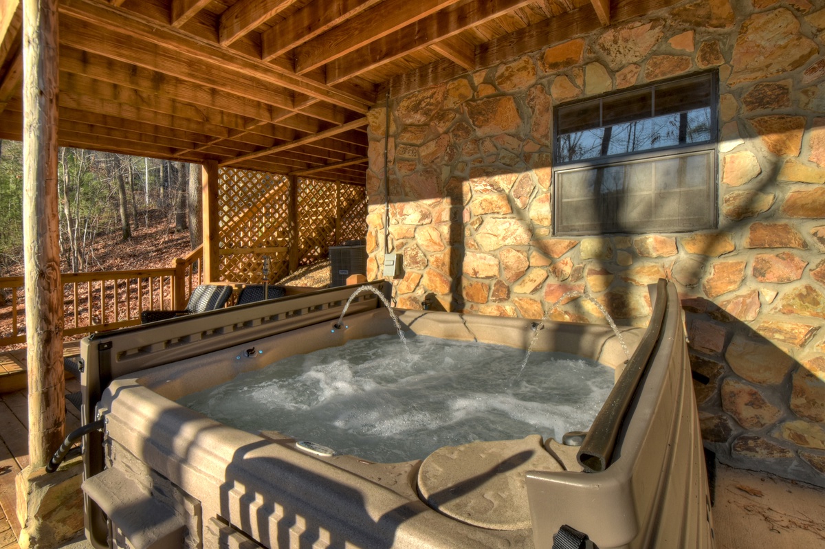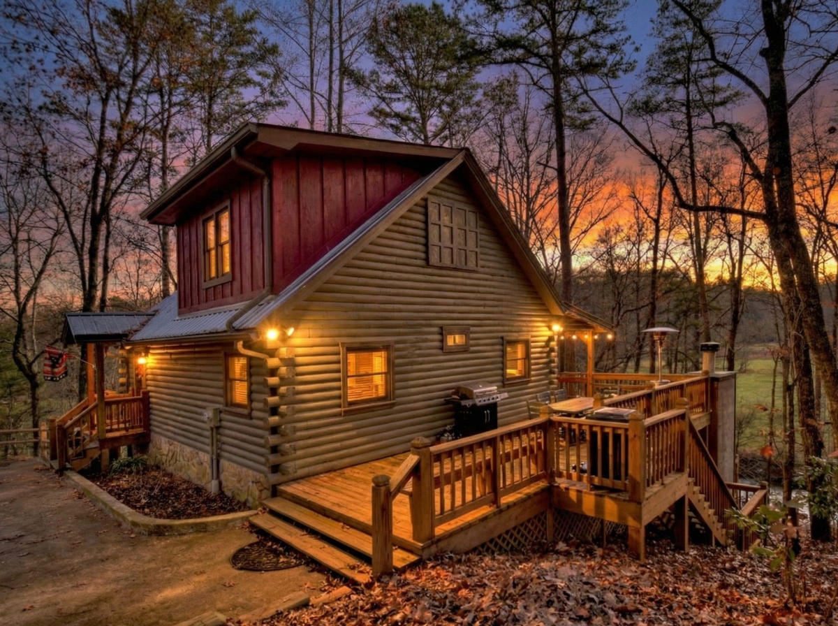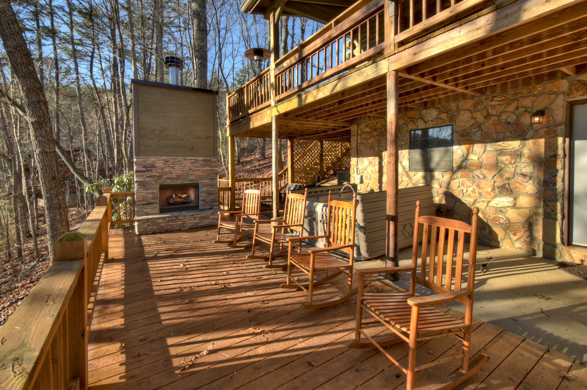 Make your way outside to the lower deck with an outdoor wood-burning fireplace where a warm and inviting hot tub that overlooks the rushing waters of Fightingtown Creek awaits you. Every day is an amazing day spending your afternoons and evenings listening to the sounds of nature and taking in the fresh mountain air as the sun goes down in the gorgeous North Georgia mountains.