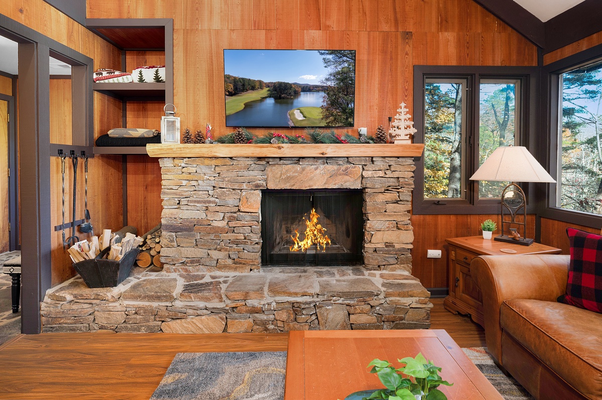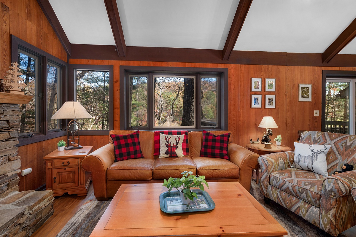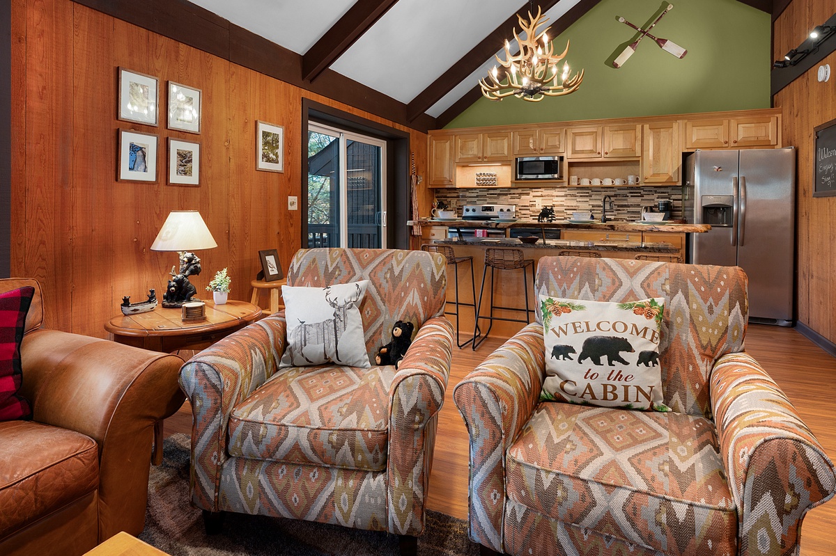 Nestled in the blissful community of Big Canoe, GA, Chickadee's Lake Lookout invites you to experience cozy mountain living with all the comforts of home. This charming retreat offers a warm and inviting living room featuring a wood-burning fireplace, live edge accents, and comfortable seating, perfect for relaxing evenings by the fire. The fully equipped kitchen boasts an island breakfast bar with seating for four, deck access, and an adjacent dining area ideal for sharing meals.