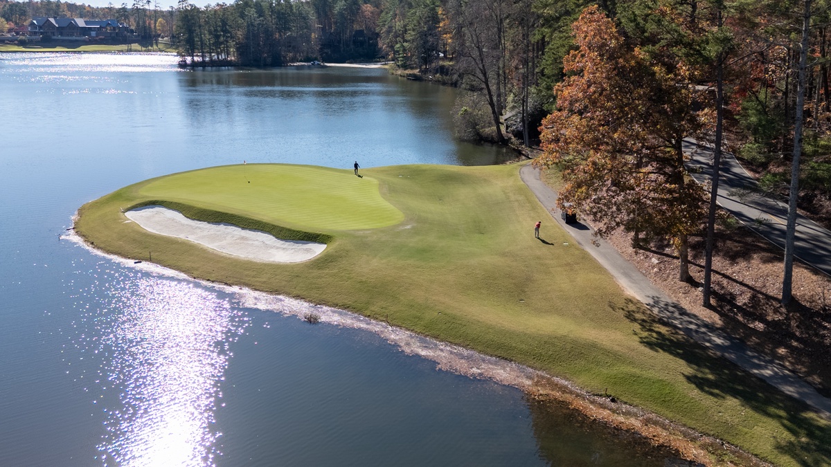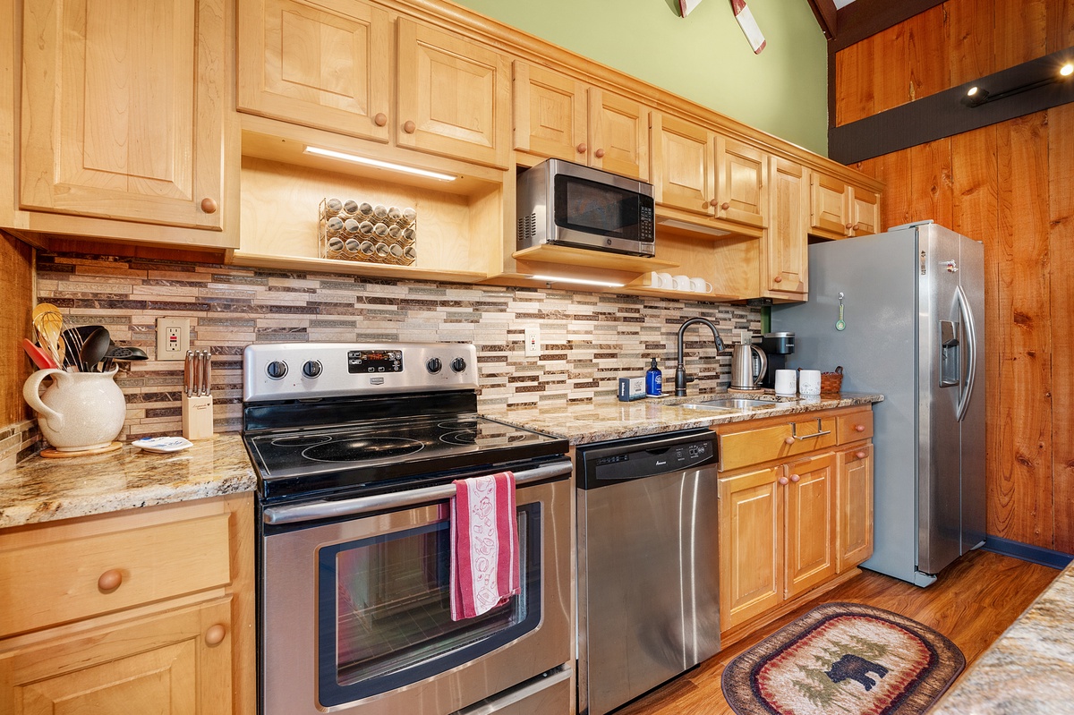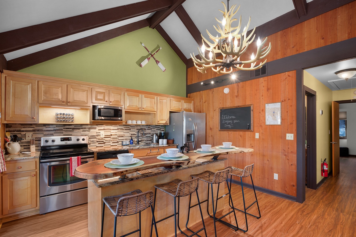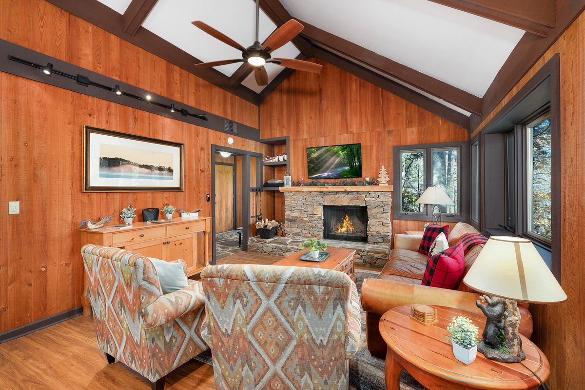 Nestled in the blissful community of Big Canoe, GA, Chickadee's Lake Lookout invites you to experience cozy mountain living with all the comforts of home. This charming retreat offers a warm and inviting living room featuring a wood-burning fireplace, live edge accents, and comfortable seating, perfect for relaxing evenings by the fire. The fully equipped kitchen boasts an island breakfast bar with seating for four, deck access, and an adjacent dining area ideal for sharing meals.