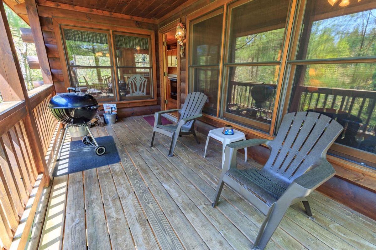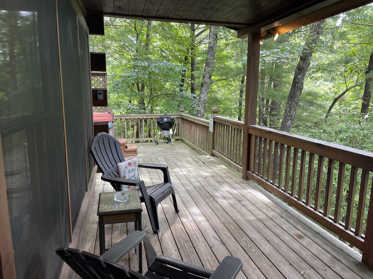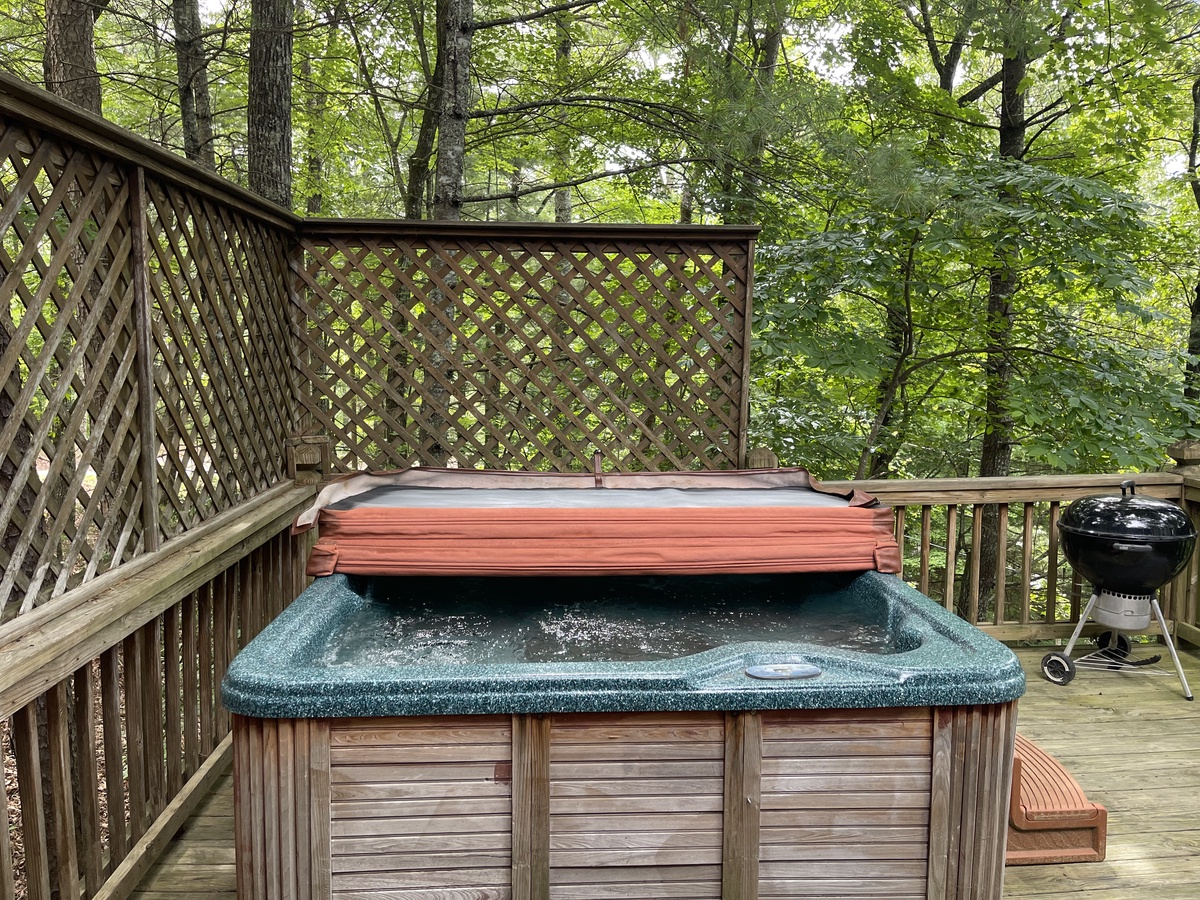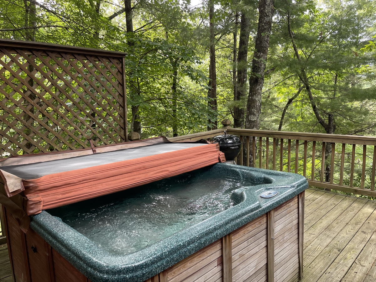 The porch/deck has a grill, an inviting hot tub and 2 chairs to enjoy your breakfast, lunch or dinner while taking in the views!