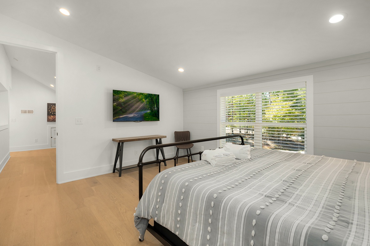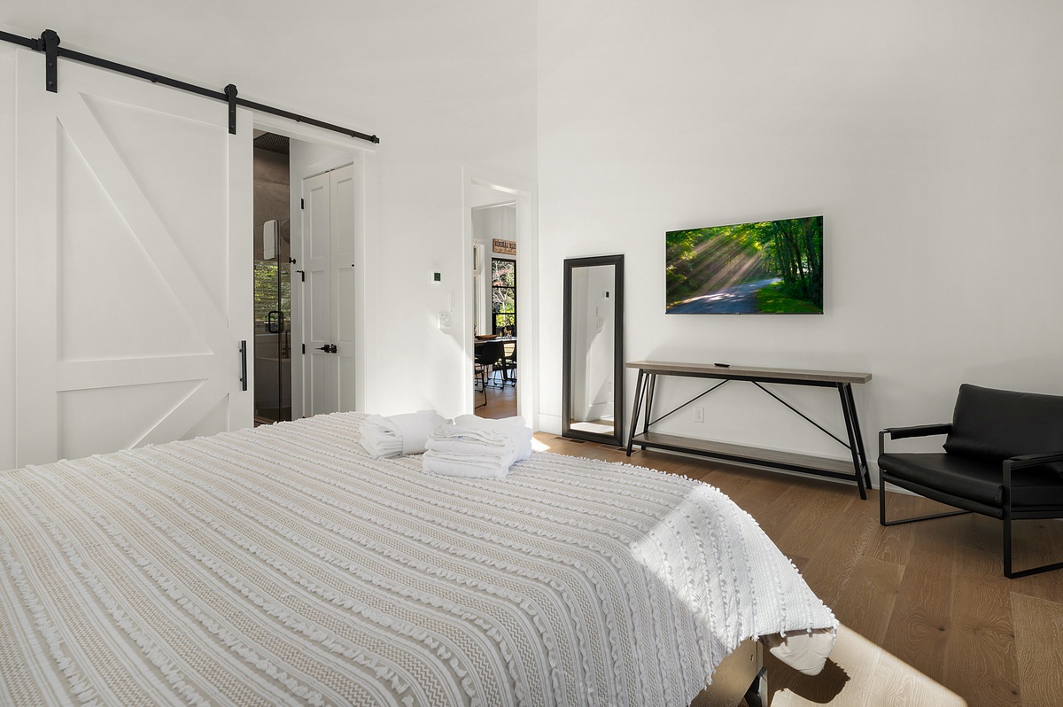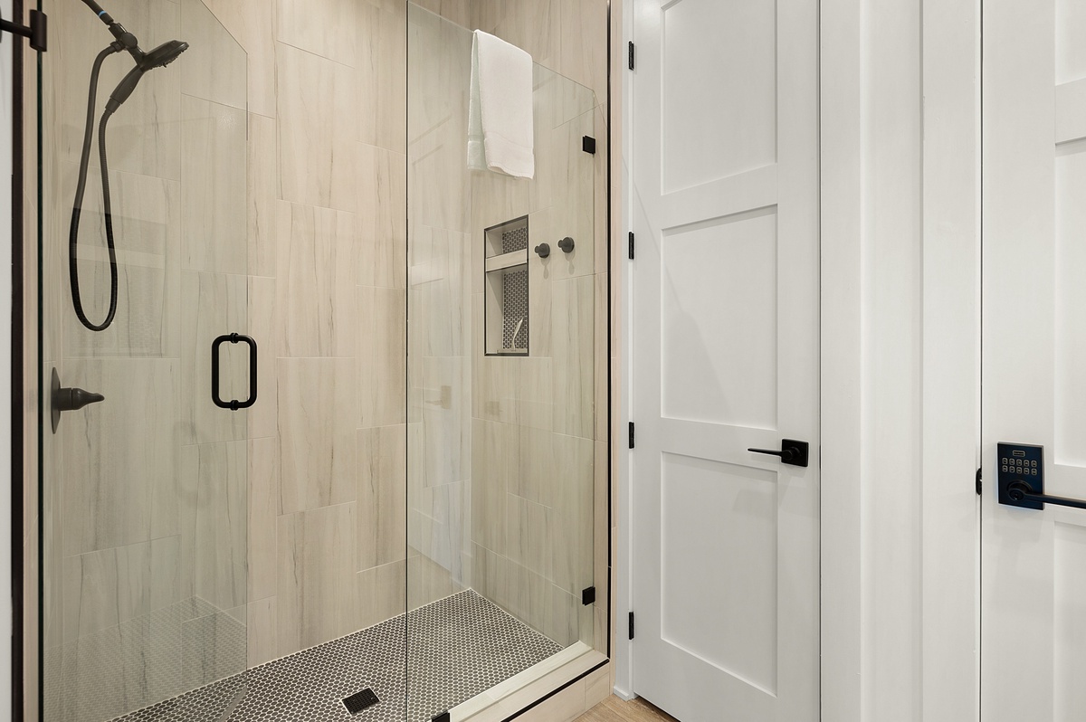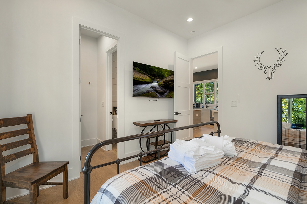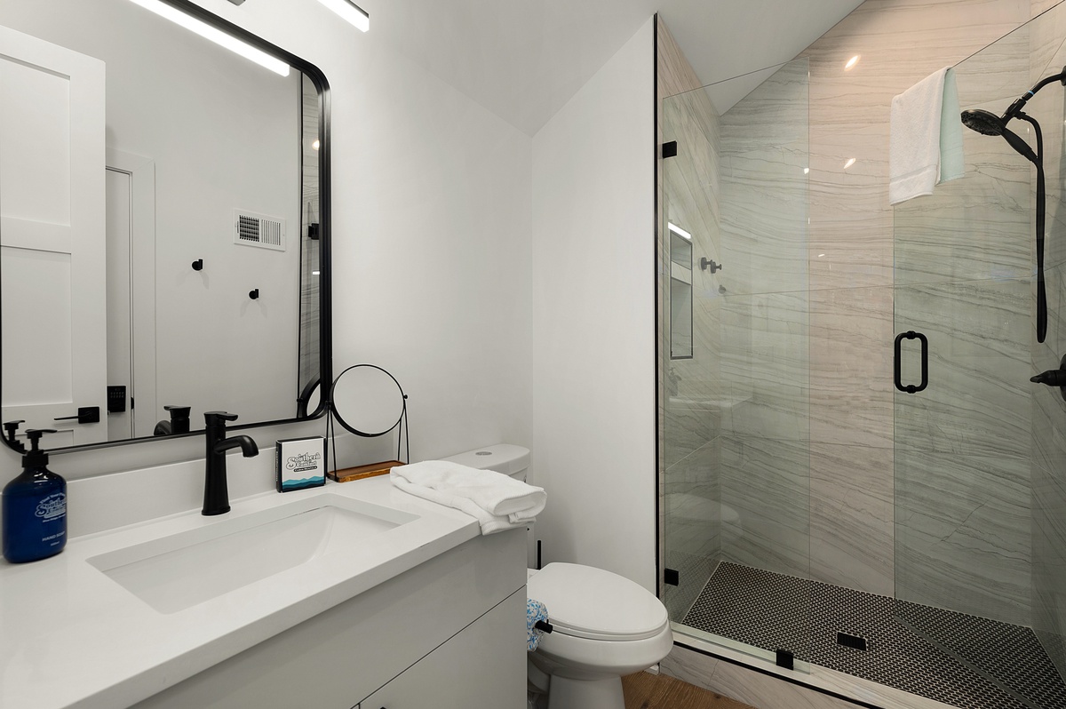 Inside, you’ll find three beautiful king suites, two are located on the entry level and one on the upper level, all offering privacy and relaxation. The main level suites feature a charming king guest bedroom with shared bathroom access, ideal for additional guests. On the lower level, a cozy bunk suite provides a fun and comfortable sleeping arrangement, with a queen bed and two twin bunks overhead. The primary suite, located on the entry level, boasts a luxurious stand-alone tub and separate shower, offering a spa-like experience, while the other bathrooms are equipped with modern showers only.