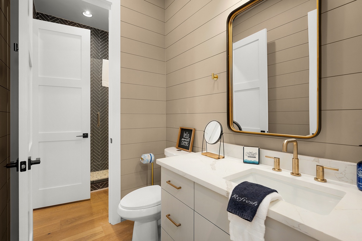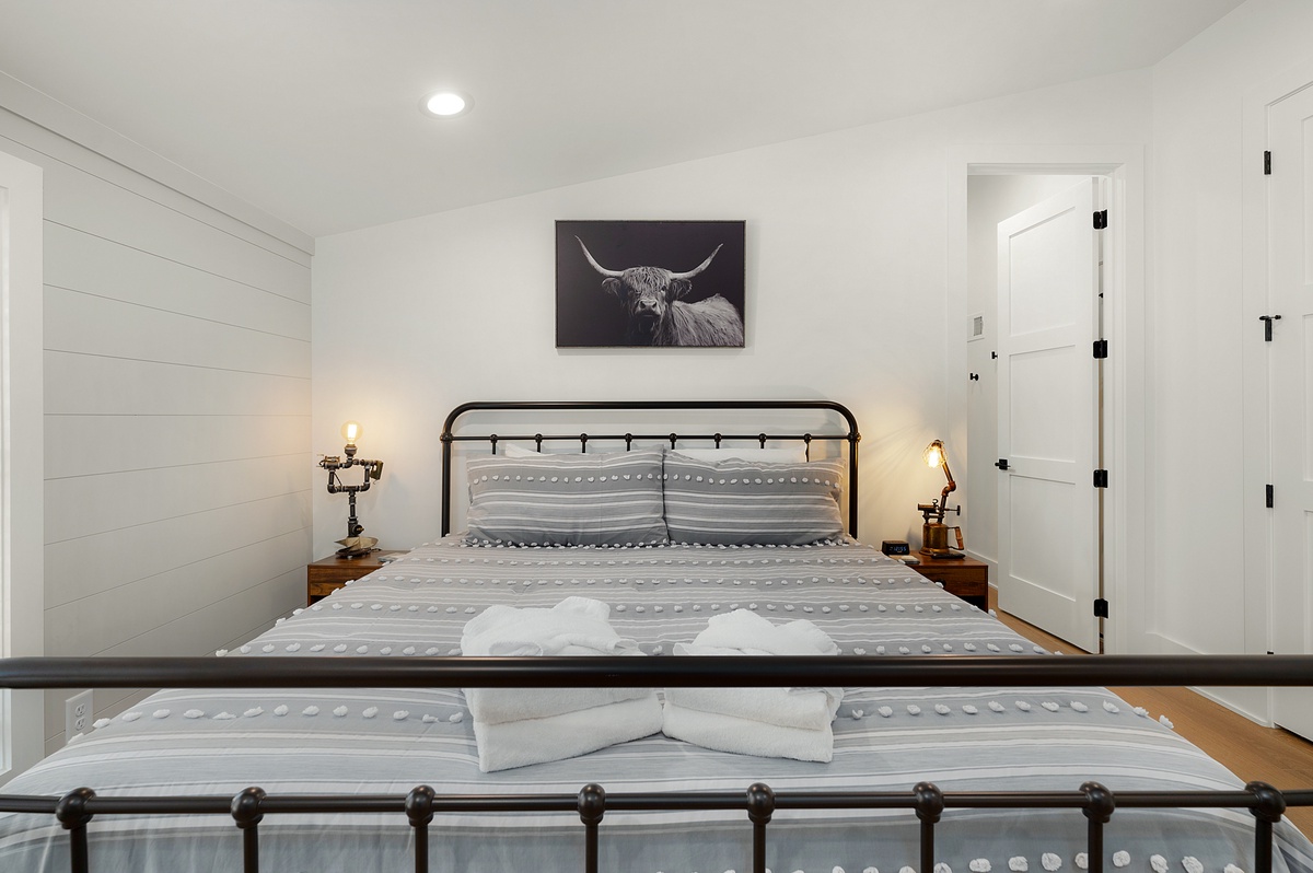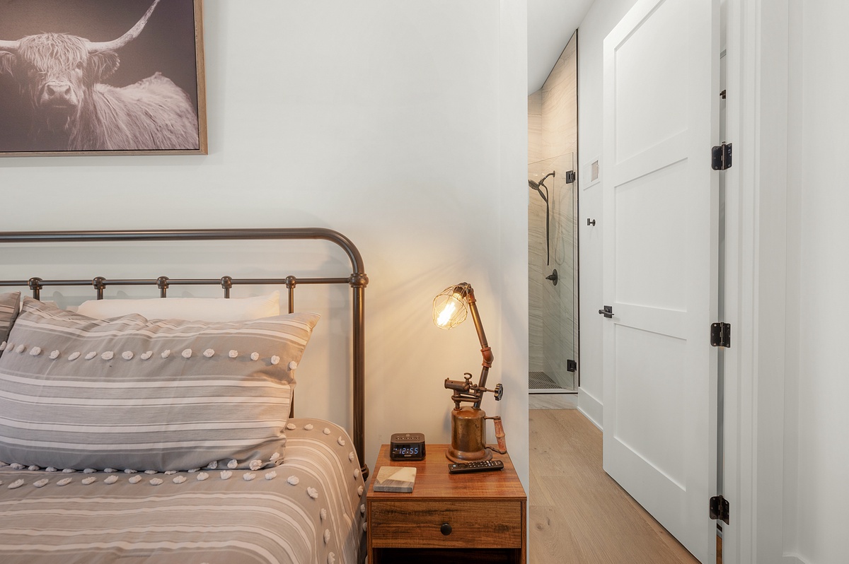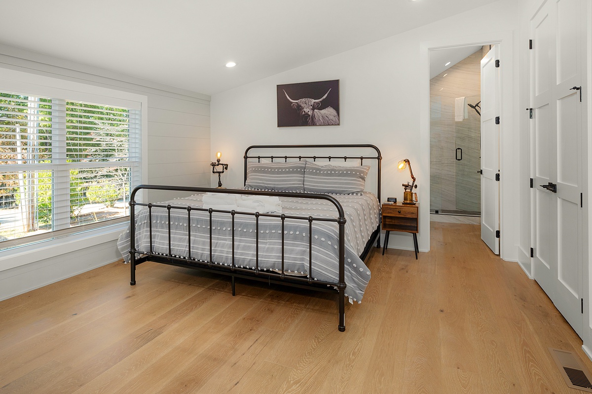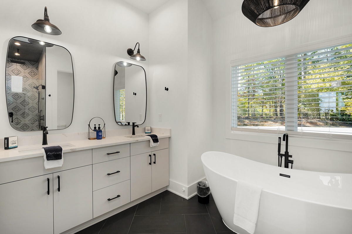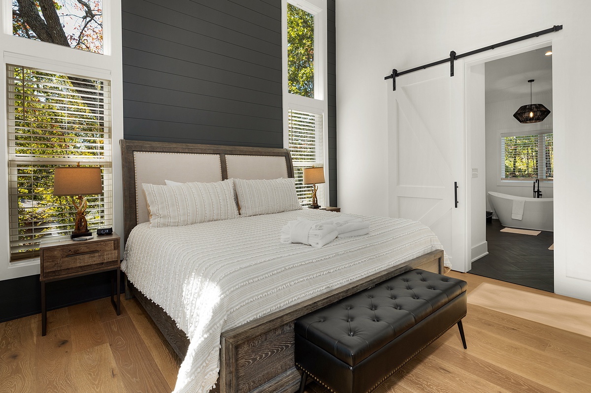 Inside, you’ll find three beautiful king suites, two are located on the entry level and one on the upper level, all offering privacy and relaxation. The main level suites feature a charming king guest bedroom with shared bathroom access, ideal for additional guests. On the lower level, a cozy bunk suite provides a fun and comfortable sleeping arrangement, with a queen bed and two twin bunks overhead. The primary suite, located on the entry level, boasts a luxurious stand-alone tub and separate shower, offering a spa-like experience, while the other bathrooms are equipped with modern showers only.