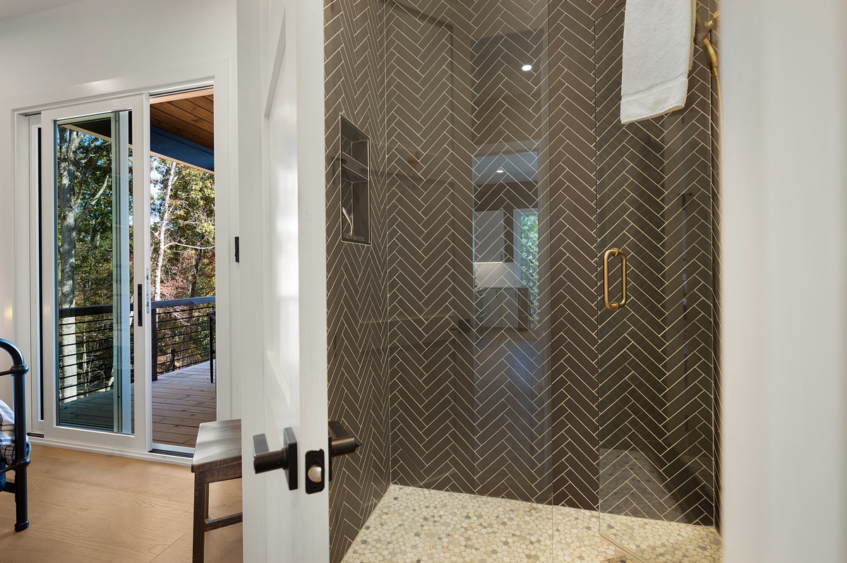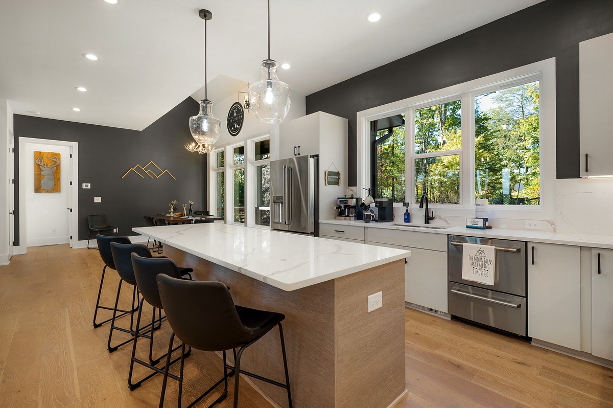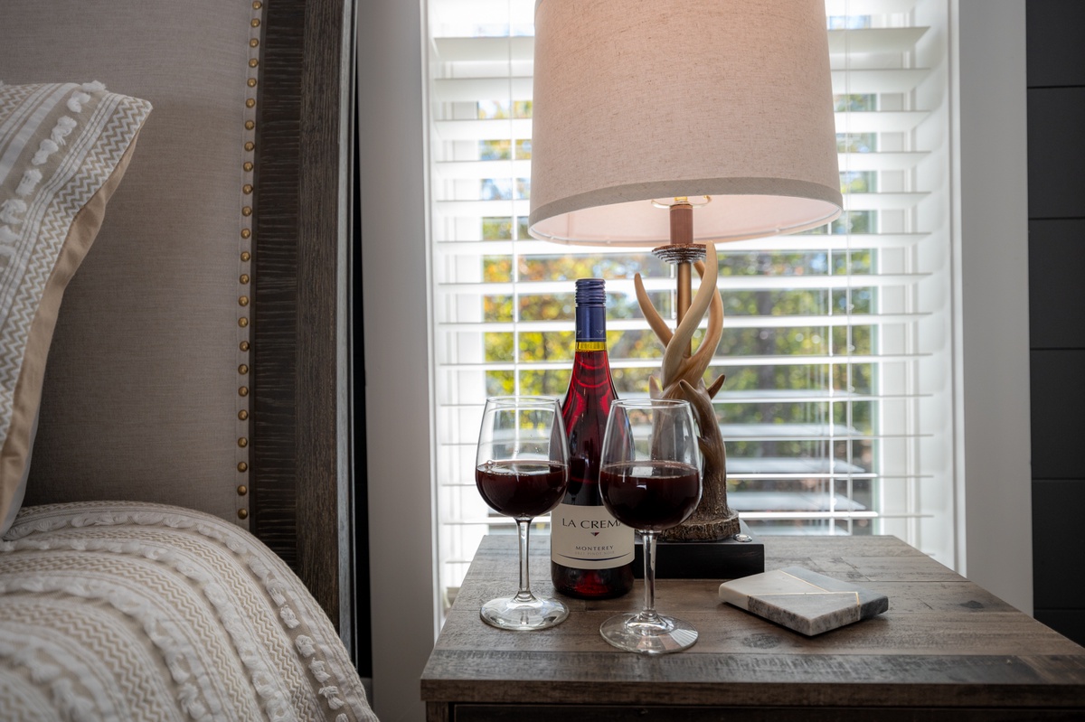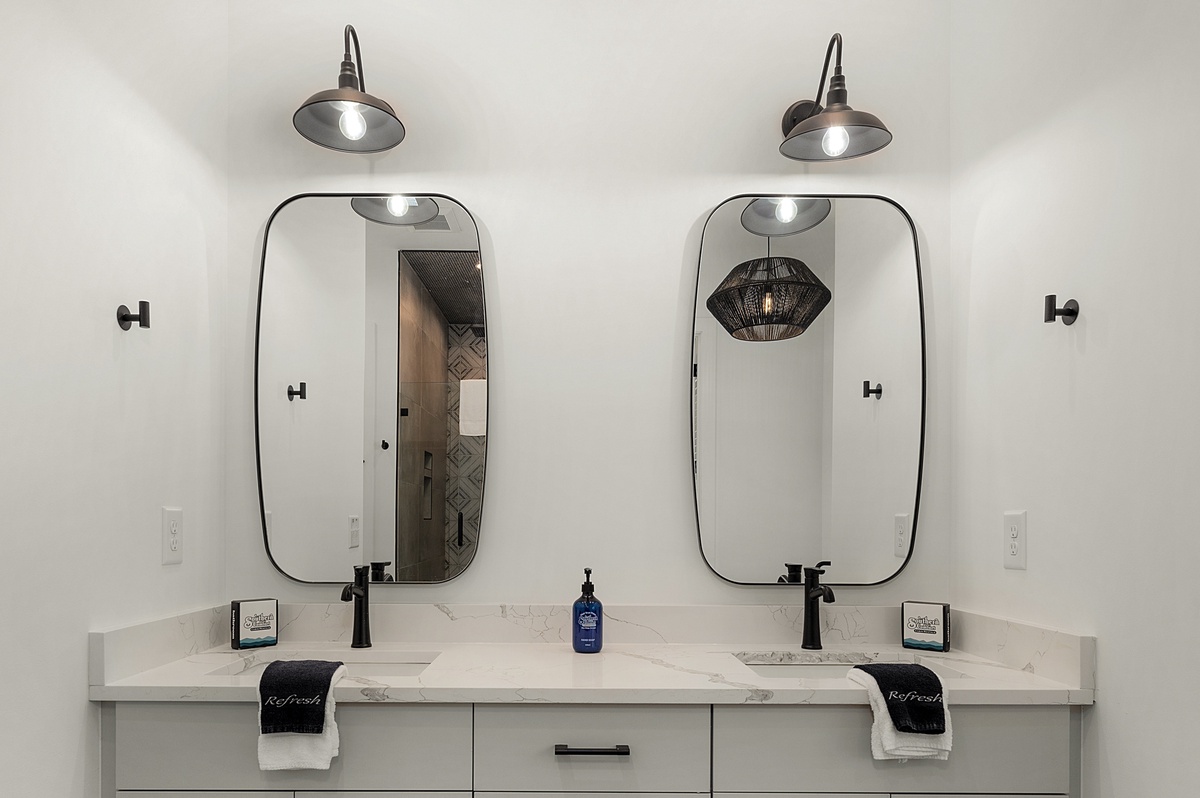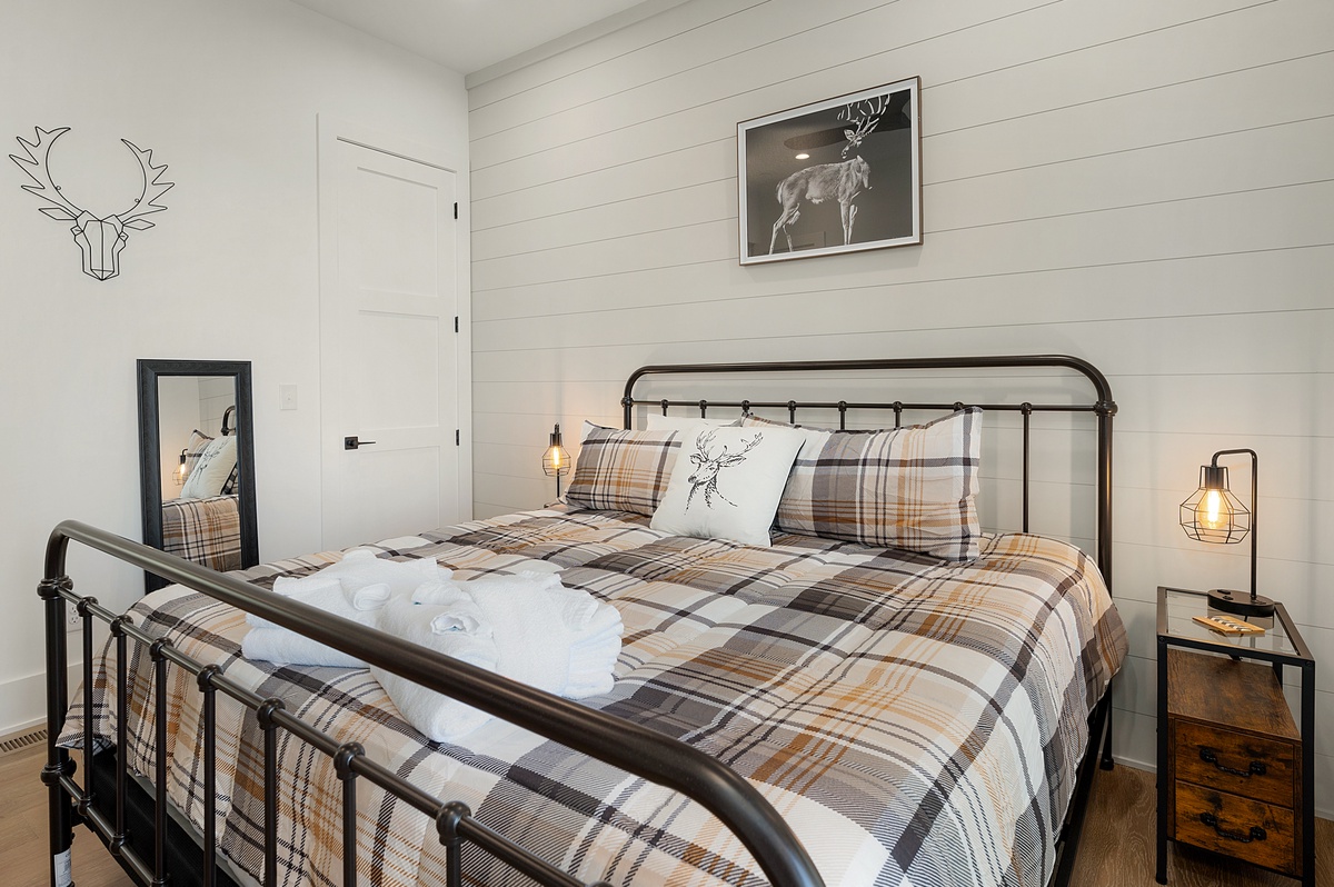 Inside, you’ll find three beautiful king suites, two are located on the entry level and one on the upper level, all offering privacy and relaxation. The main level suites feature a charming king guest bedroom with shared bathroom access, ideal for additional guests. On the lower level, a cozy bunk suite provides a fun and comfortable sleeping arrangement, with a queen bed and two twin bunks overhead. The primary suite, located on the entry level, boasts a luxurious stand-alone tub and separate shower, offering a spa-like experience, while the other bathrooms are equipped with modern showers only.