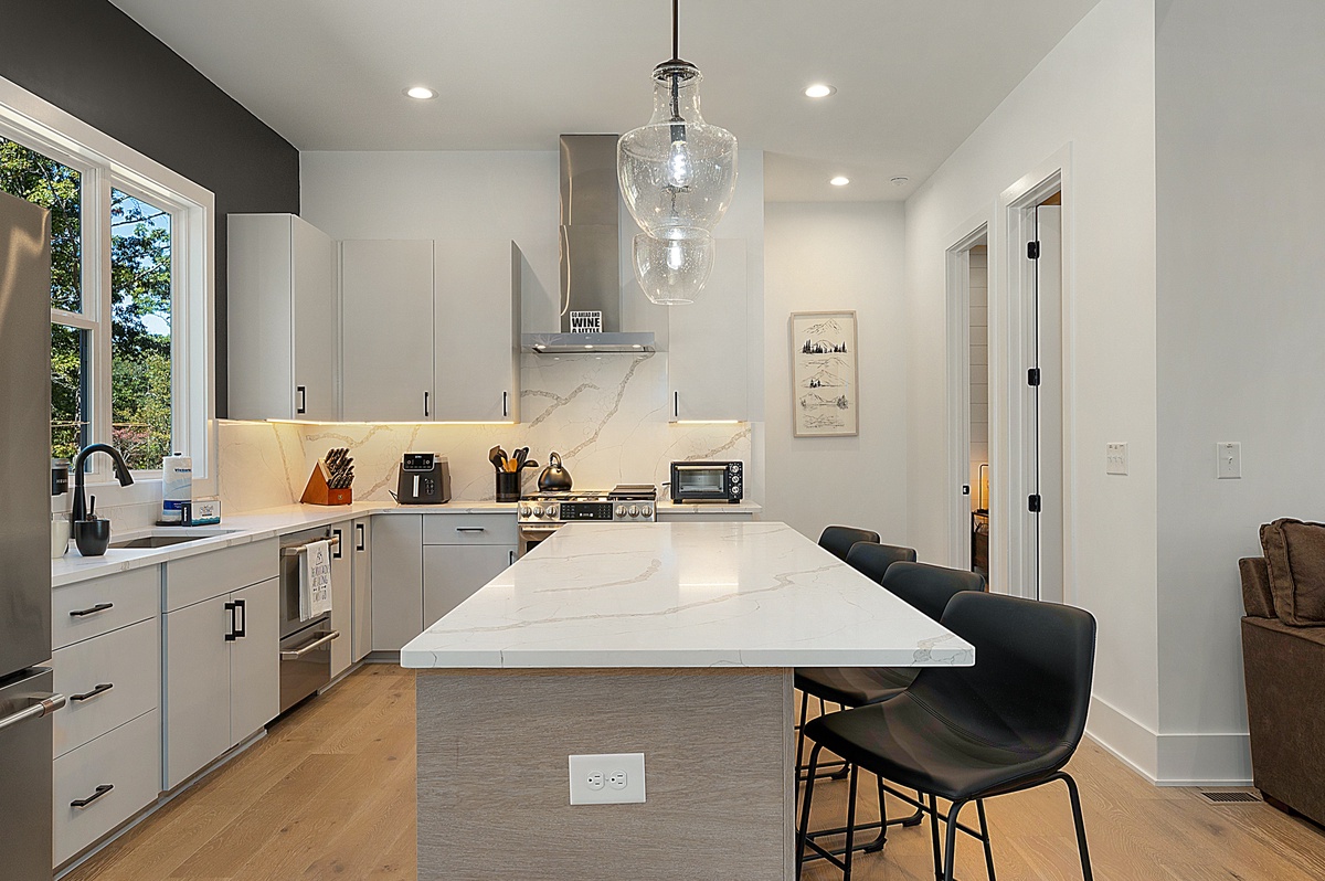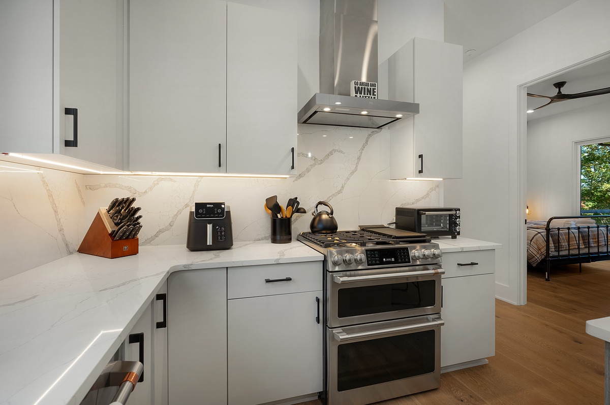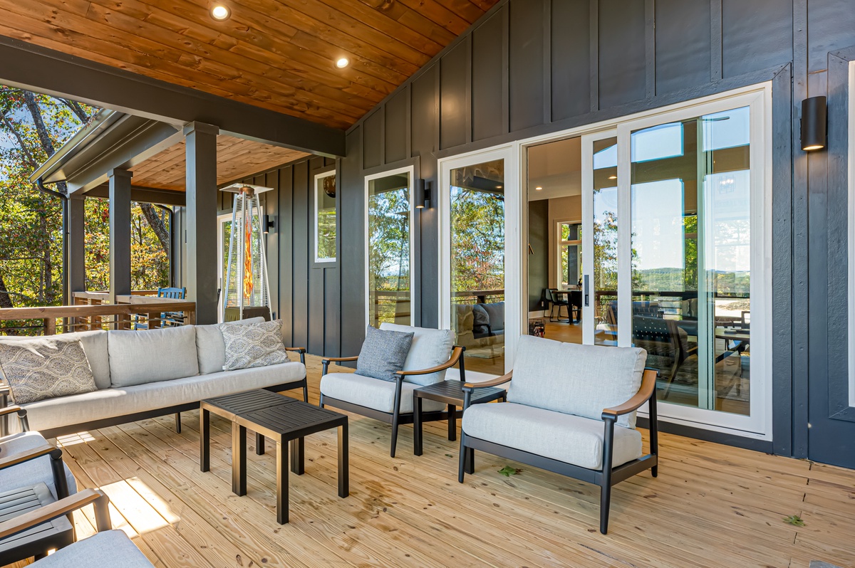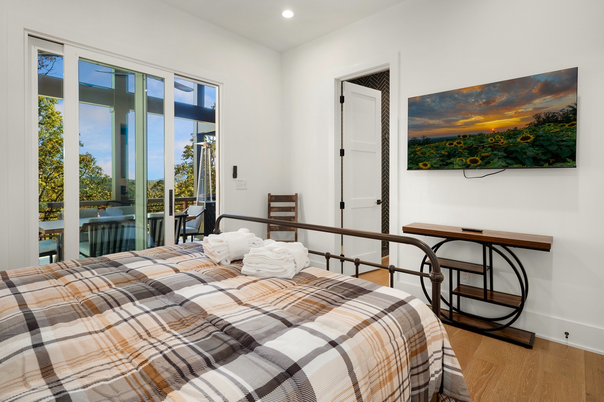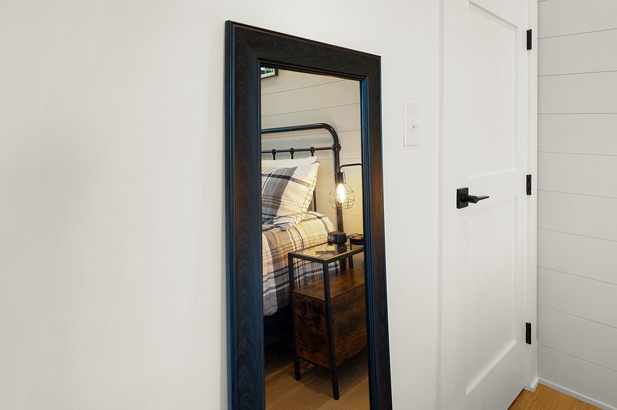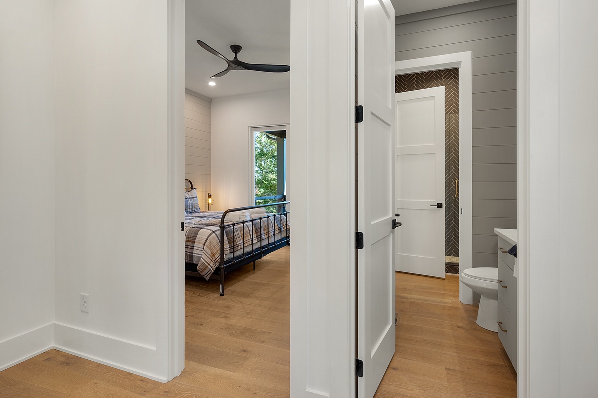 Inside, you’ll find three beautiful king suites, two are located on the entry level and one on the upper level, all offering privacy and relaxation. The main level suites feature a charming king guest bedroom with shared bathroom access, ideal for additional guests. On the lower level, a cozy bunk suite provides a fun and comfortable sleeping arrangement, with a queen bed and two twin bunks overhead. The primary suite, located on the entry level, boasts a luxurious stand-alone tub and separate shower, offering a spa-like experience, while the other bathrooms are equipped with modern showers only.