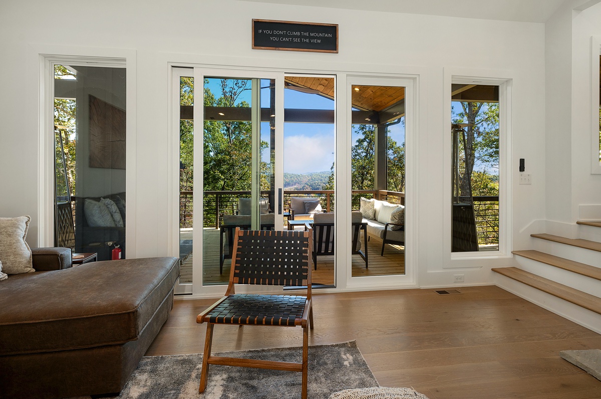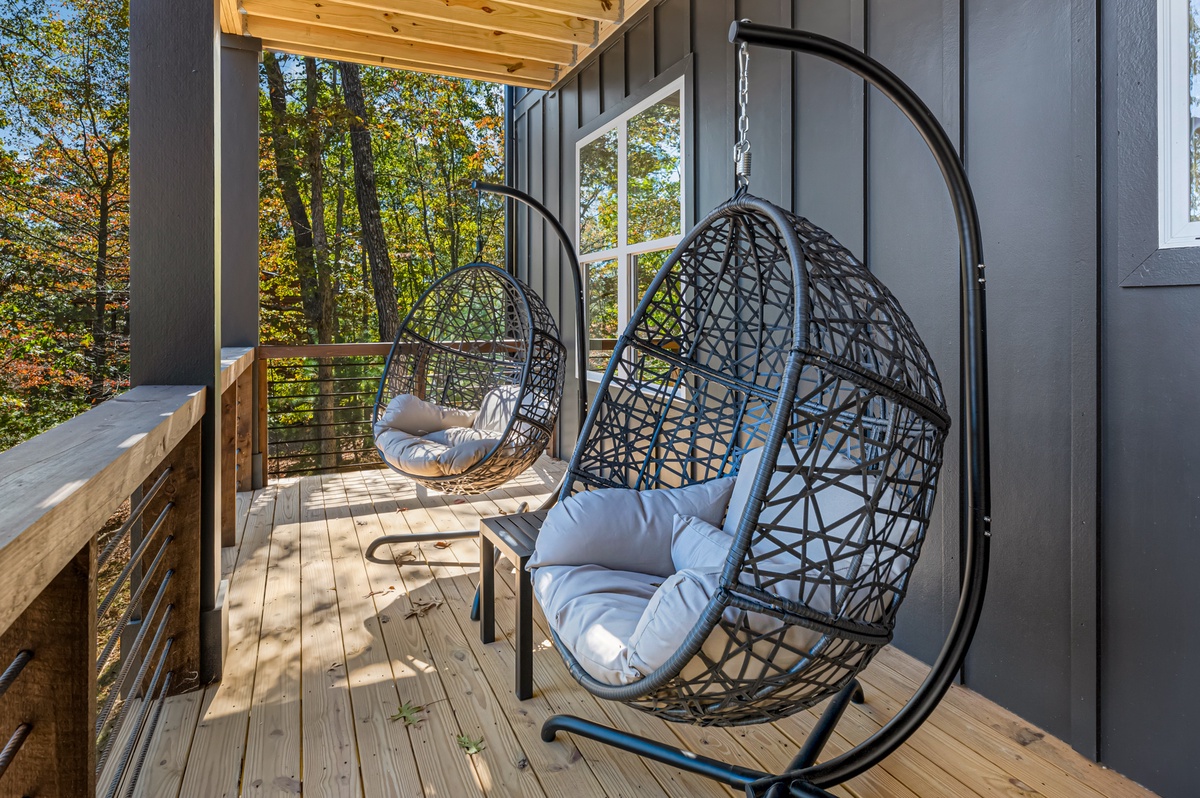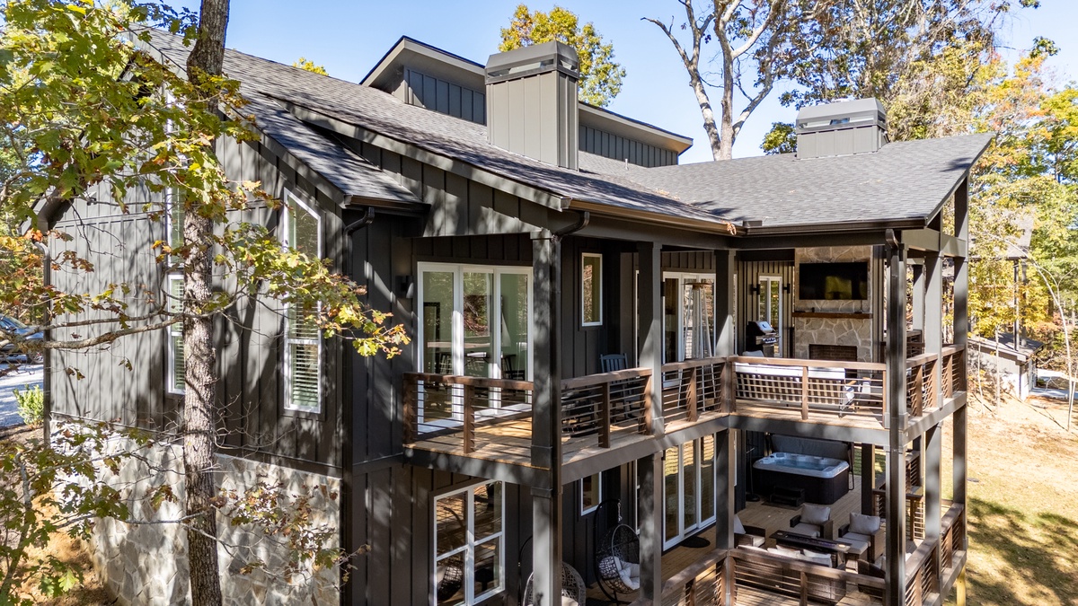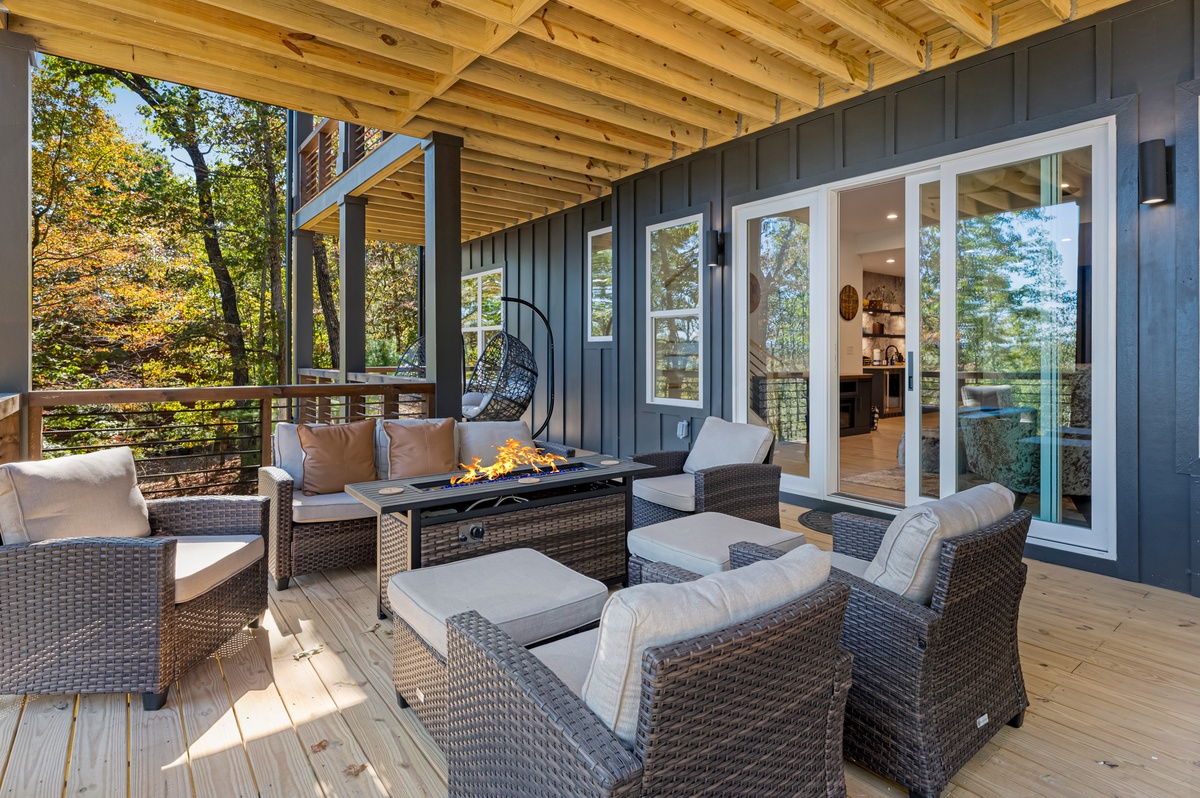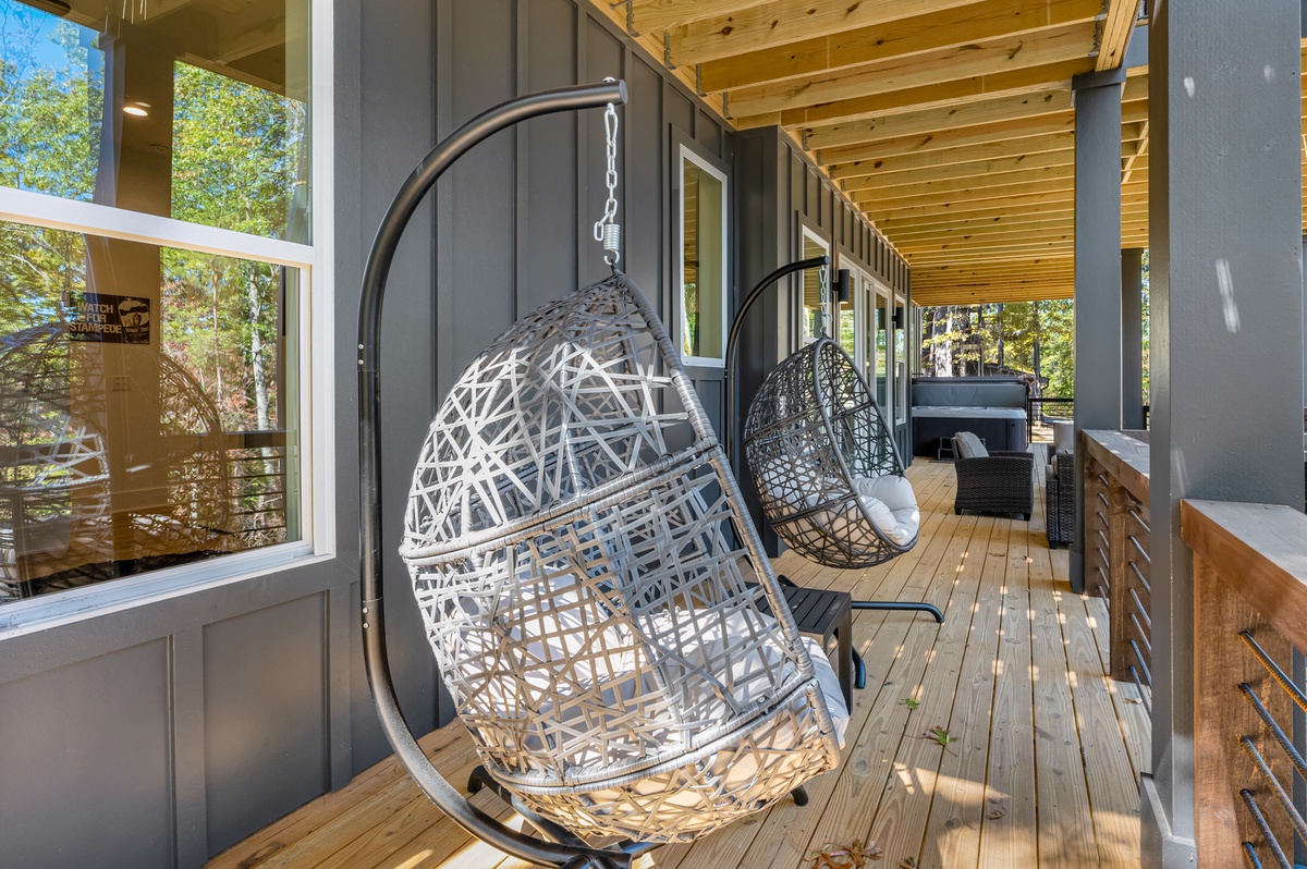 The outdoor spaces are just as inviting. The entry-level deck offers covered outdoor dining for six, complete with a gas fireplace and TV above, perfect for al fresco meals or cozy evenings in front of the fire. Both king suites on the entry level have direct access to this deck, making it easy to step out and take in the breathtaking mountain views. On the lower-level deck, you’ll find a hot tub, gas firepit table with seating, and charming hanging egg basket chairs, creating a serene setting to enjoy the crisp mountain air.
