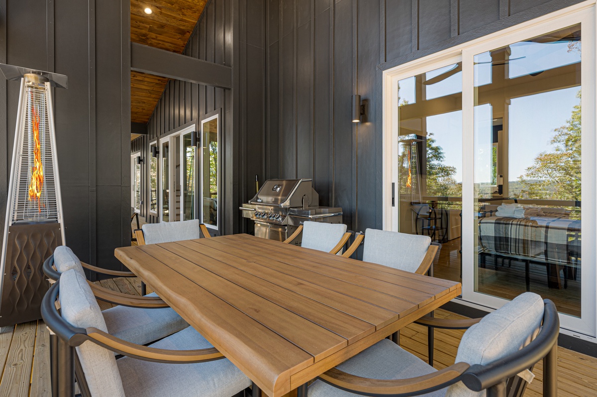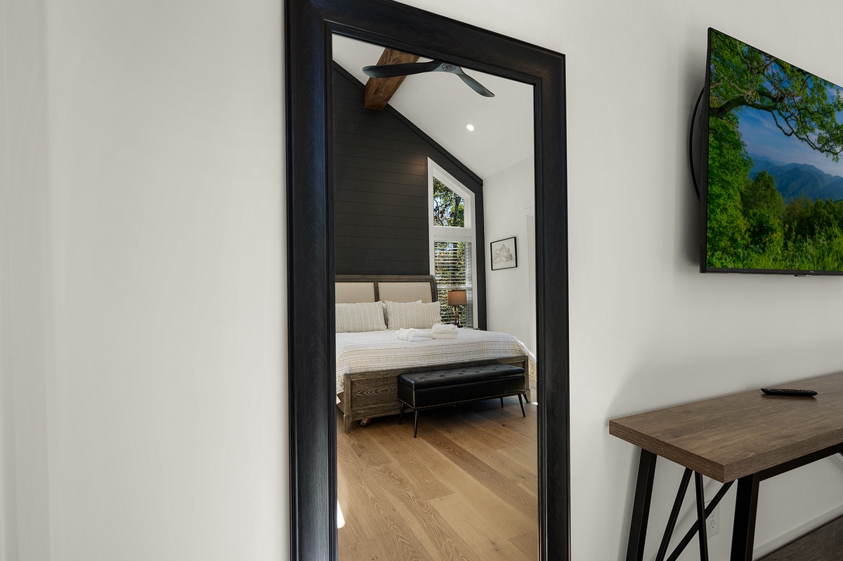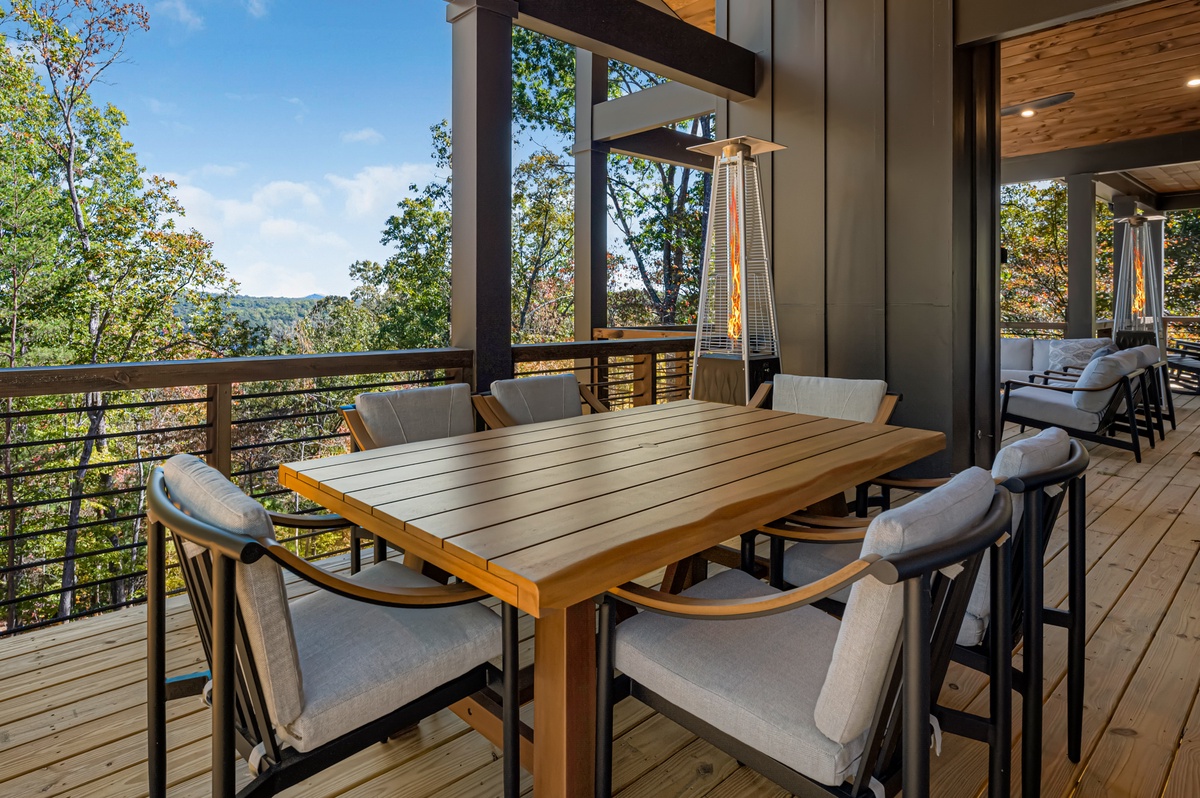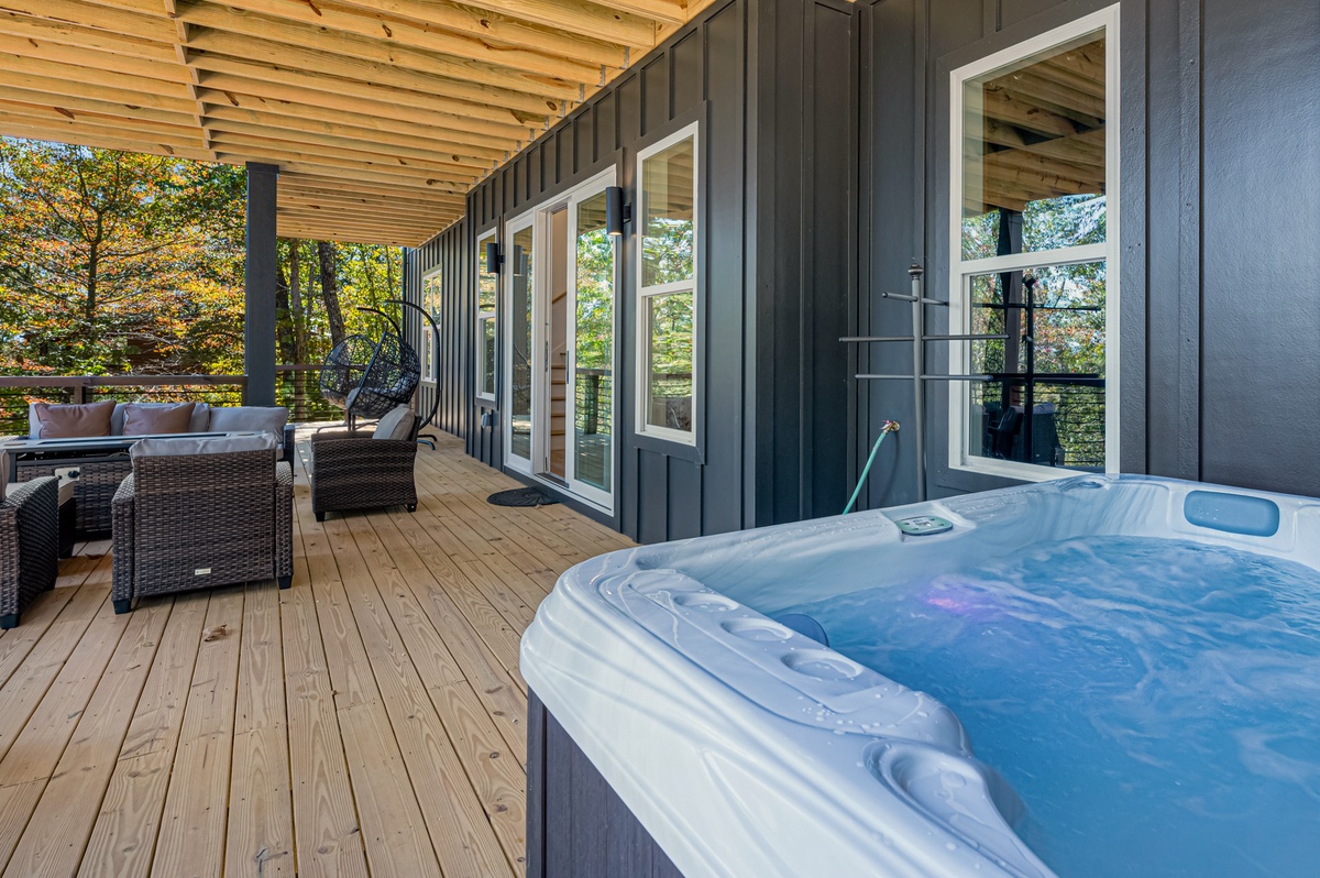 The outdoor spaces are just as inviting. The entry-level deck offers covered outdoor dining for six, complete with a gas fireplace and TV above, perfect for al fresco meals or cozy evenings in front of the fire. Both king suites on the entry level have direct access to this deck, making it easy to step out and take in the breathtaking mountain views. On the lower-level deck, you’ll find a hot tub, gas firepit table with seating, and charming hanging egg basket chairs, creating a serene setting to enjoy the crisp mountain air.
