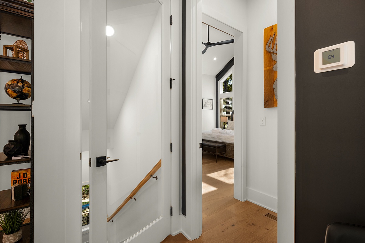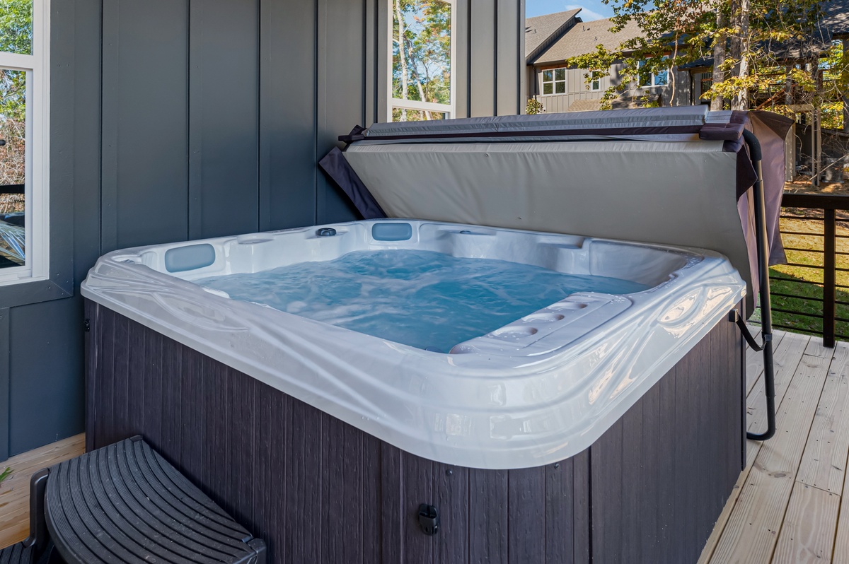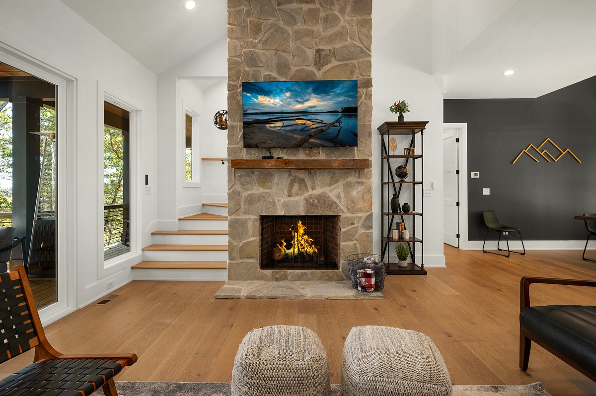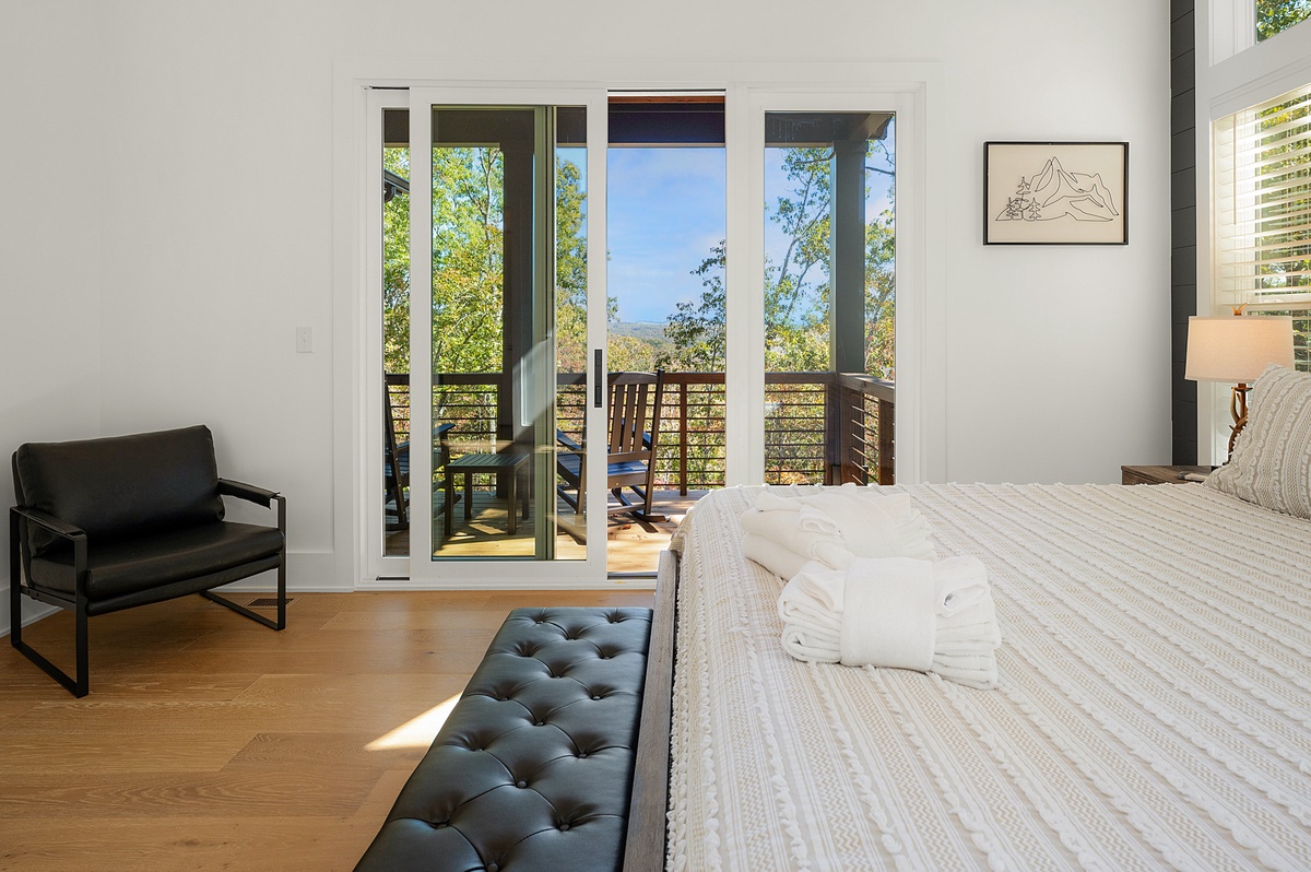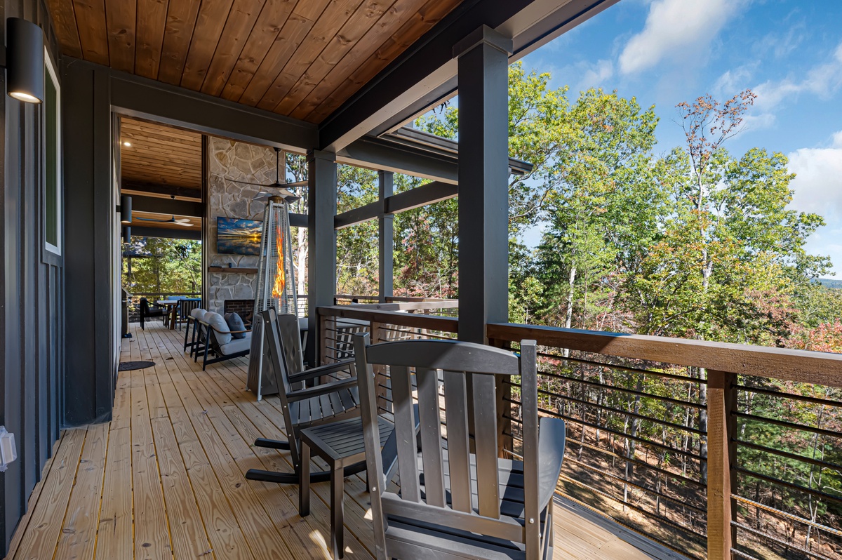 The outdoor spaces are just as inviting. The entry-level deck offers covered outdoor dining for six, complete with a gas fireplace and TV above, perfect for al fresco meals or cozy evenings in front of the fire. Both king suites on the entry level have direct access to this deck, making it easy to step out and take in the breathtaking mountain views. On the lower-level deck, you’ll find a hot tub, gas firepit table with seating, and charming hanging egg basket chairs, creating a serene setting to enjoy the crisp mountain air.