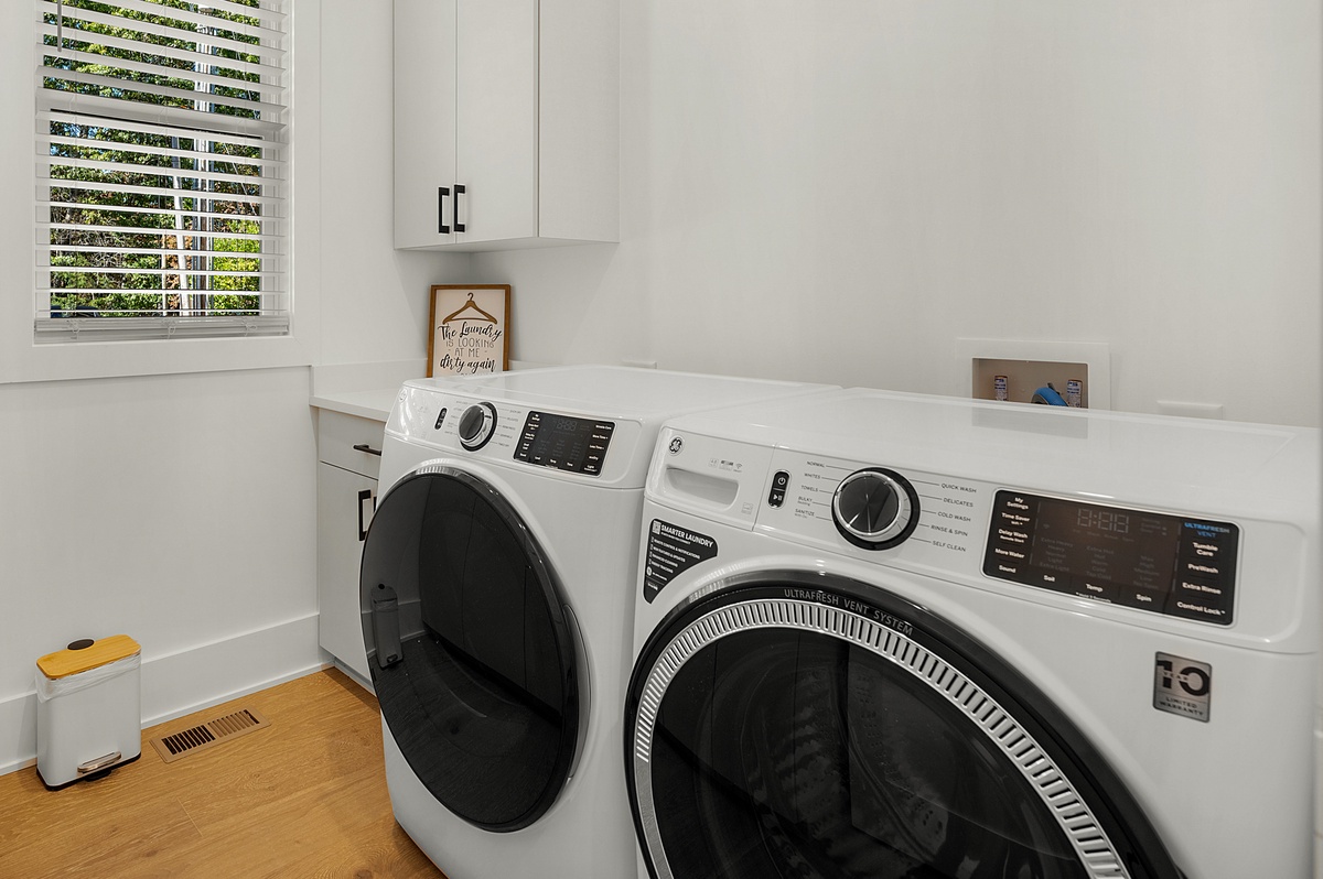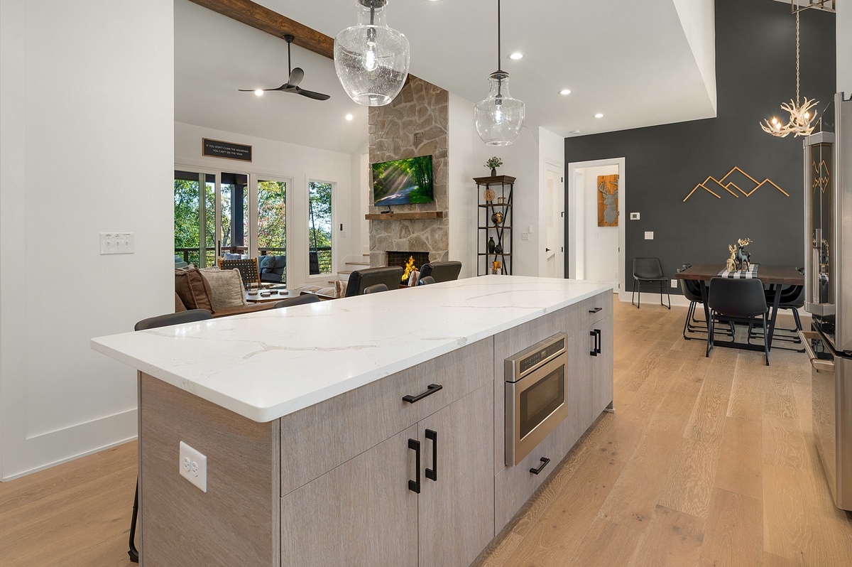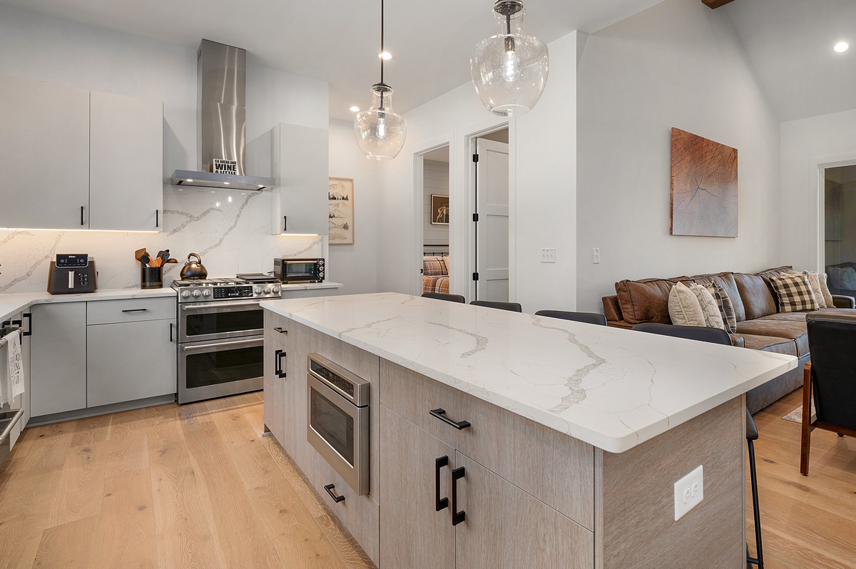 The cabin’s well-equipped kitchen features a double oven, perfect for preparing delicious meals for your group. A separate laundry room on the entry level adds convenience, allowing you to take care of any needs during your stay. The living room on the main level is the heart of the home, centered around a cozy gas fireplace, while the lower-level den offers additional warmth with an electric fireplace, ensuring comfort no matter where you choose to relax