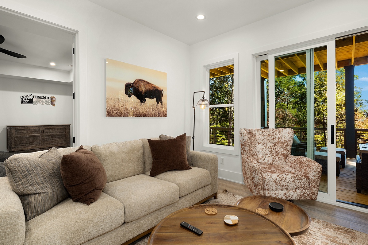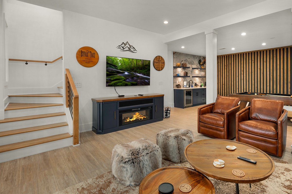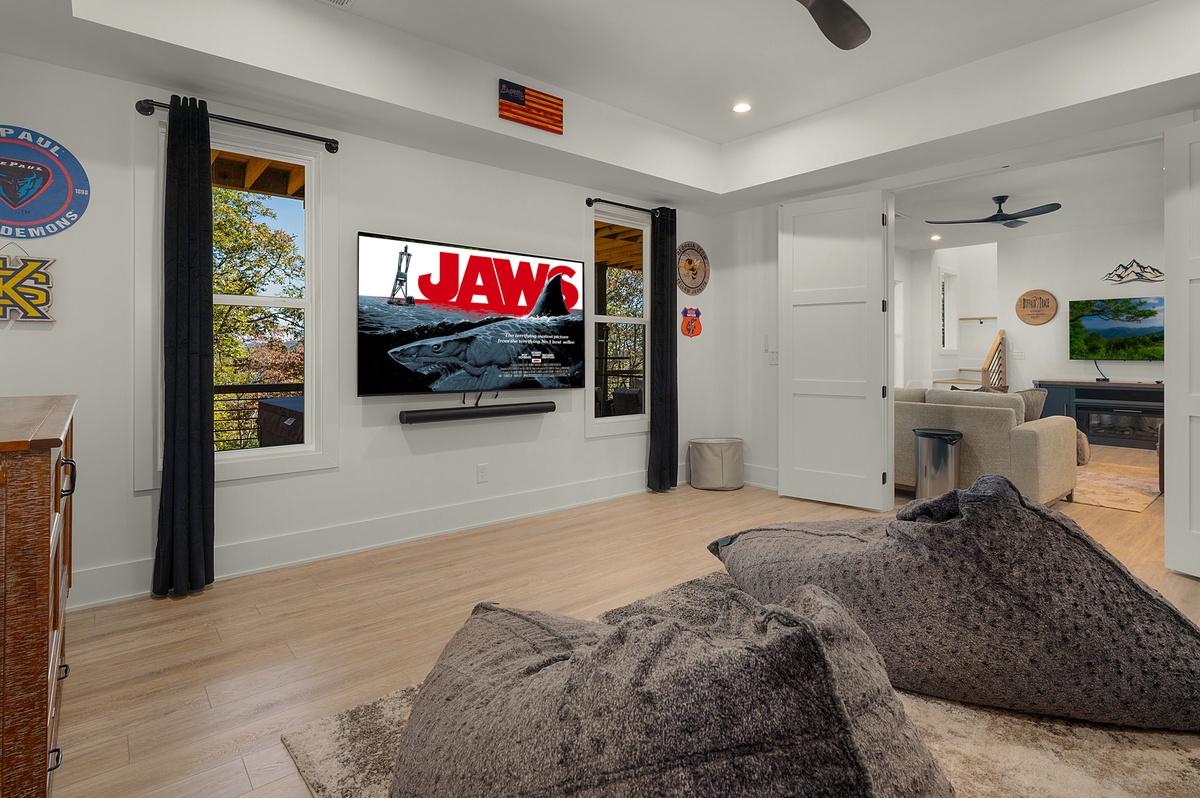 Entertainment is endless in this retreat. With eight streaming-only TVs throughout the property, there’s no shortage of options to unwind. Every bedroom comes equipped with its own TV, while additional viewing spaces include the living room, lower-level den, movie room, and the entry-level deck, where you’ll find a TV perched above the gas fireplace. The dedicated movie room invites you to relax in style with reclining leather seating and oversized bean bag chairs, making it the perfect spot for family movie nights. For those who enjoy games, the lower-level game room features a pool table, wet bar, and a wine cooler, ideal for entertaining guests. And if you need to check in with work, the loft offers a workstation complete with two monitors, ensuring a comfortable and productive workspace.