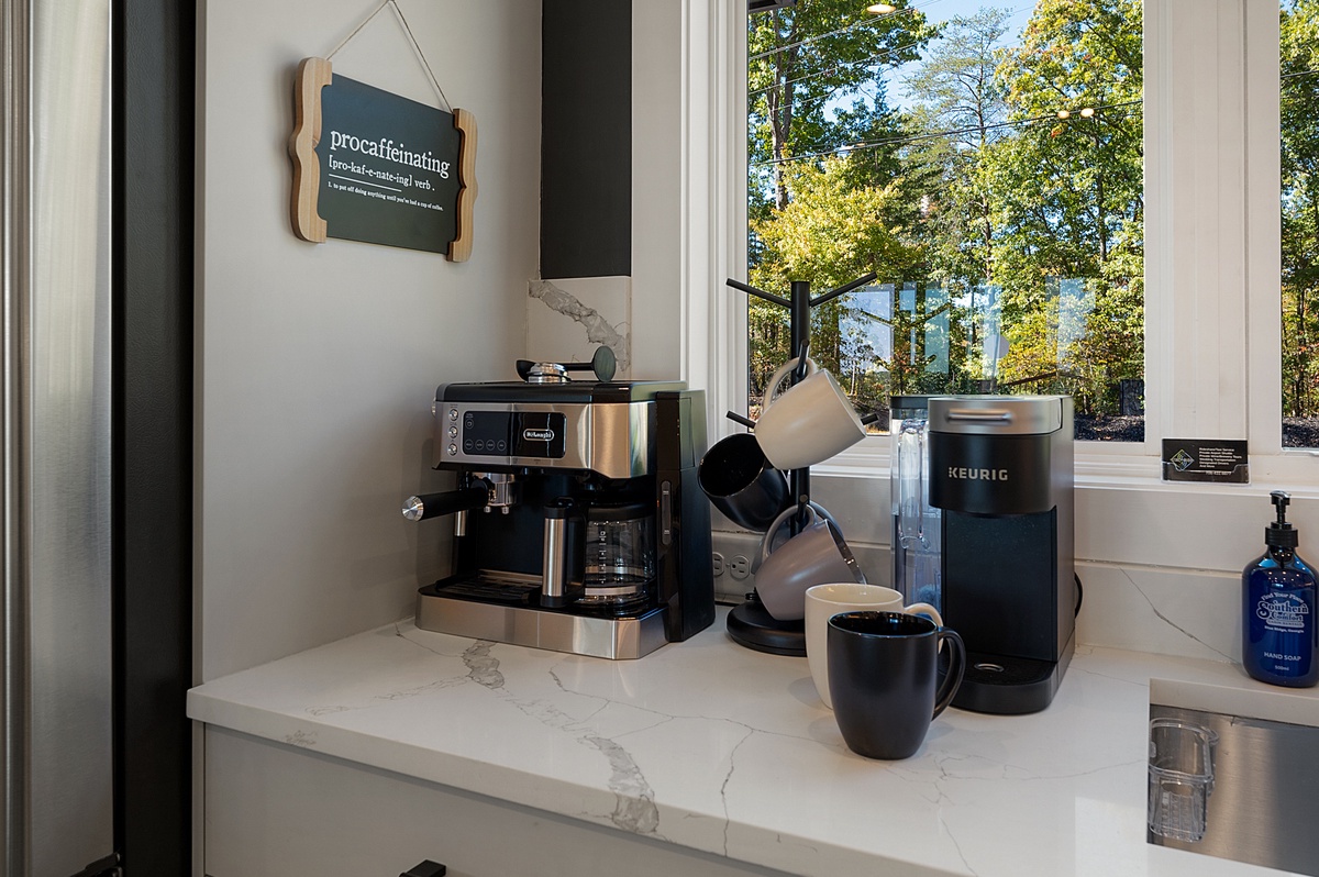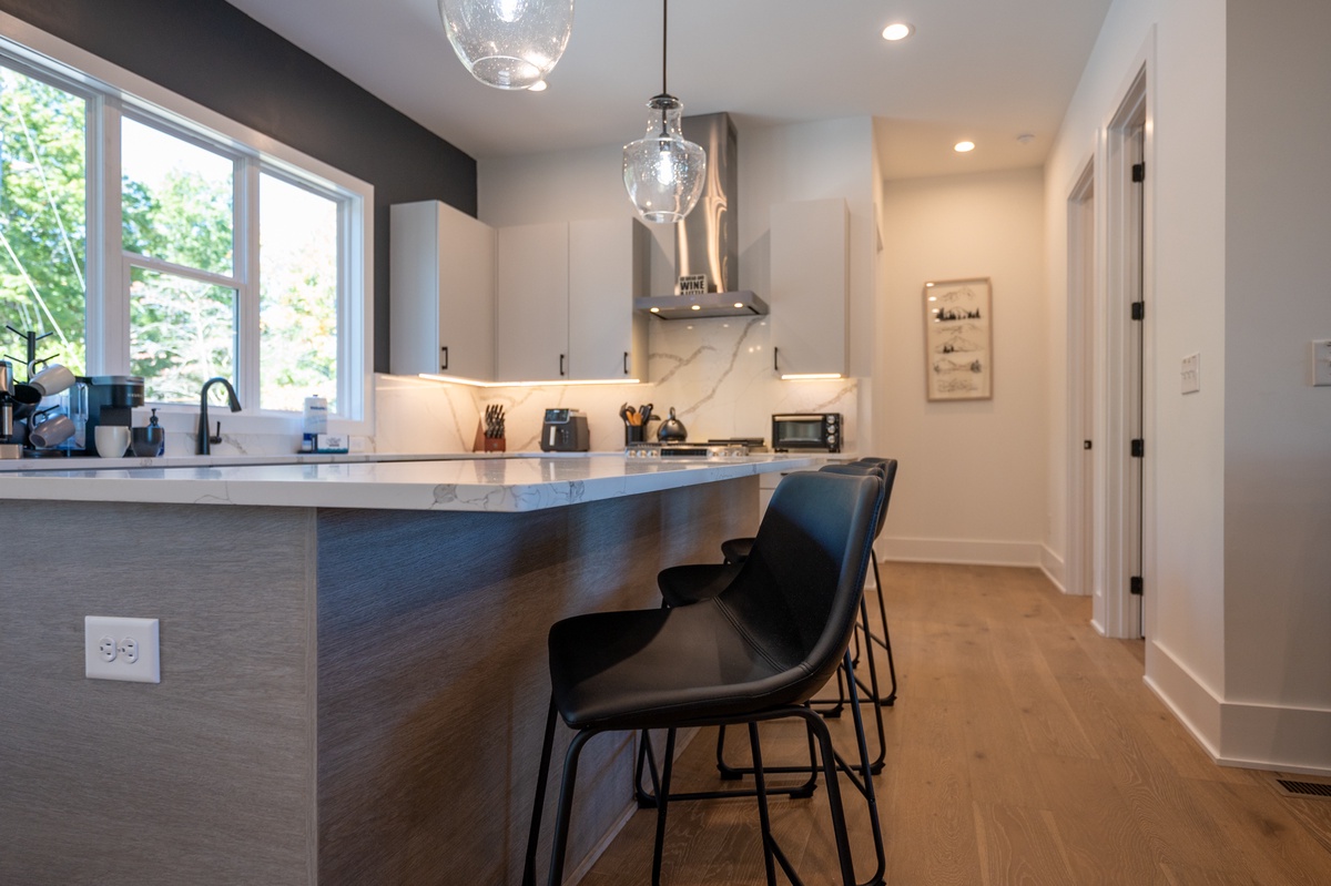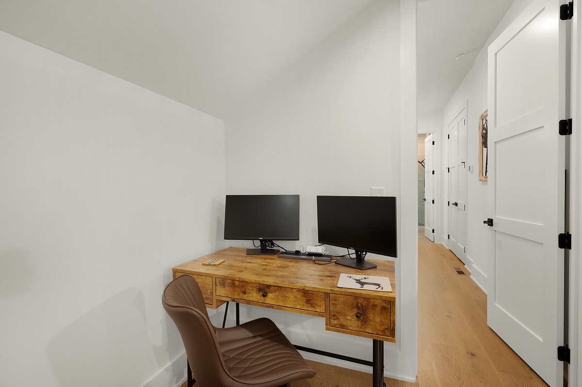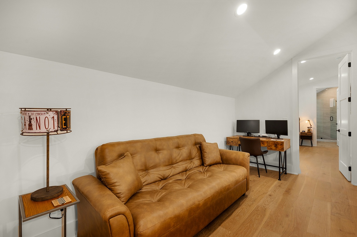 Entertainment is endless in this retreat. With eight streaming-only TVs throughout the property, there’s no shortage of options to unwind. Every bedroom comes equipped with its own TV, while additional viewing spaces include the living room, lower-level den, movie room, and the entry-level deck, where you’ll find a TV perched above the gas fireplace. The dedicated movie room invites you to relax in style with reclining leather seating and oversized bean bag chairs, making it the perfect spot for family movie nights. For those who enjoy games, the lower-level game room features a pool table, wet bar, and a wine cooler, ideal for entertaining guests. And if you need to check in with work, the loft offers a workstation complete with two monitors, ensuring a comfortable and productive workspace.